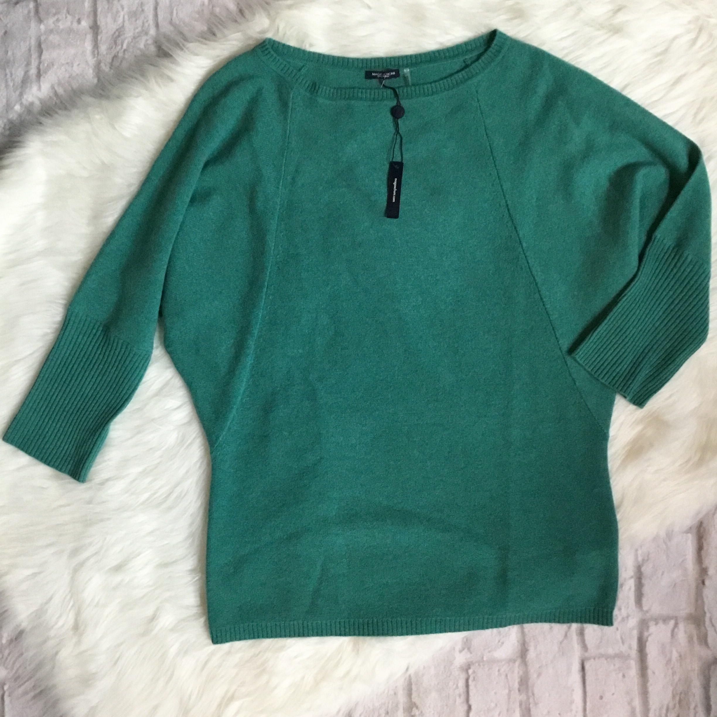 This beautiful green 3/4 sleeve sweater has a looser blousy fit at the top and fitted when it sits around the waist or hips. Perfect with jeans and boots!