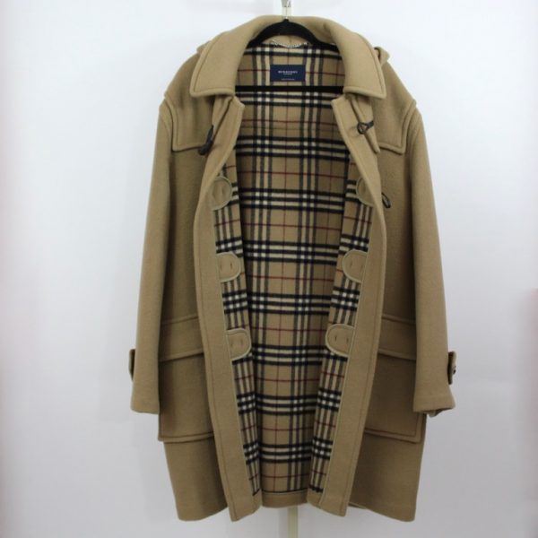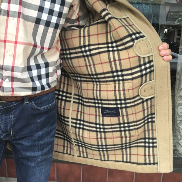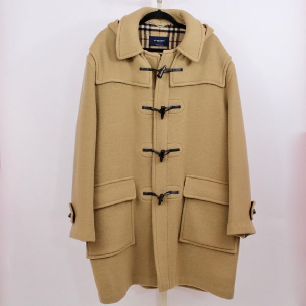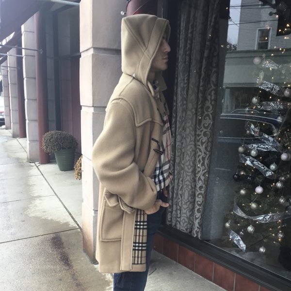 Burberry Men’s wool duffle toggle coat w/hood and nova check interior