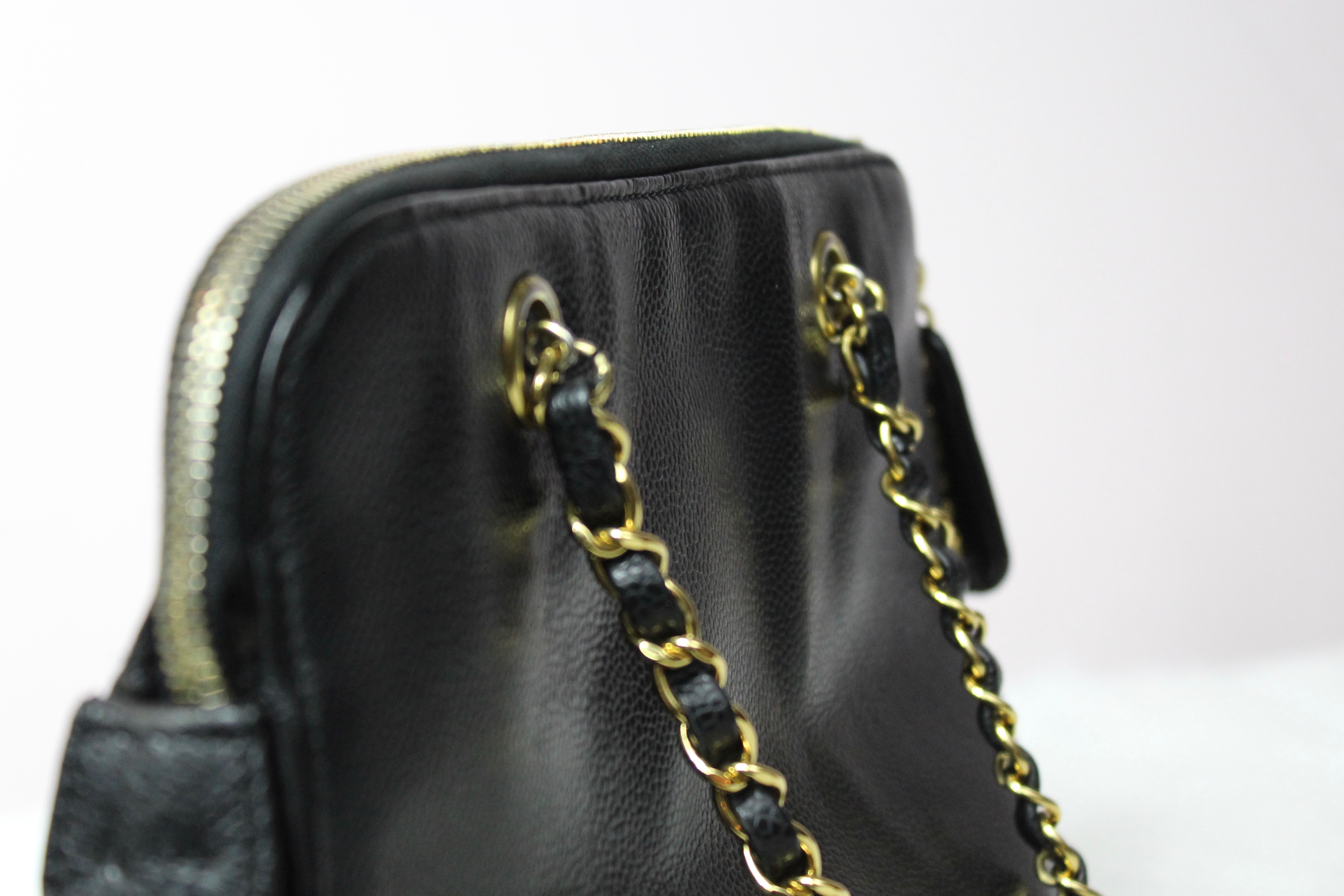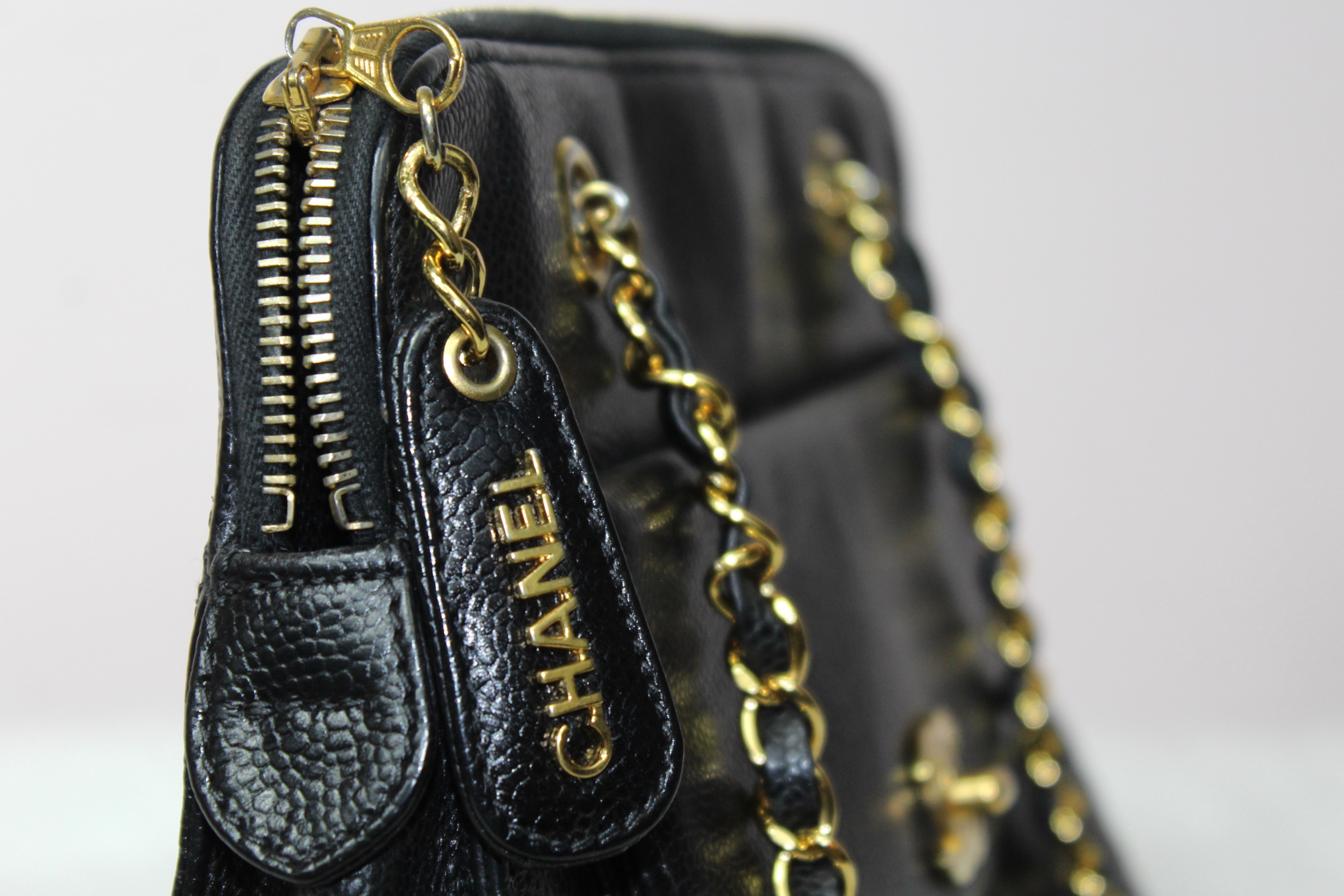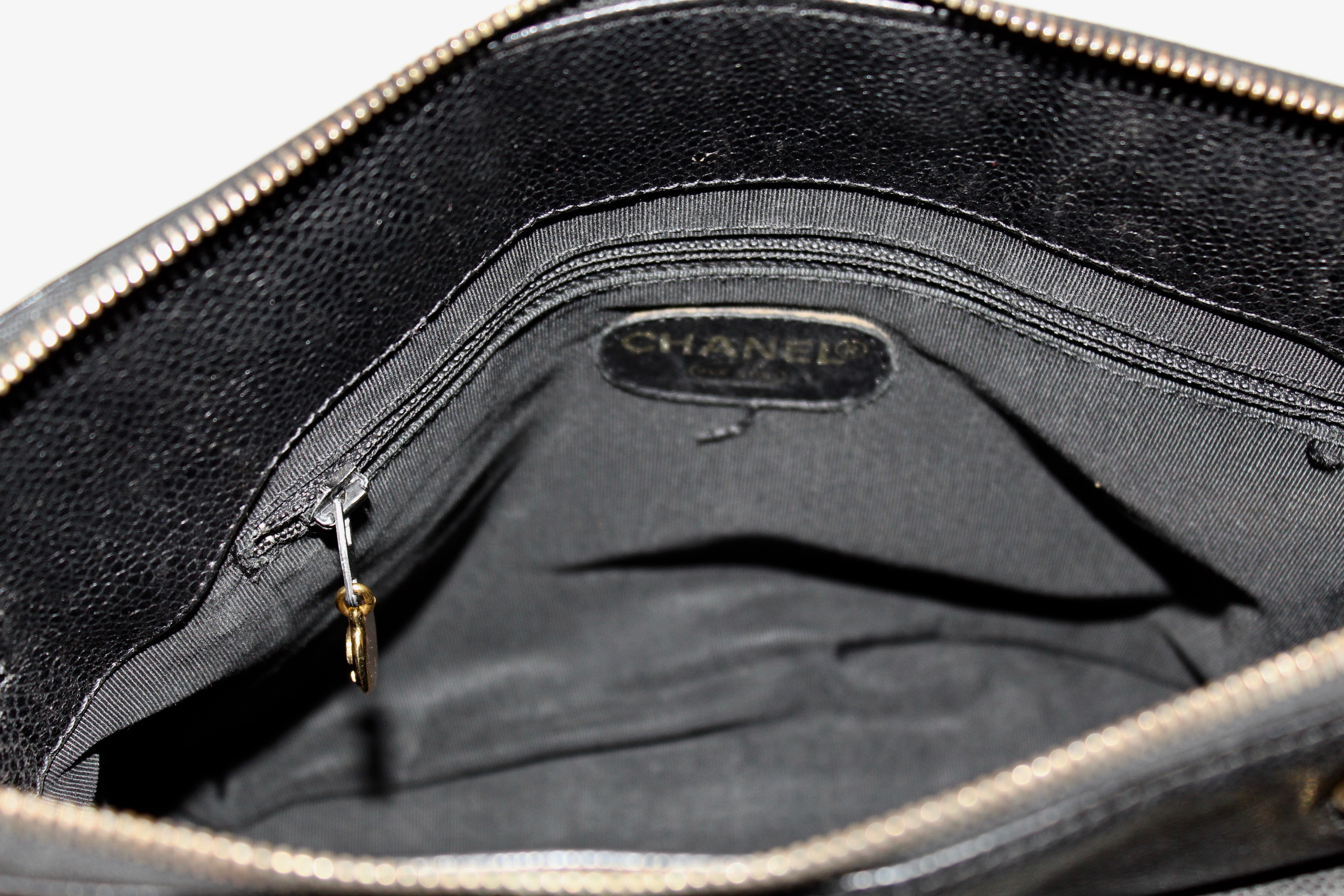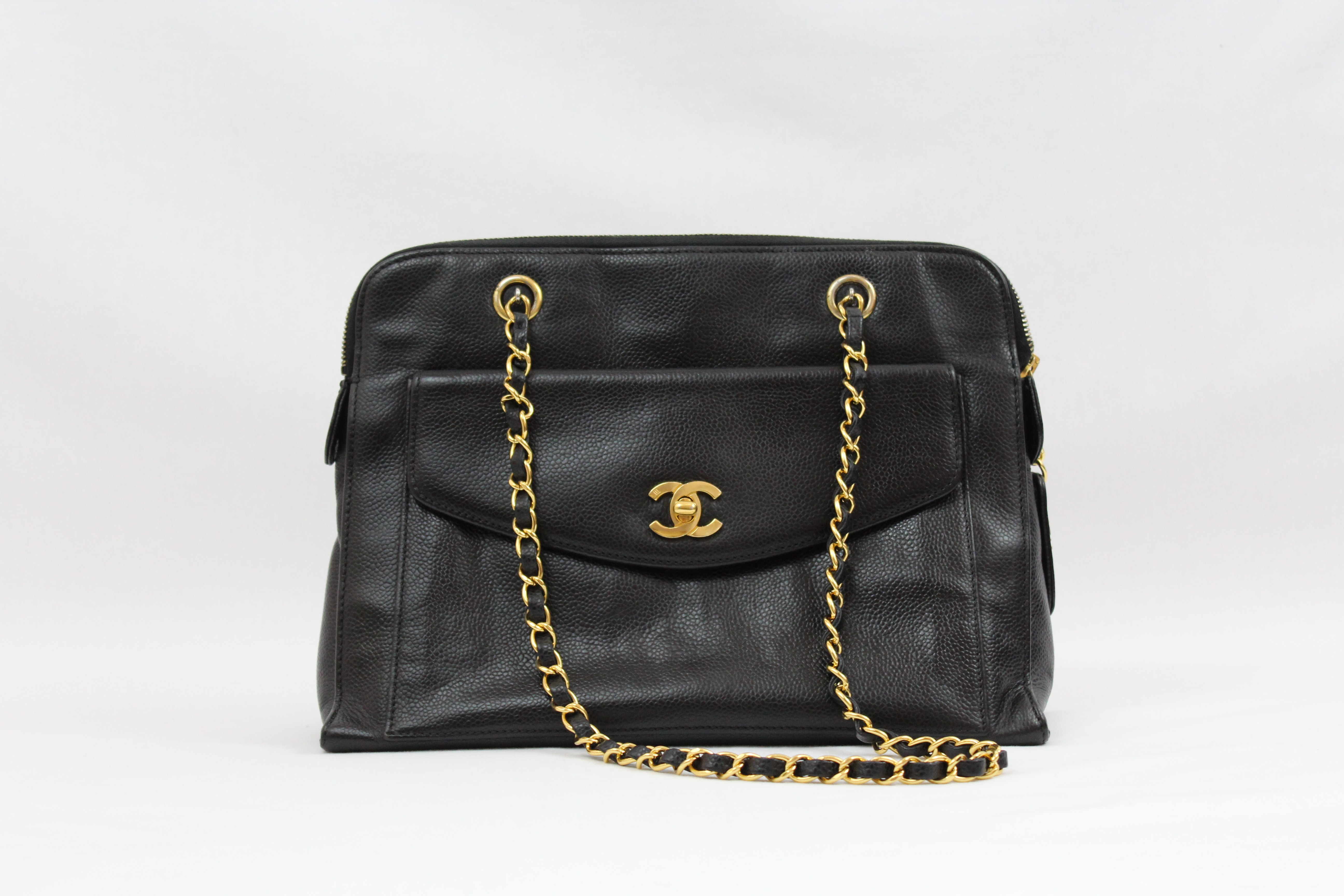 - CLC guarantees the authenticity of this CHANEL black caviar leather shoulder bag or your money back. Timeless and always beautiful, this CHANEL has a matching black lining, with a zippered closure, two interior zippered pockets and one exterior pocket with a gold tone CHANEL CC turn lock closure. The shoulder straps are the classic polished gold chain threaded with black leather.
