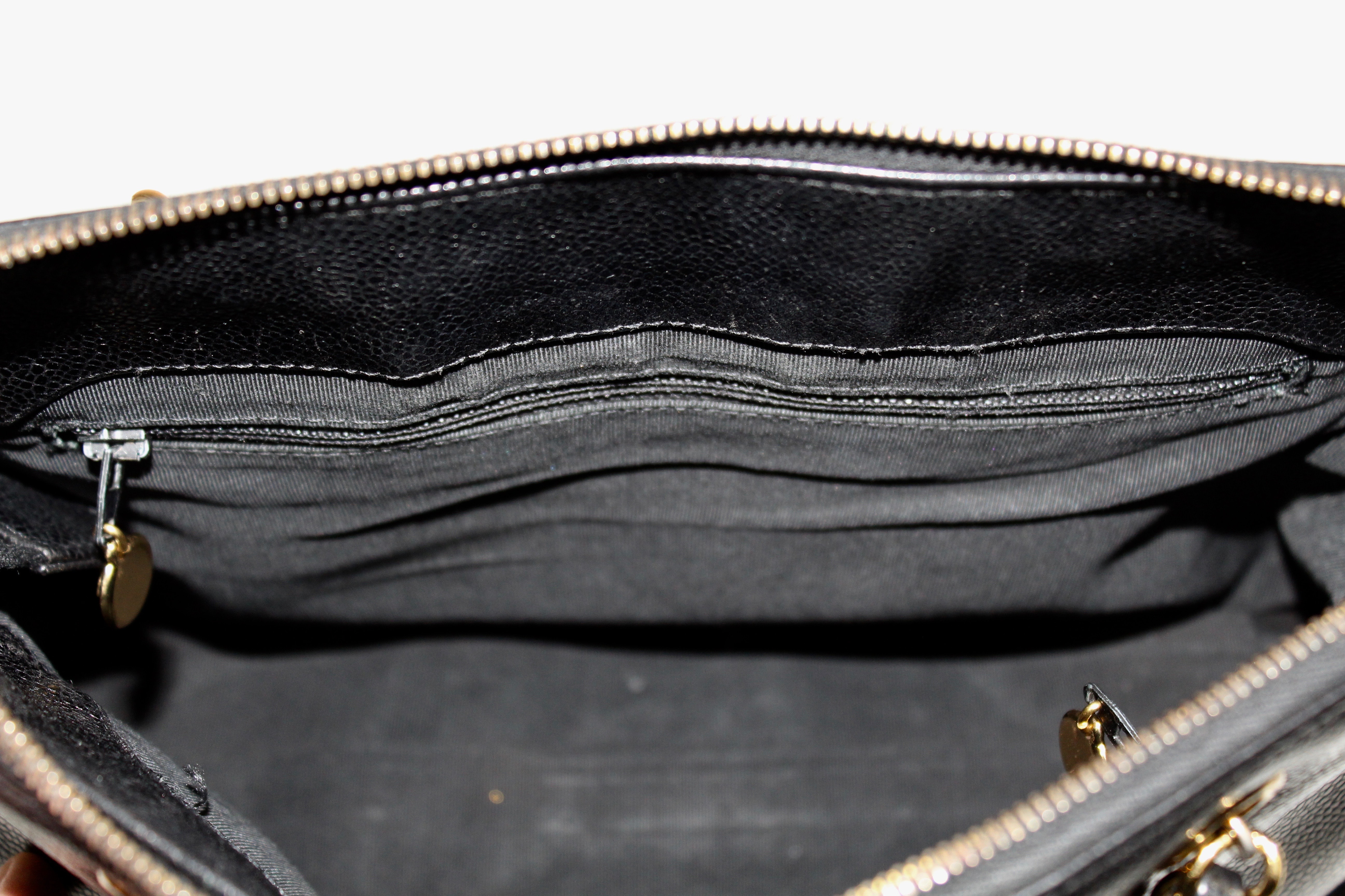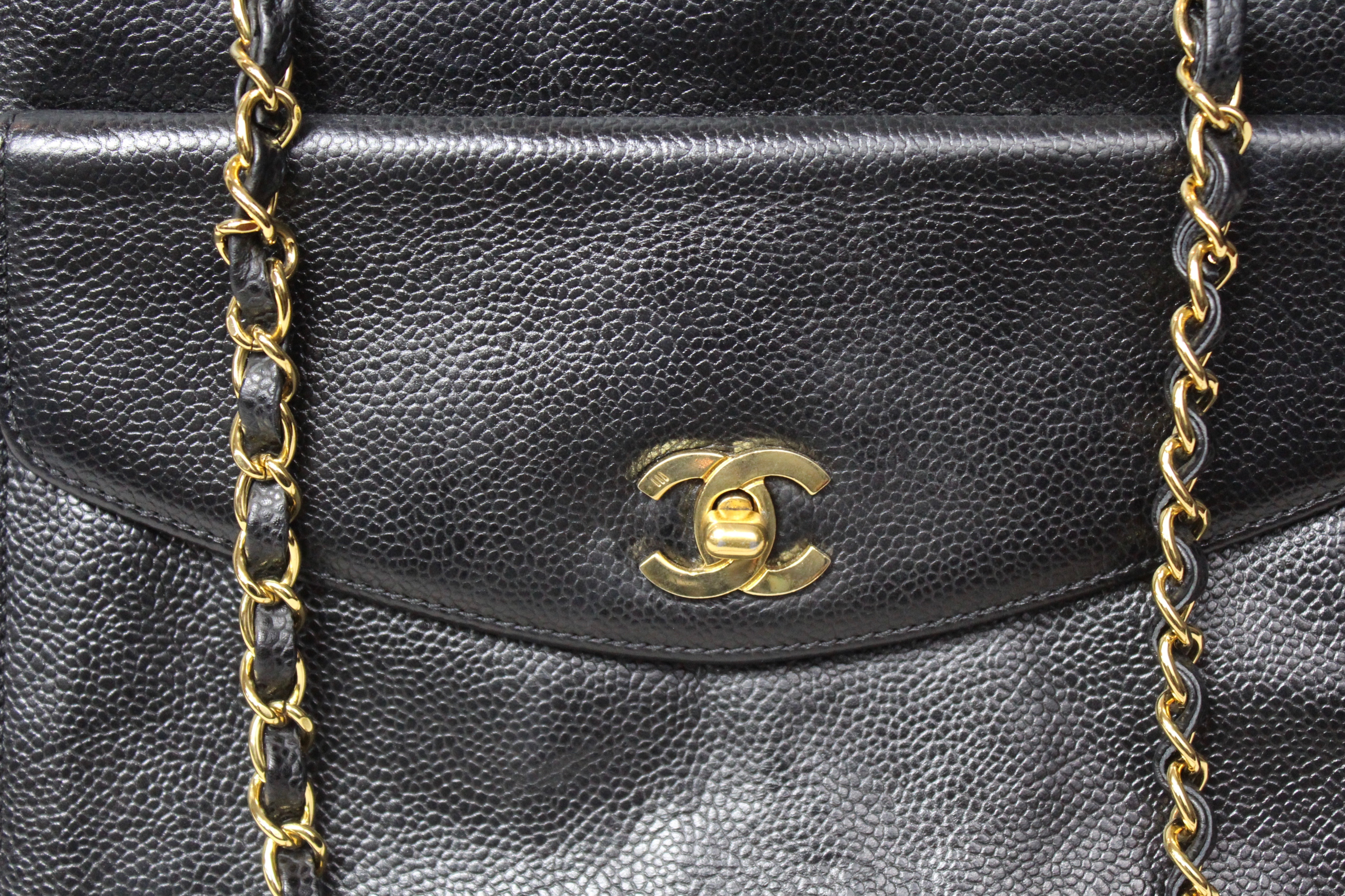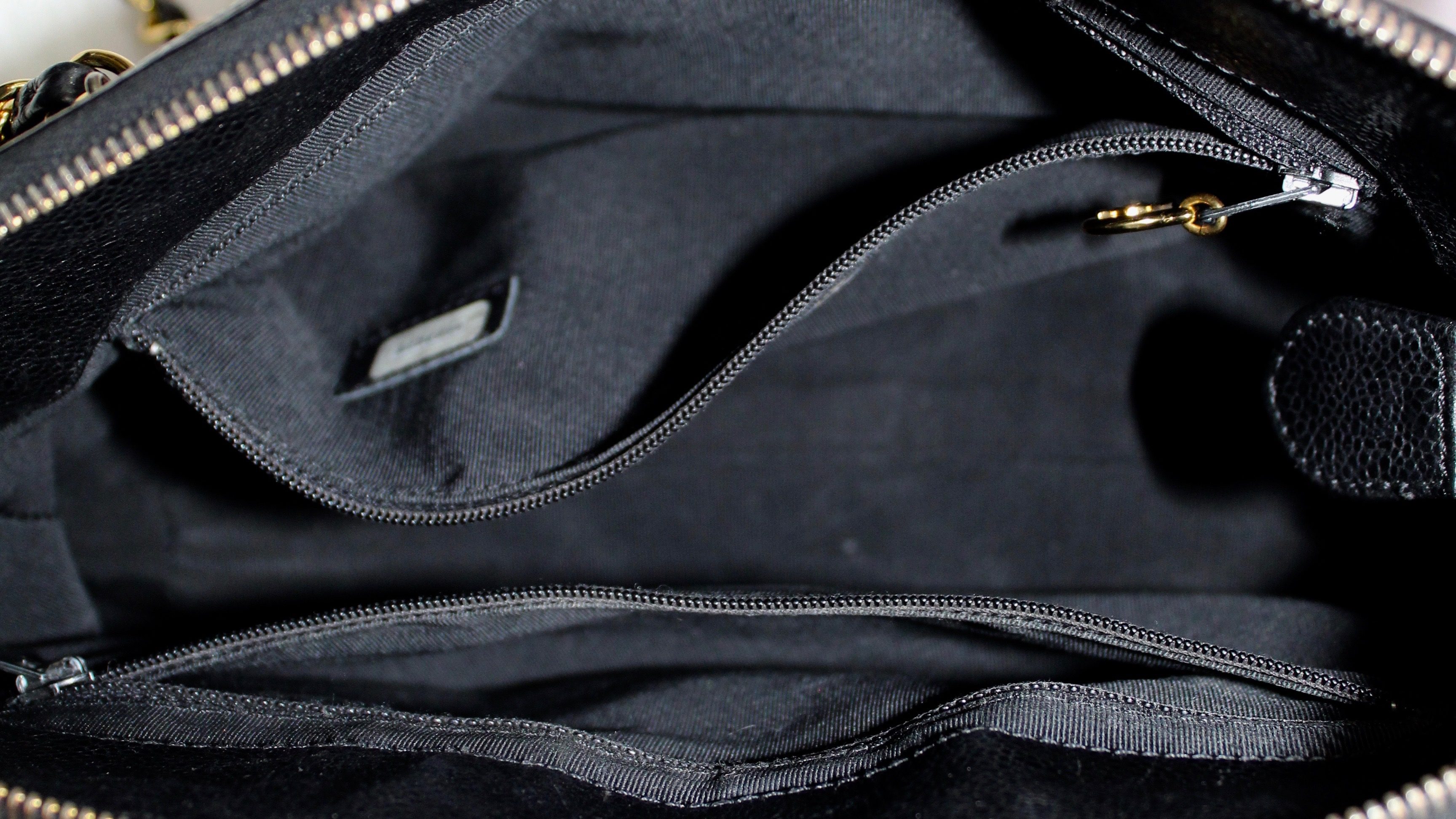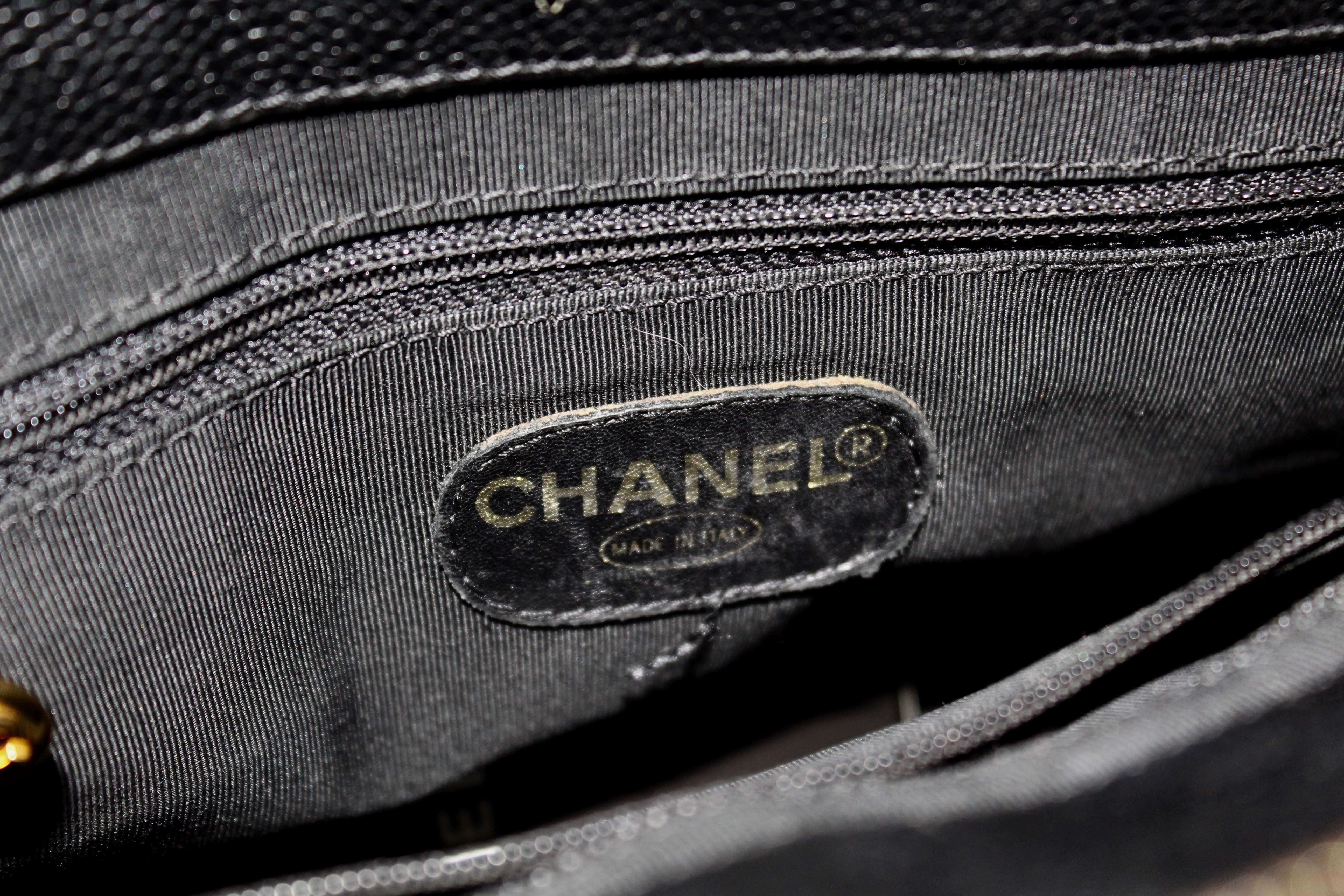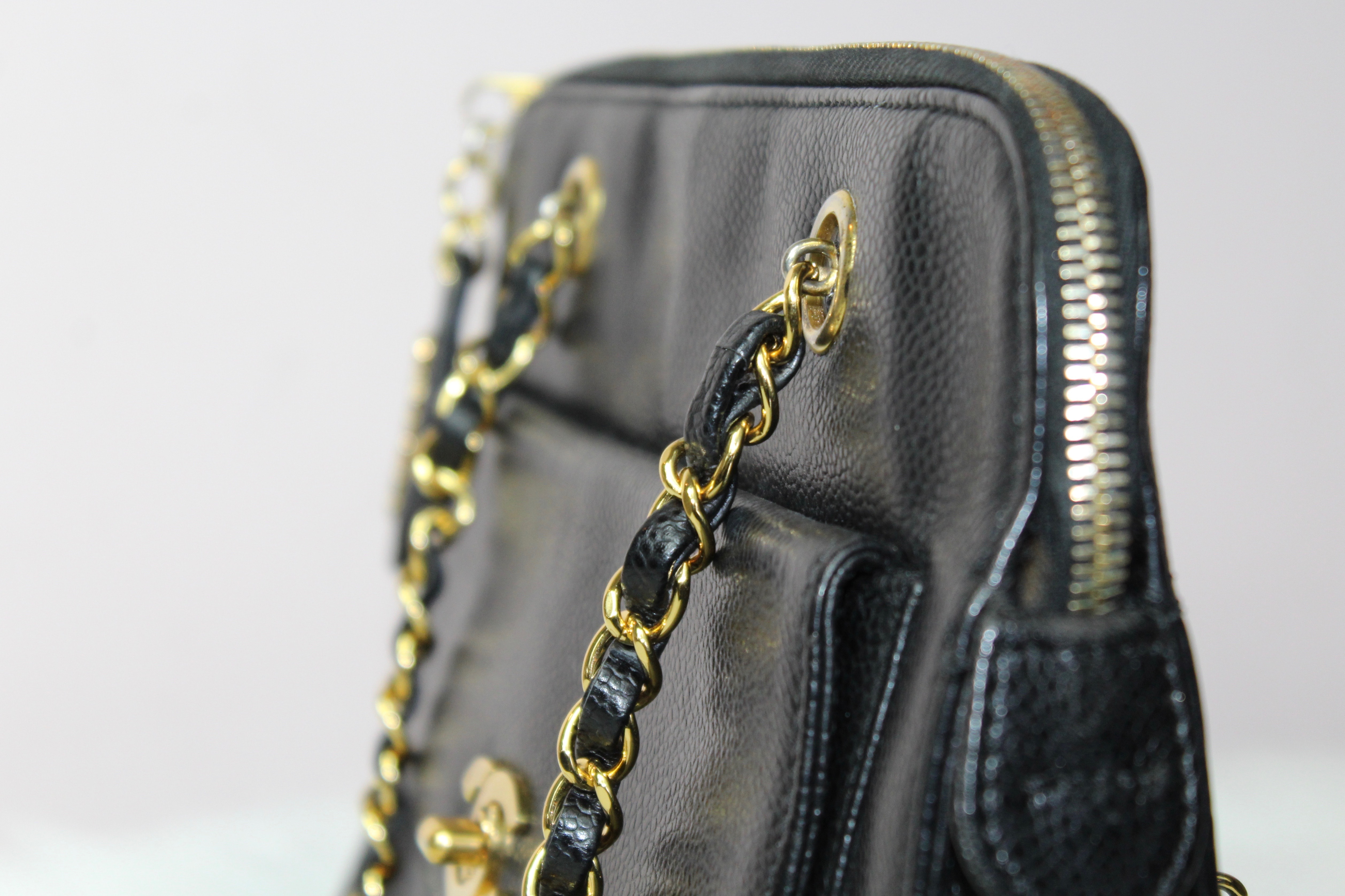 - CLC guarantees the authenticity of this CHANEL black caviar leather shoulder bag or your money back. Timeless and always beautiful, this CHANEL has a matching black lining, with a zippered closure, two interior zippered pockets and one exterior pocket with a gold tone CHANEL CC turn lock closure. The shoulder straps are the classic polished gold chain threaded with black leather.