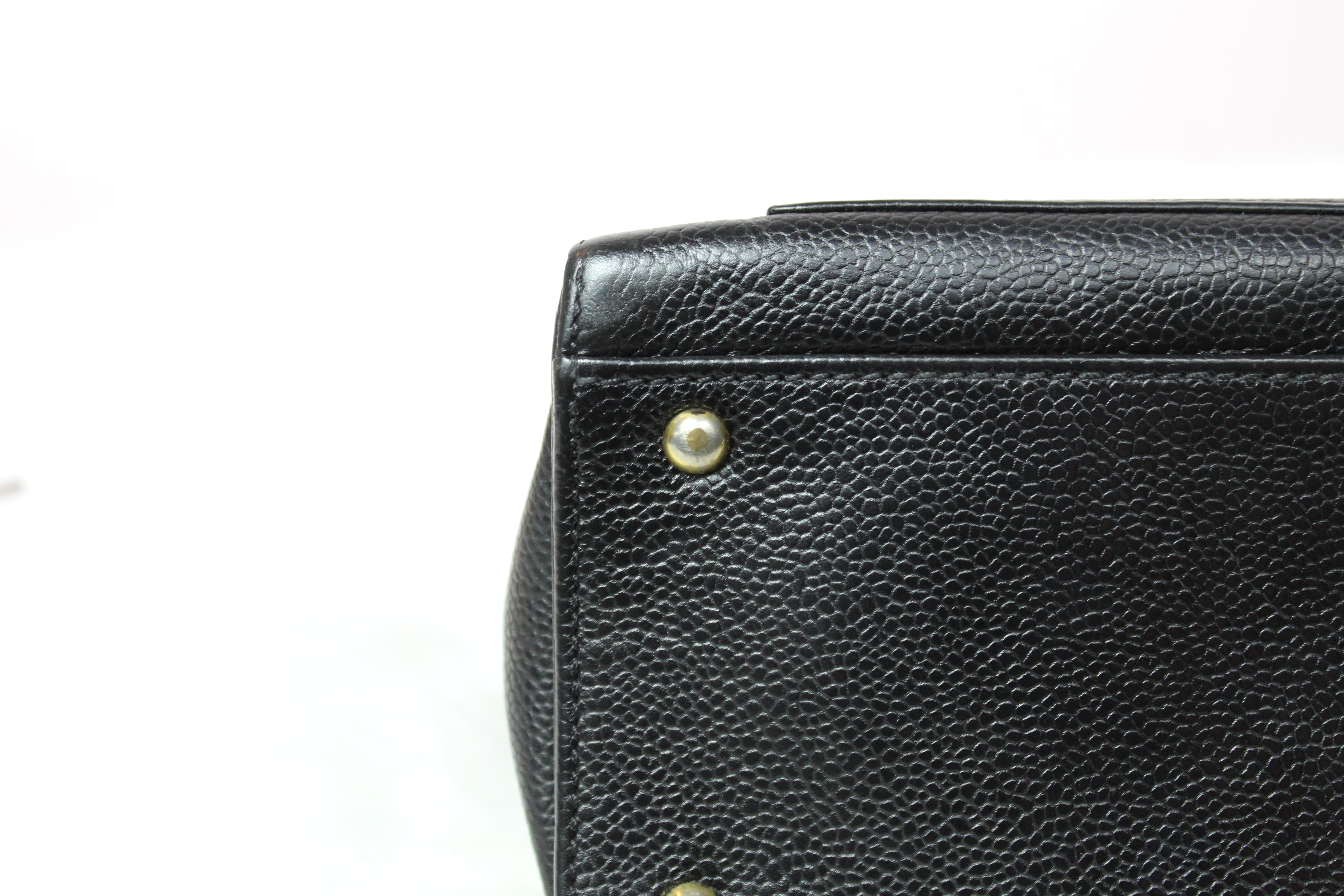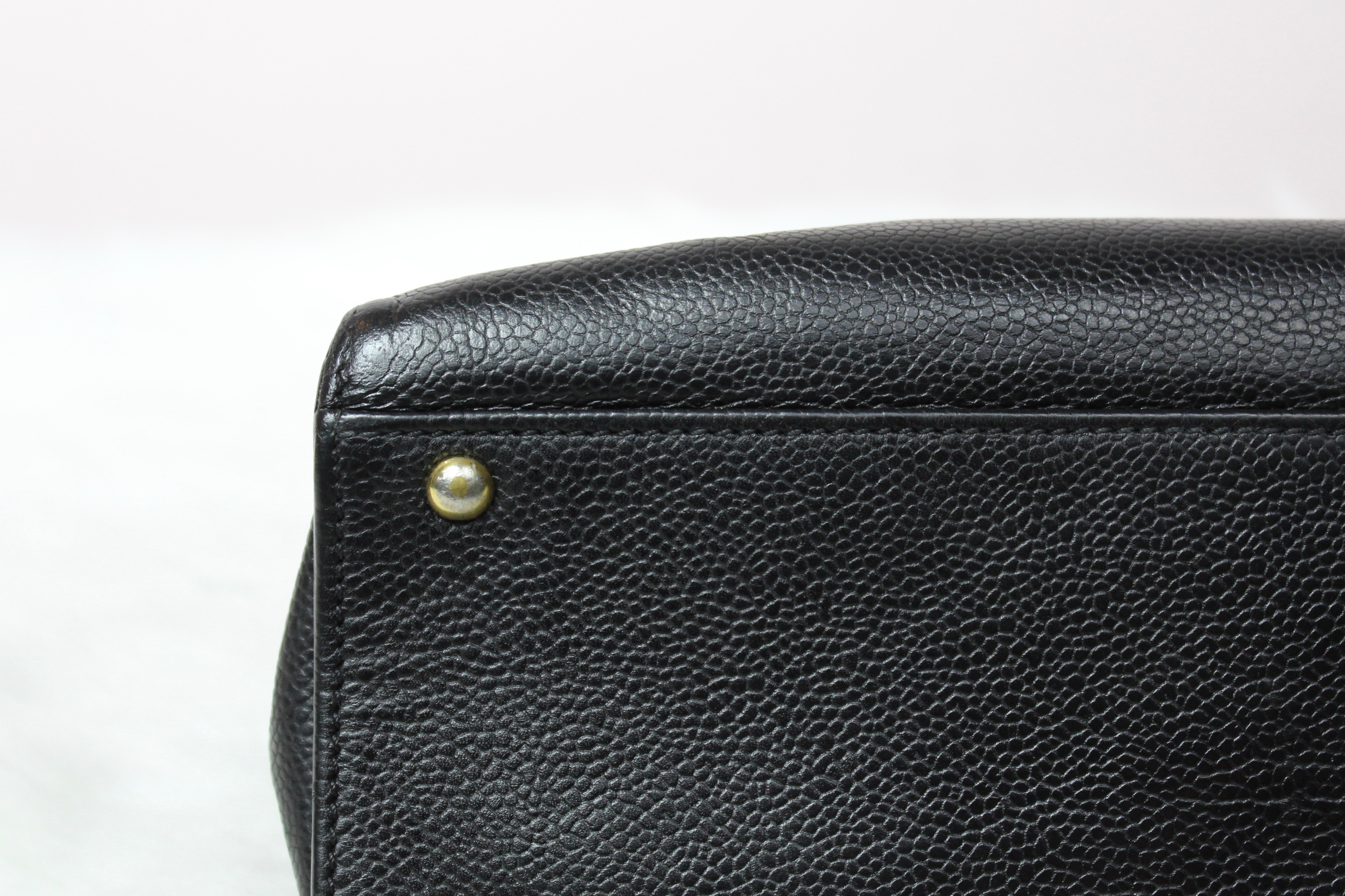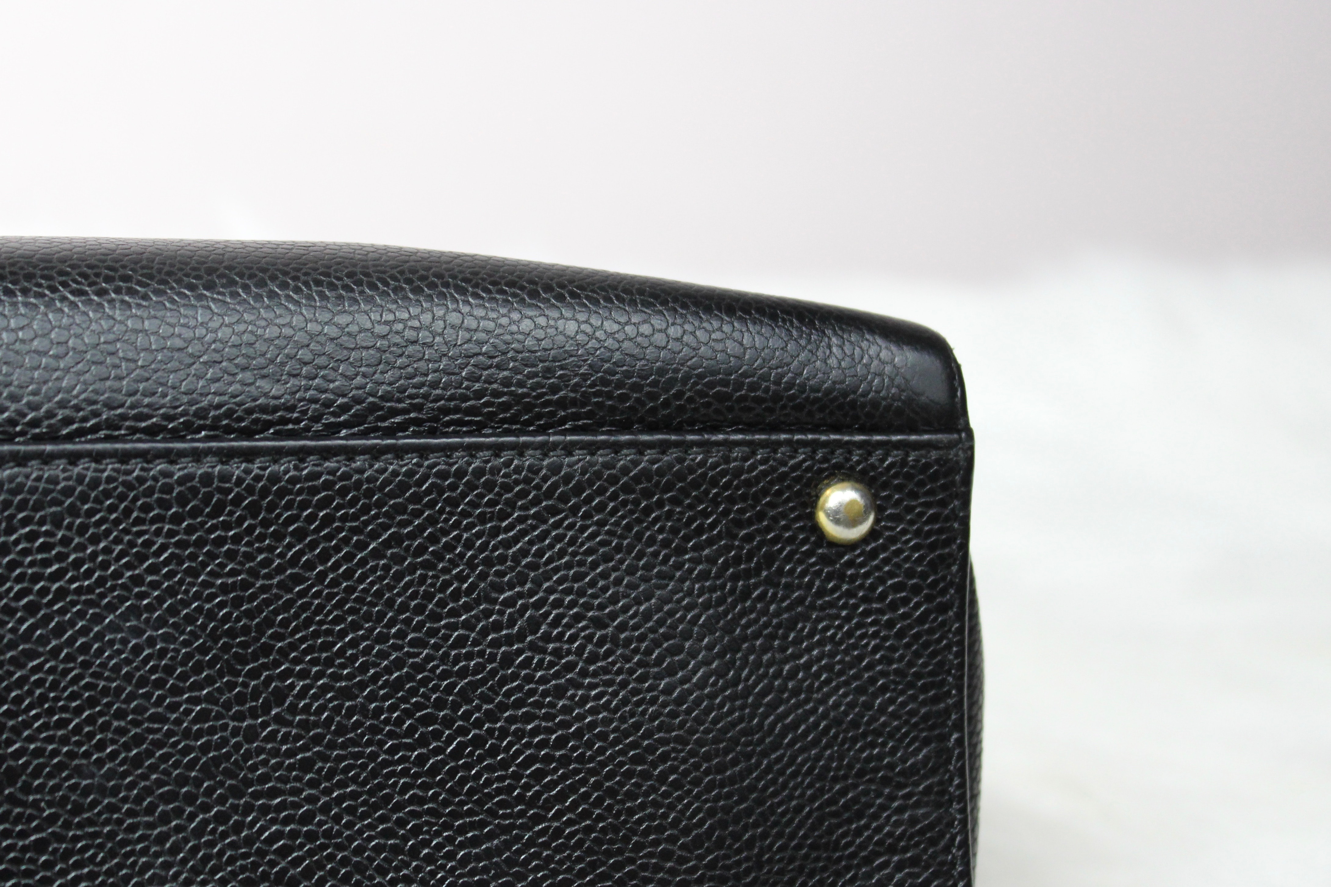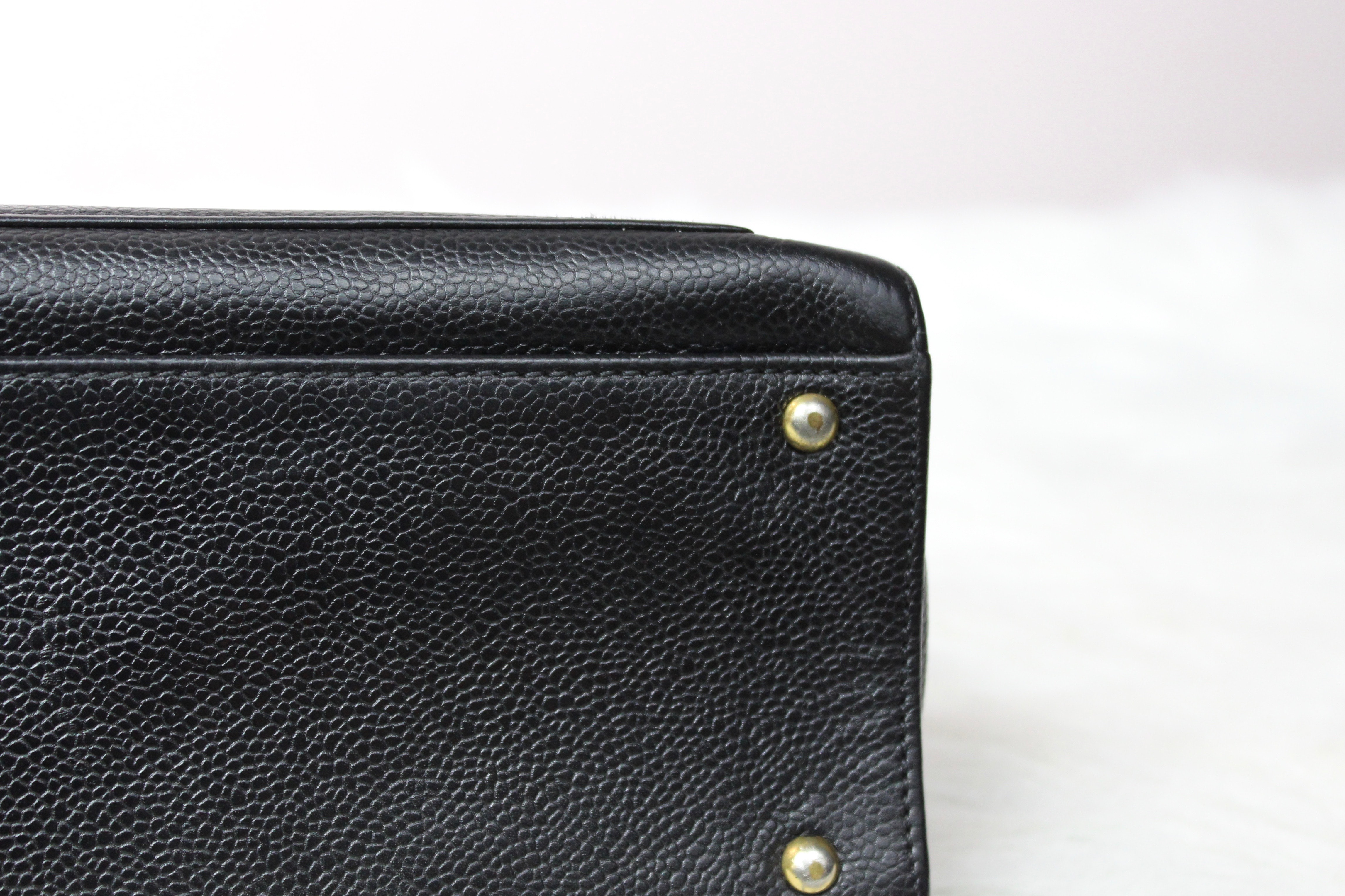 - CLC guarantees the authenticity of this CHANEL black caviar leather shoulder bag or your money back. Timeless and always beautiful, this CHANEL has a matching black lining, with a zippered closure, two interior zippered pockets and one exterior pocket with a gold tone CHANEL CC turn lock closure. The shoulder straps are the classic polished gold chain threaded with black leather.