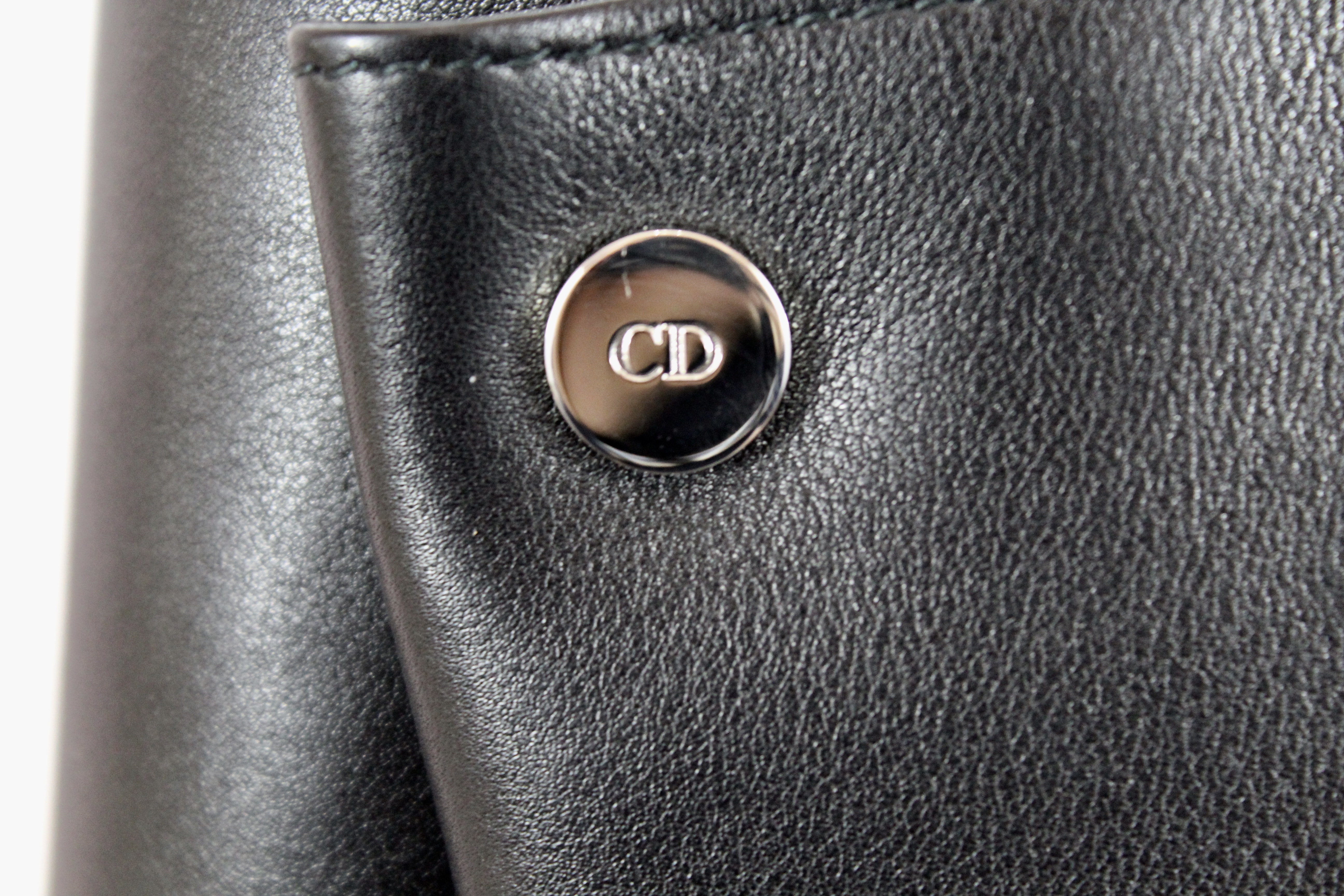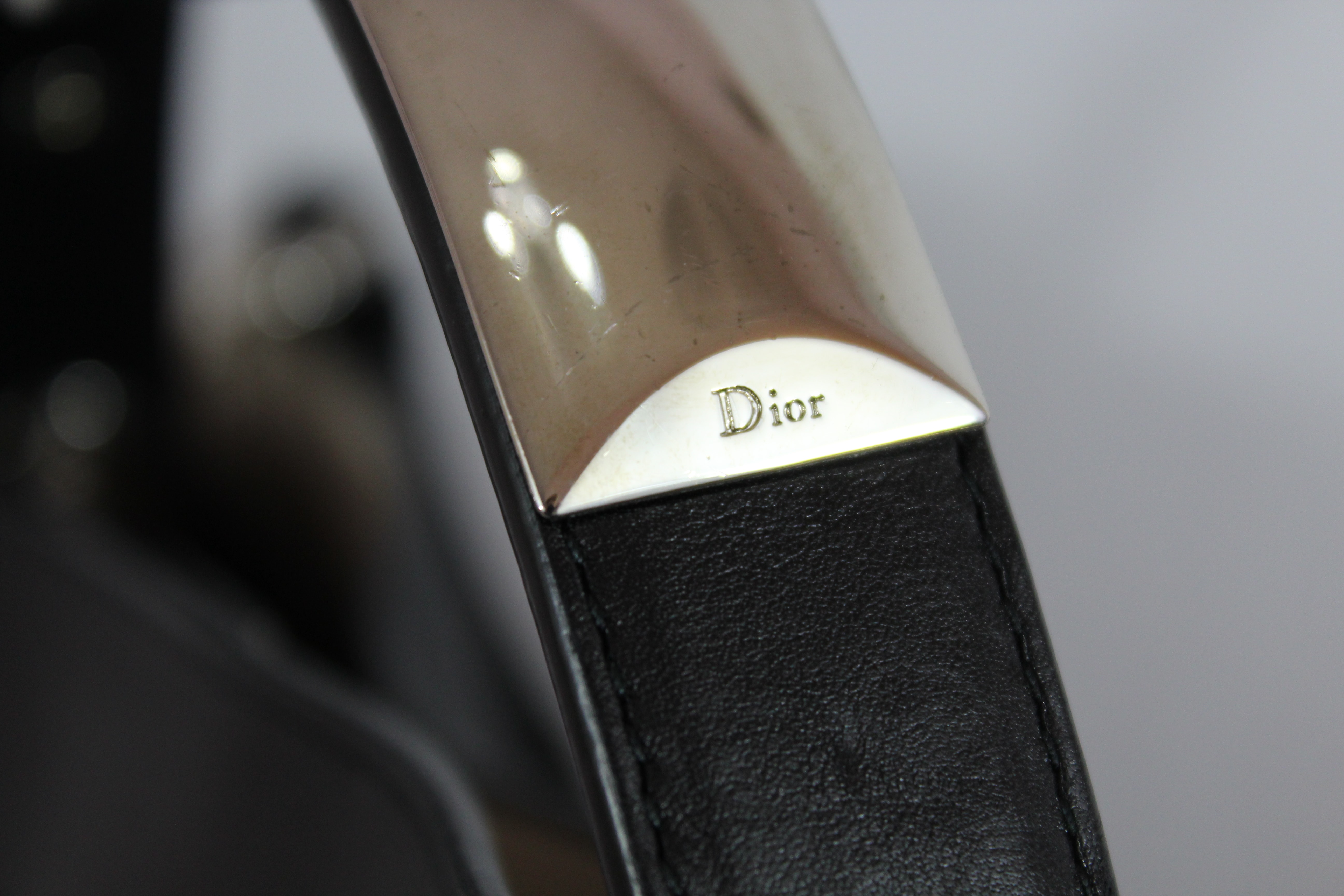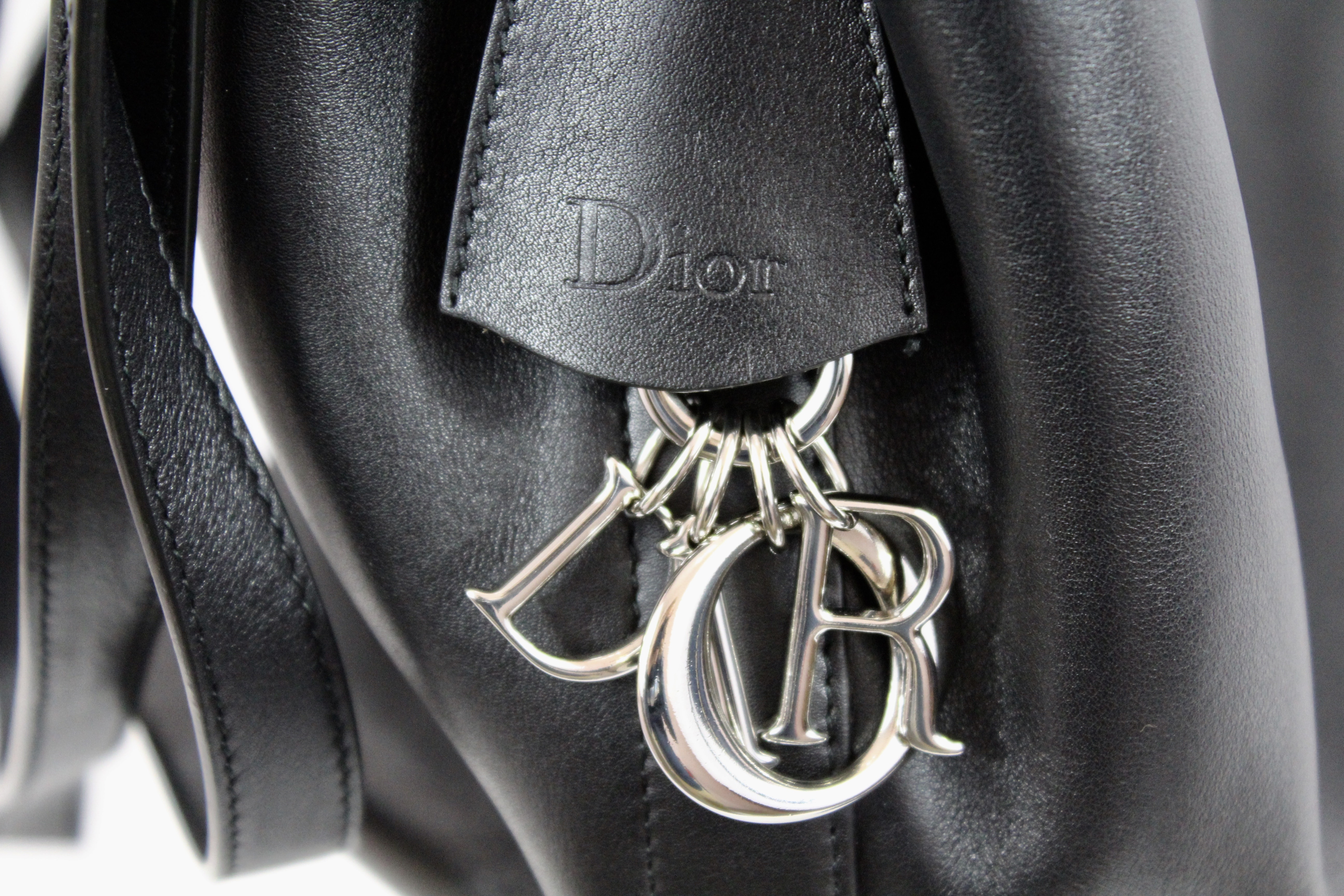 This beautiful Diorific bucket bag has an all black smooth leather exterior and a cream leather interior. It has a silver-tone top handle and hardware, and a Dior logo charm in a clochette. The perfect bag to carry everyday and the matching wristlet keeps the little things in order.