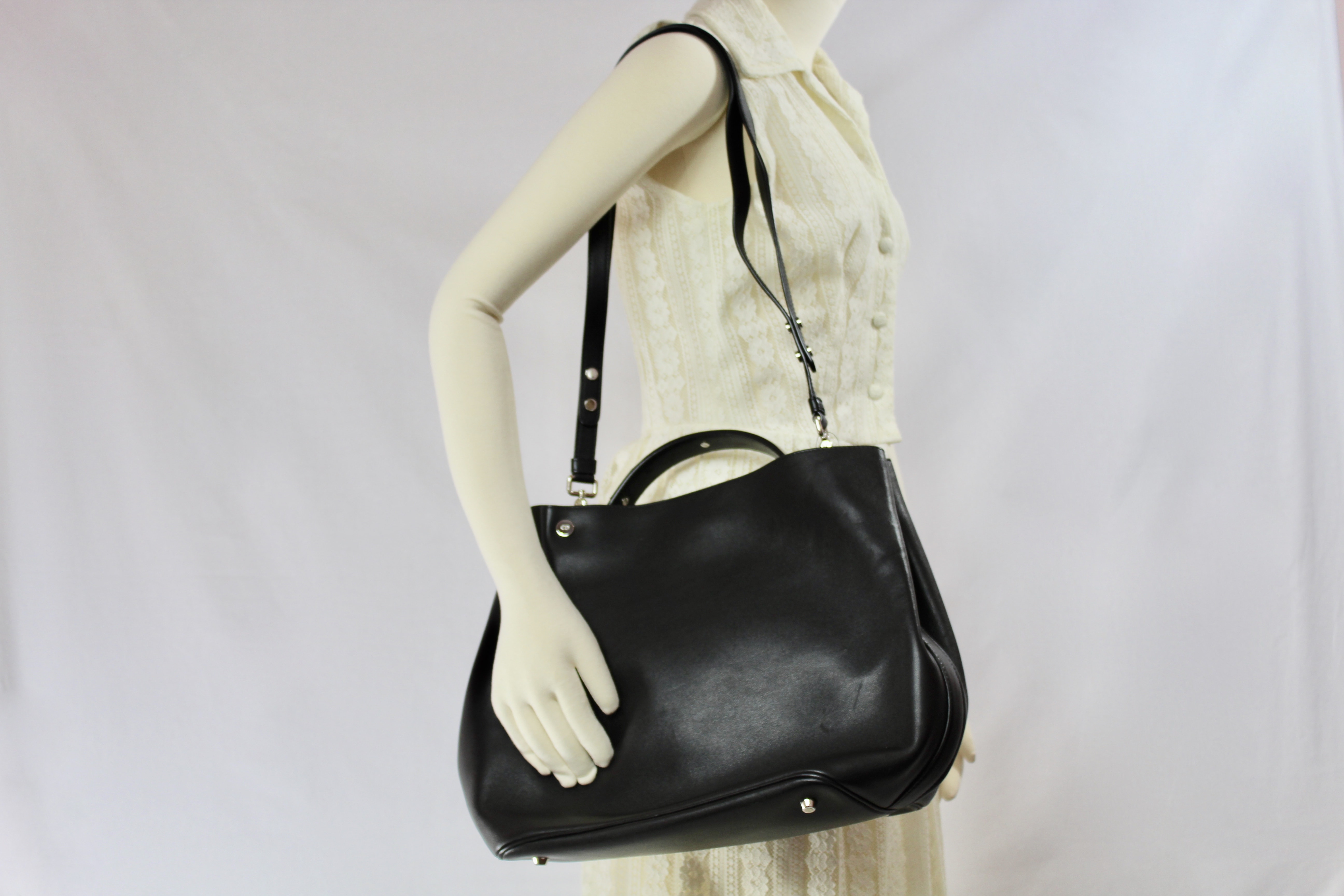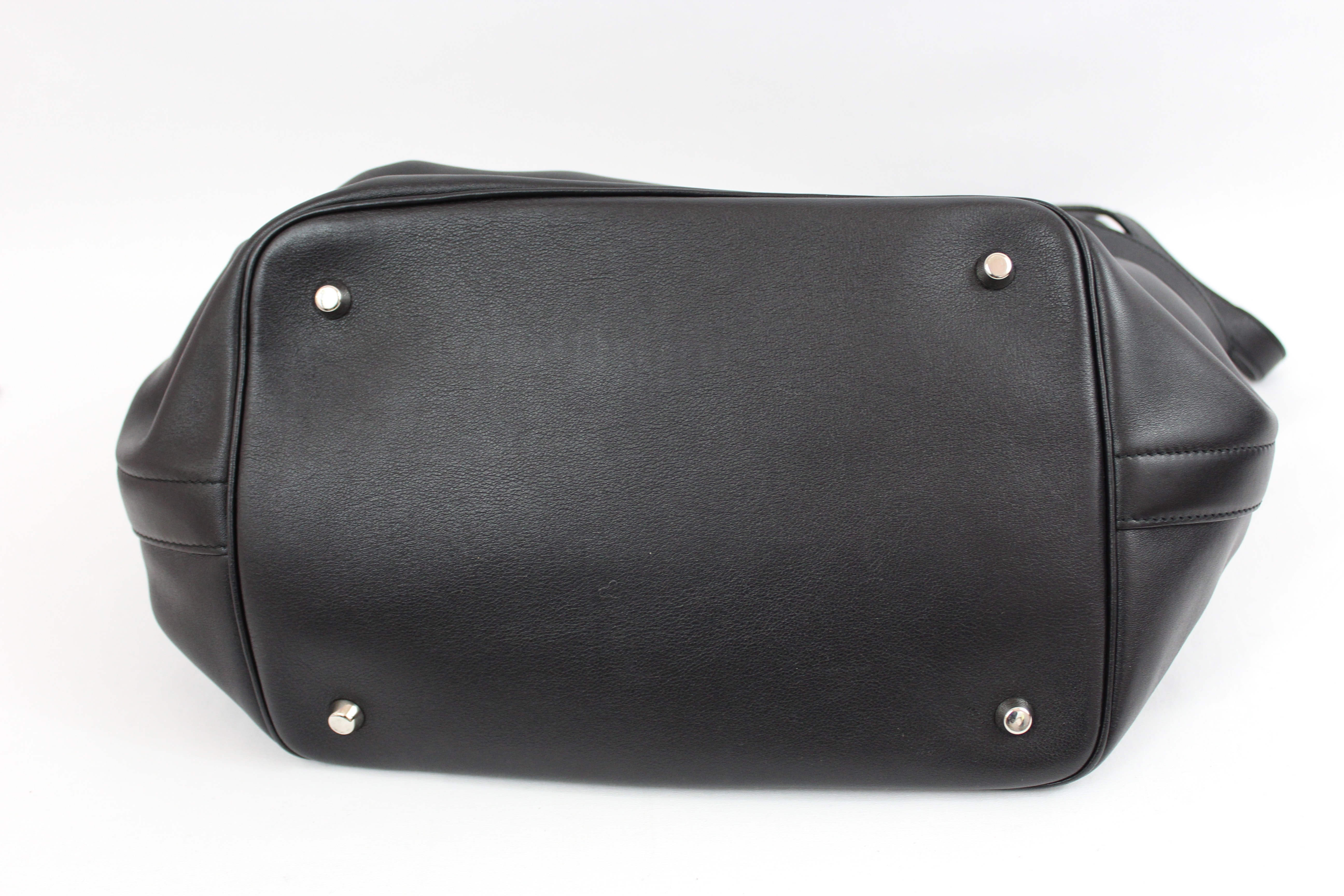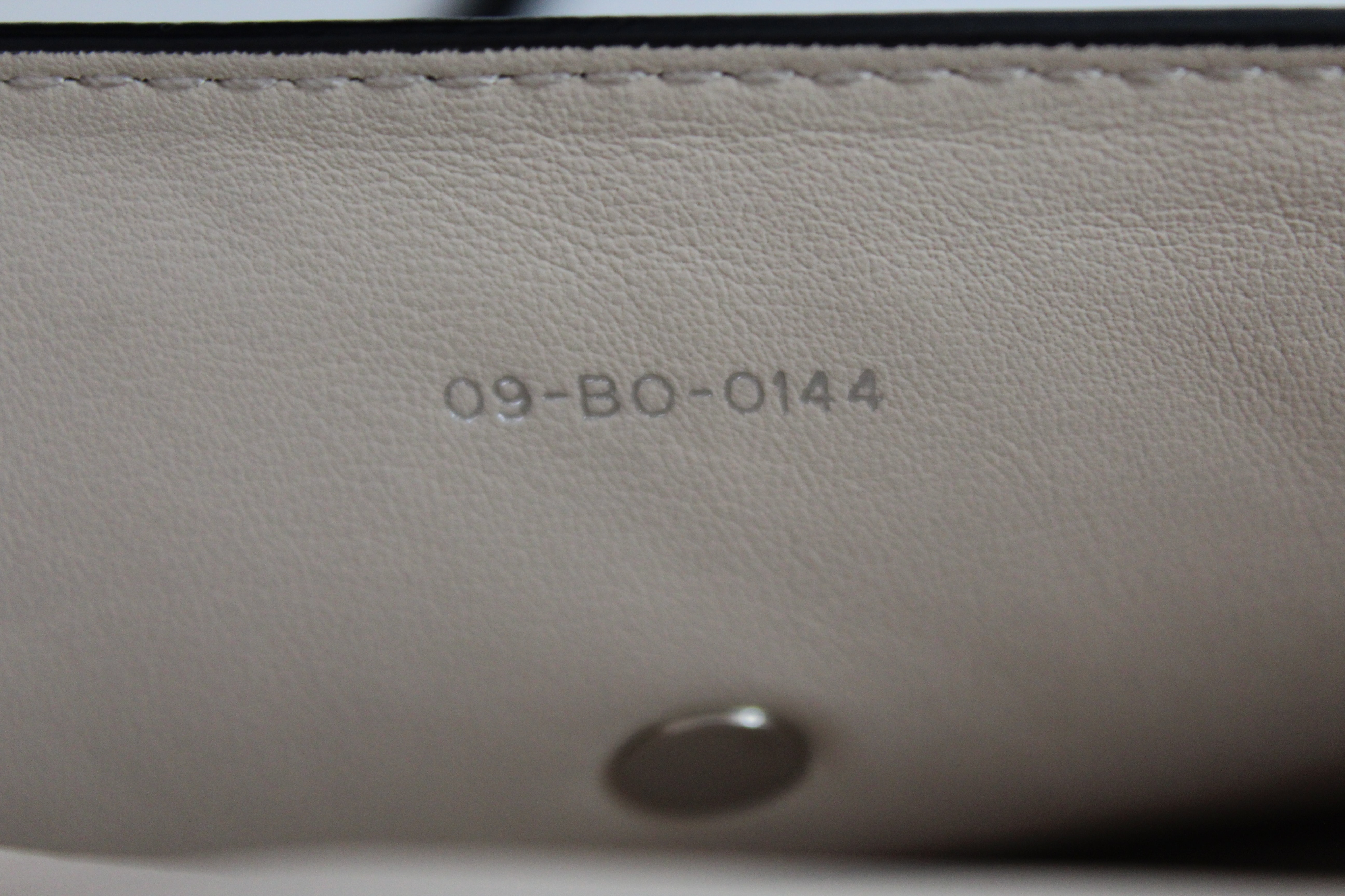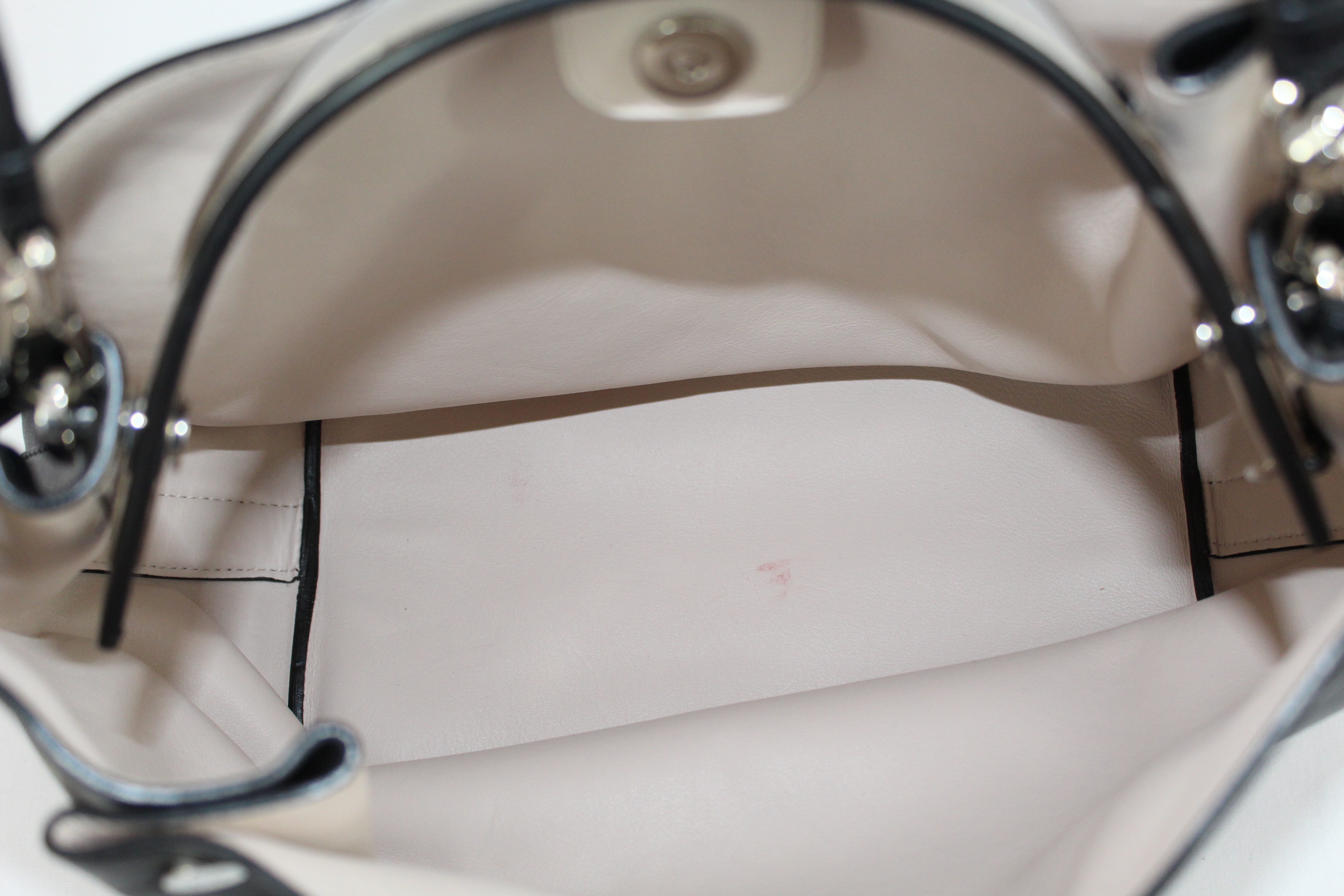 This beautiful Diorific bucket bag has an all black smooth leather exterior and a cream leather interior. It has a silver-tone top handle and hardware, and a Dior logo charm in a clochette. The perfect bag to carry everyday and the matching wristlet keeps the little things in order.