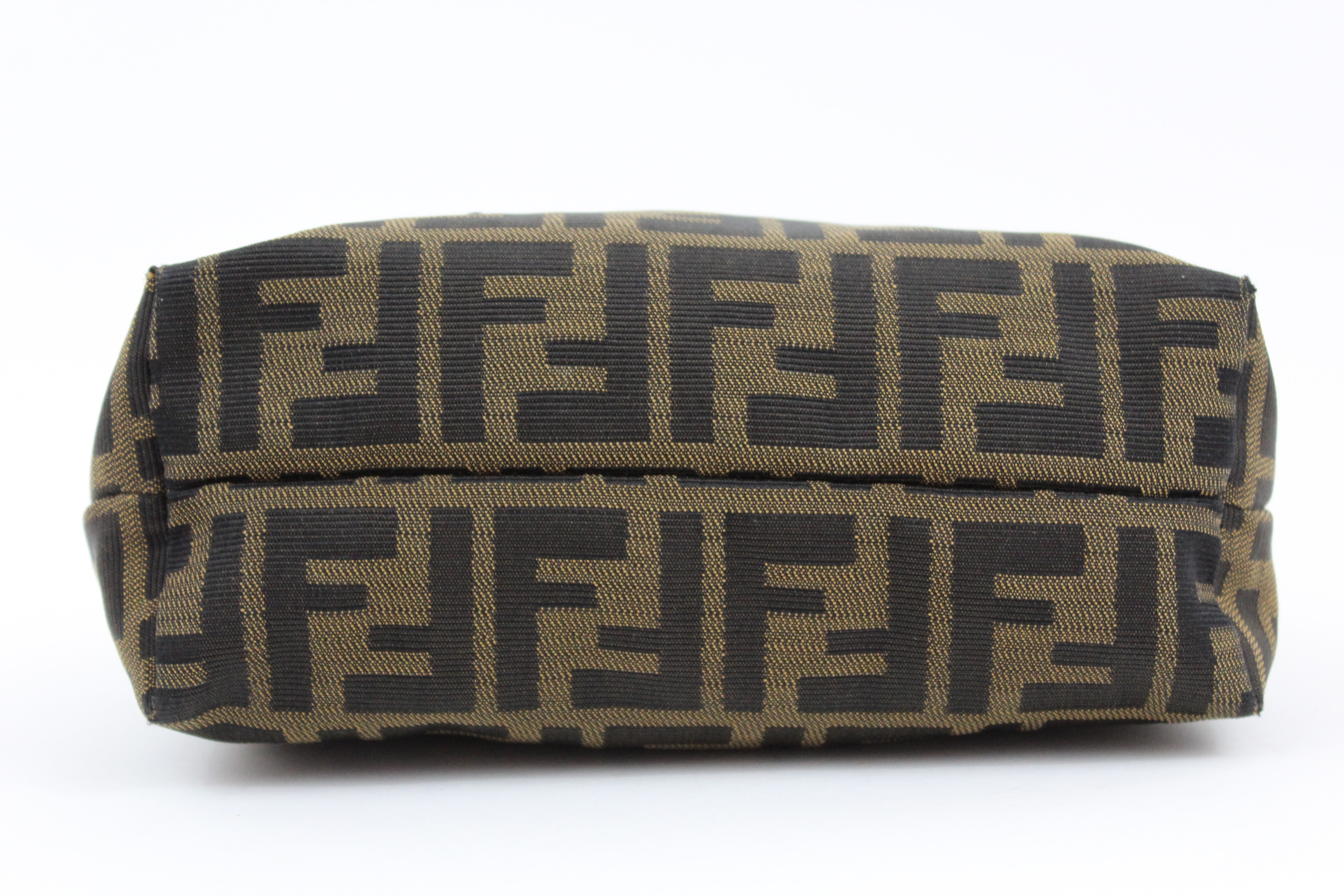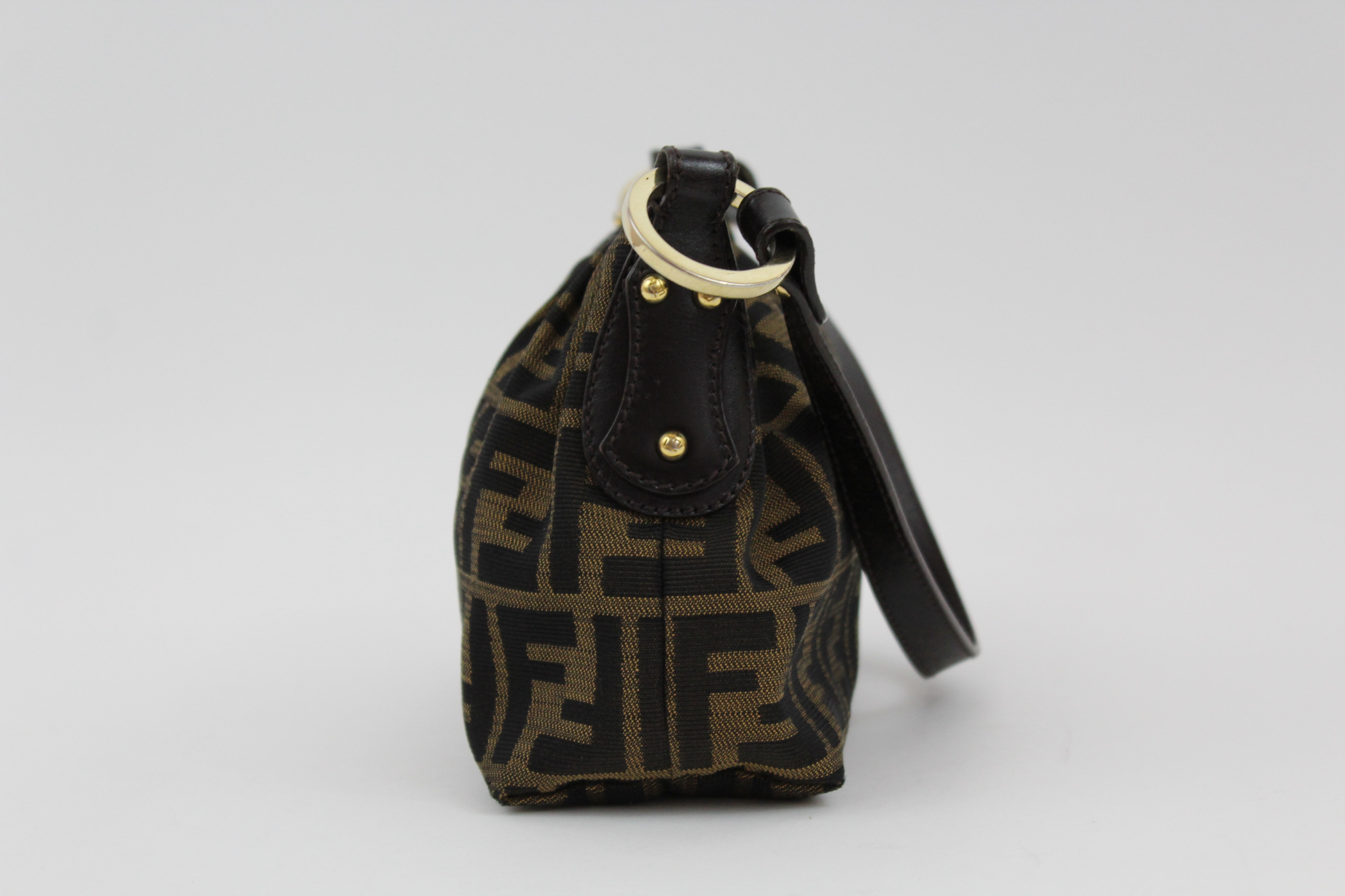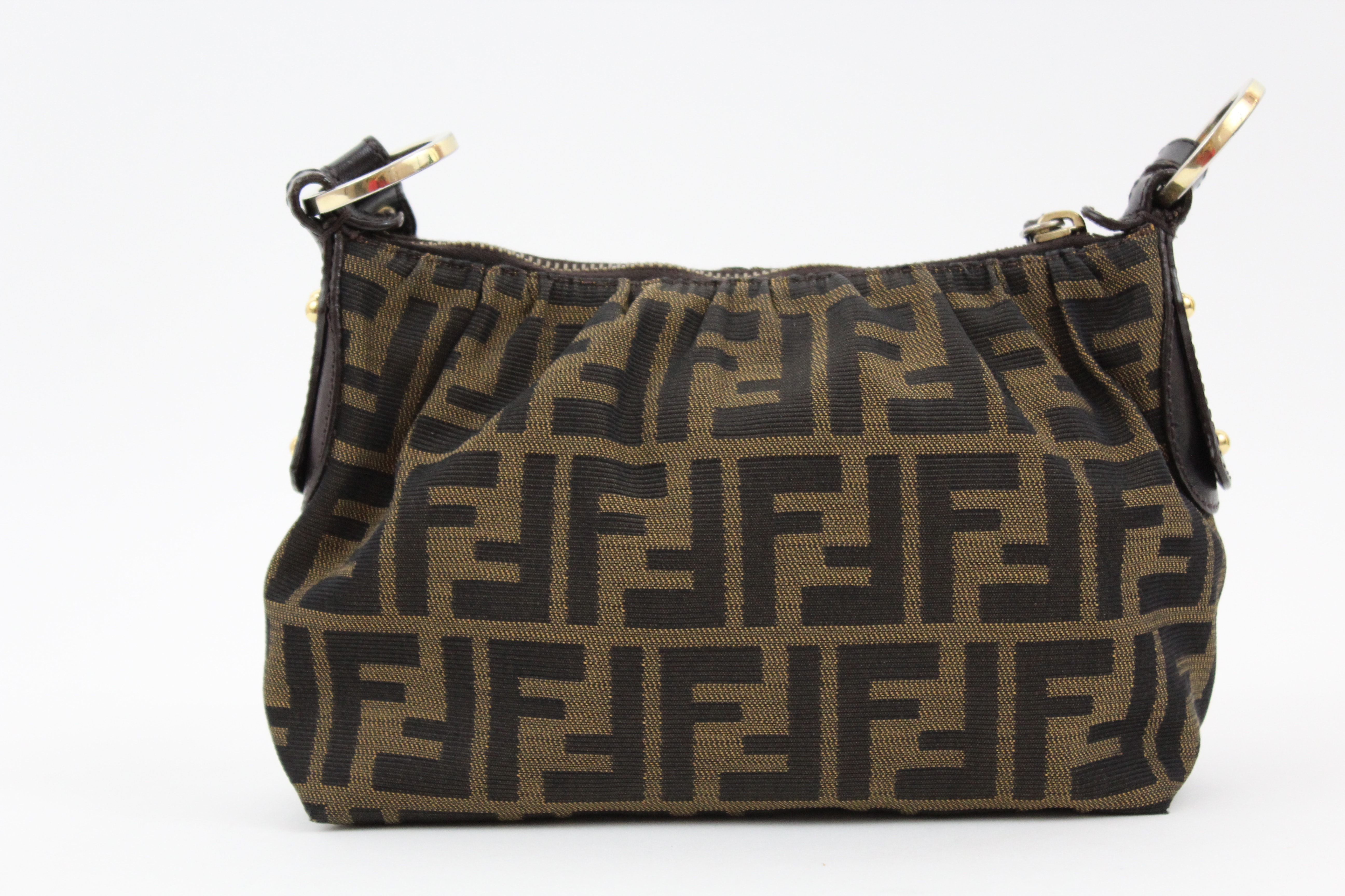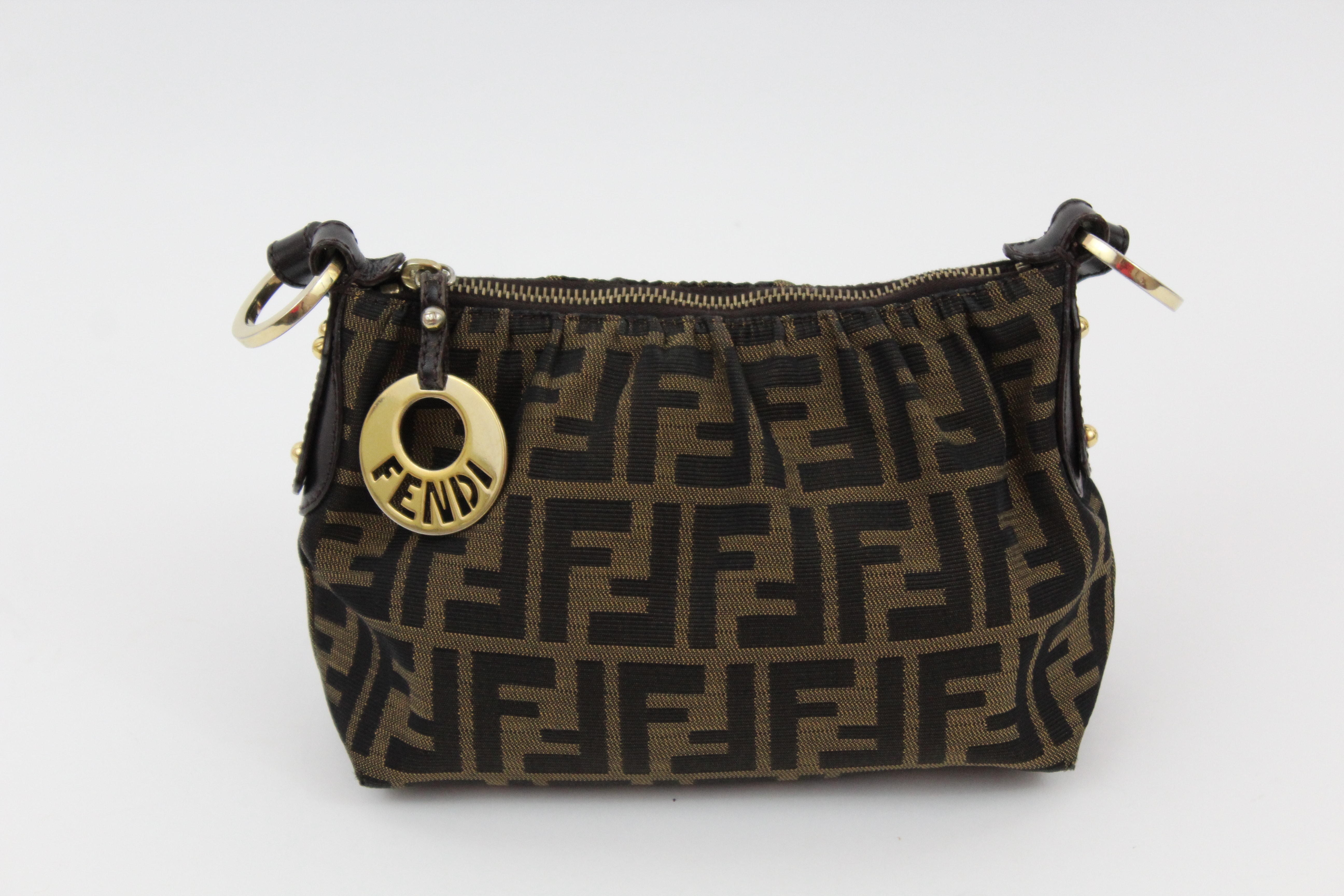 Fendi mini Zucca canvas with gold tone hardware and zipper closure. Don’t be fooled by it’s size though, easily fits larger phones and essentials, it also has one interior open pocket. Add a longer gold tone chain strap and turn it into a cross body or belt bag!