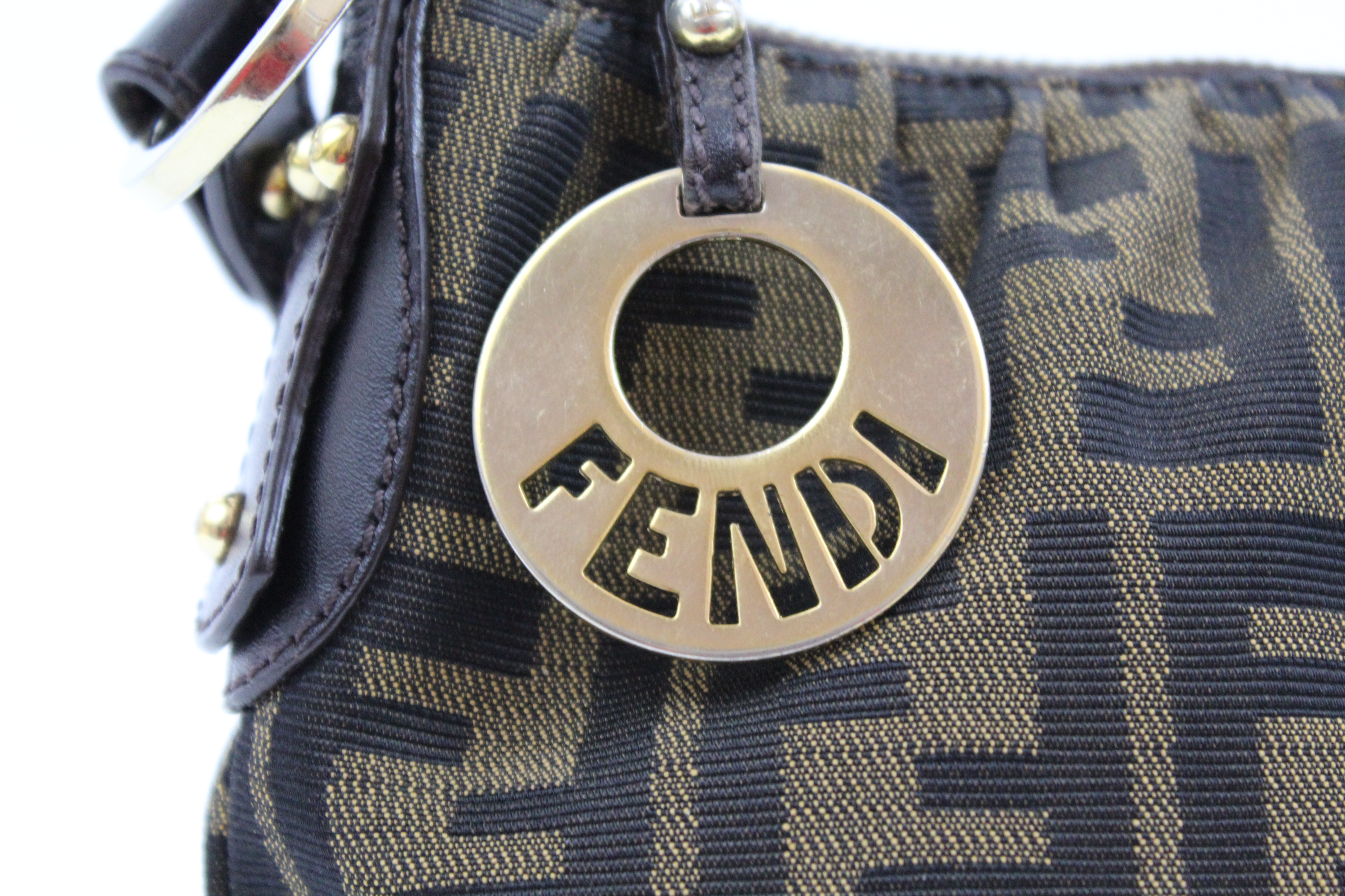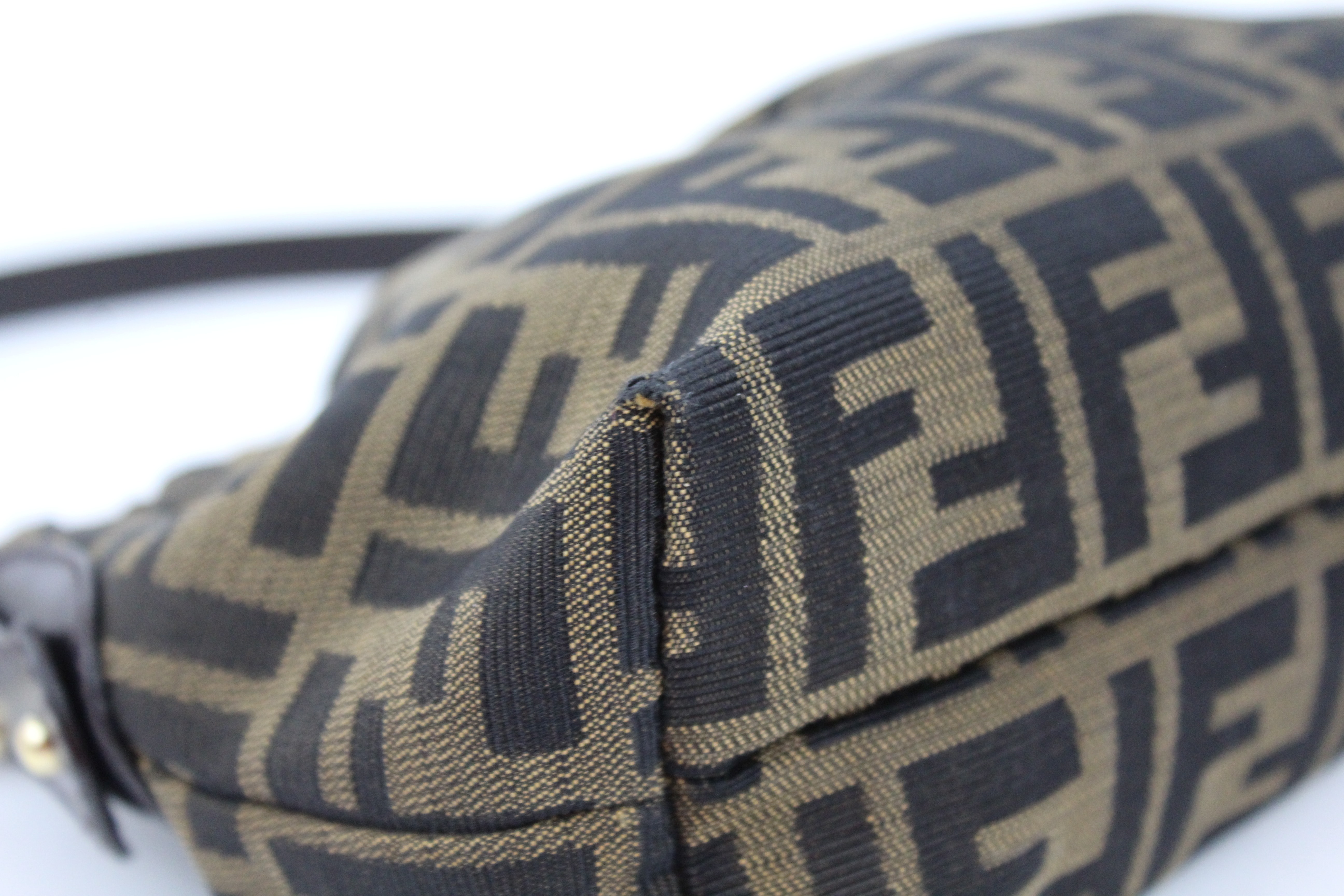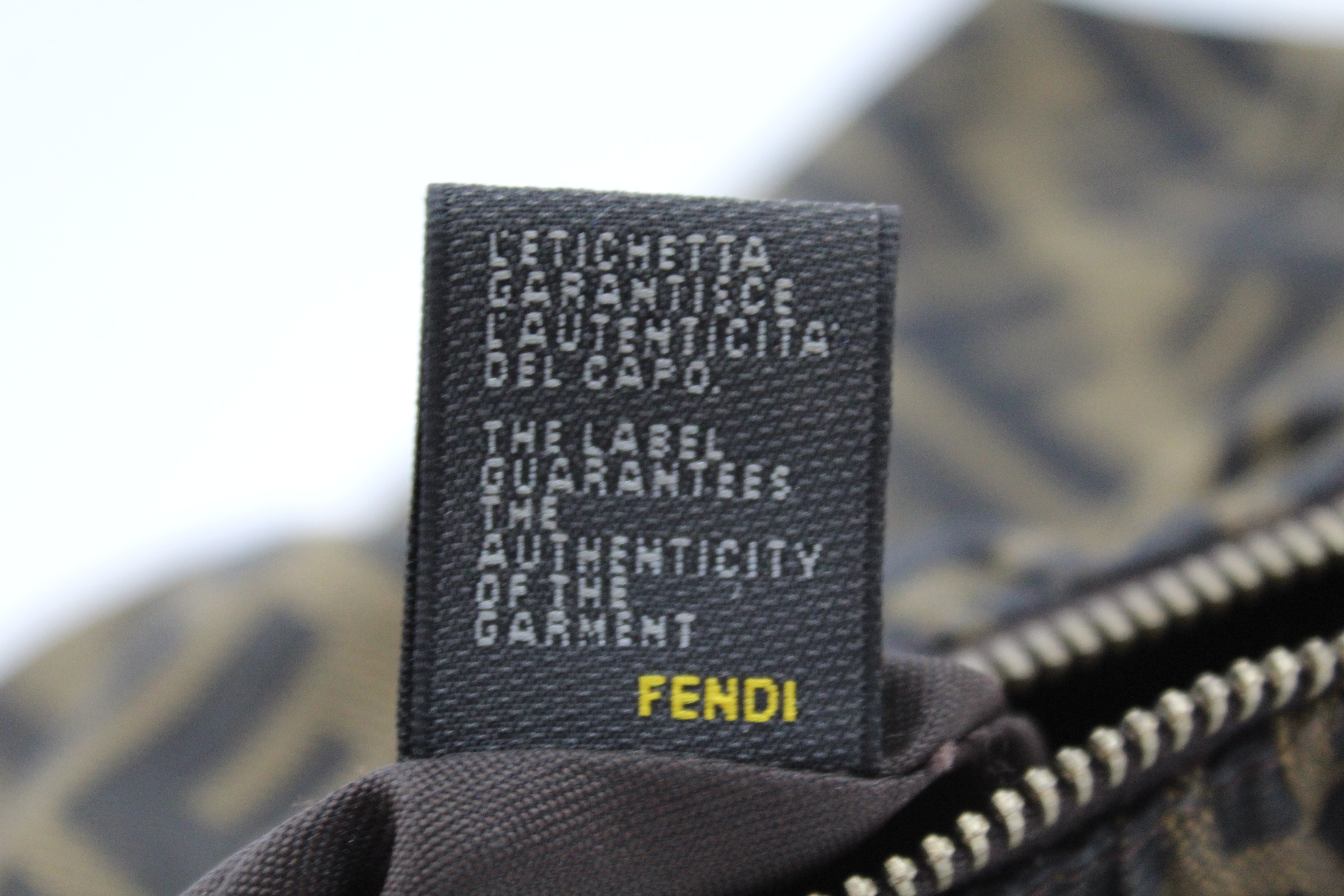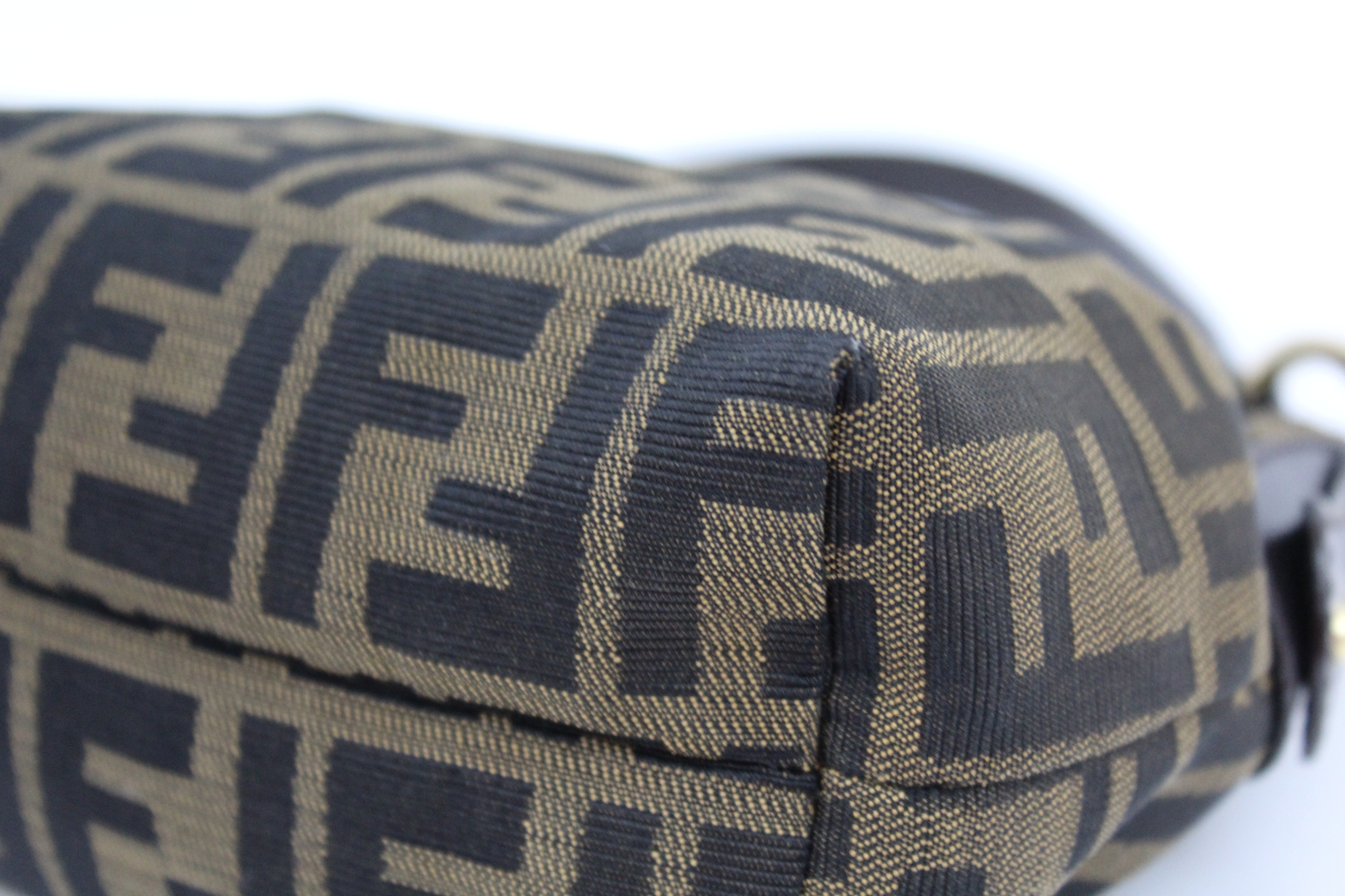 Fendi mini Zucca canvas with gold tone hardware and zipper closure. Don’t be fooled by it’s size though, easily fits larger phones and essentials, it also has one interior open pocket. Add a longer gold tone chain strap and turn it into a cross body or belt bag!