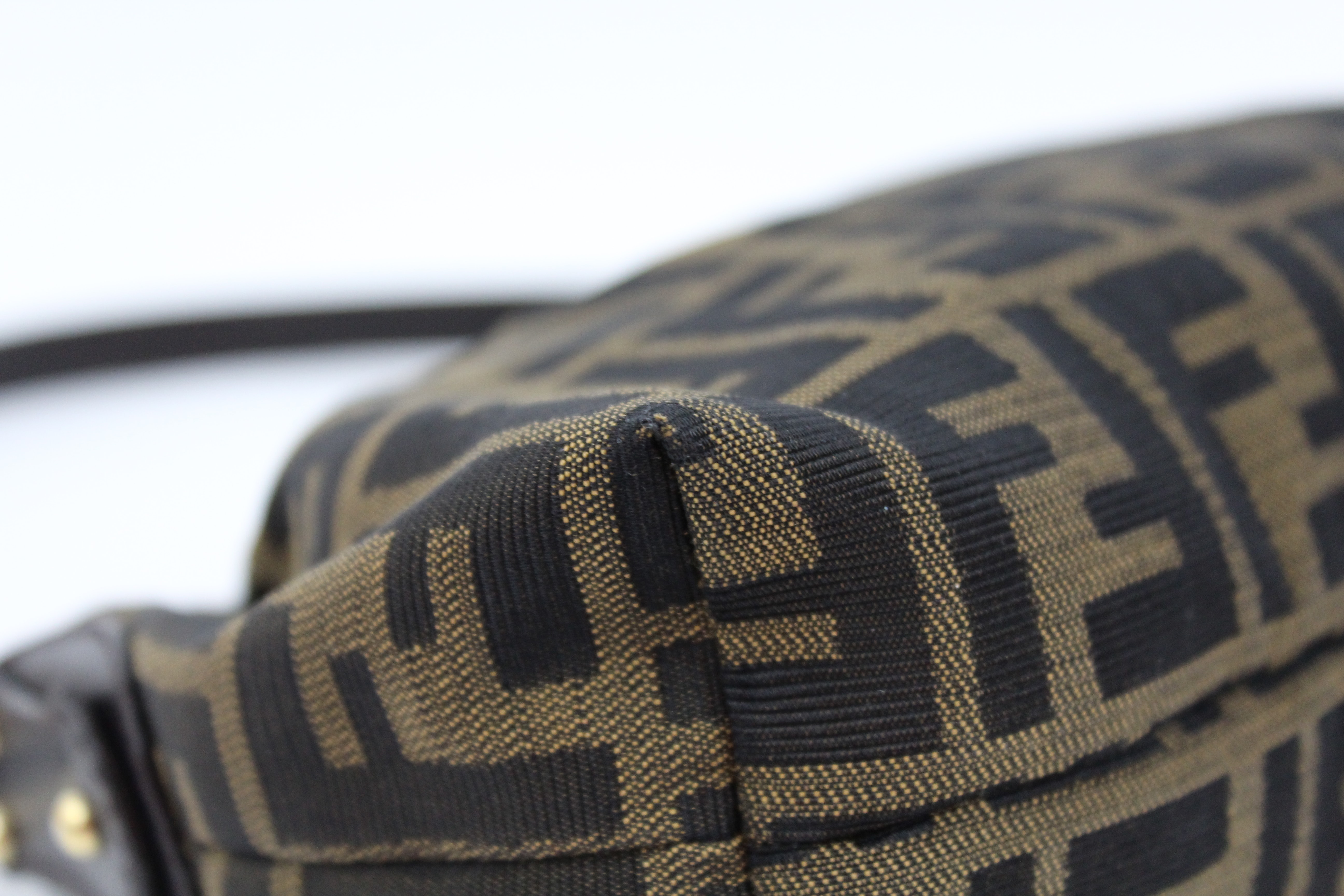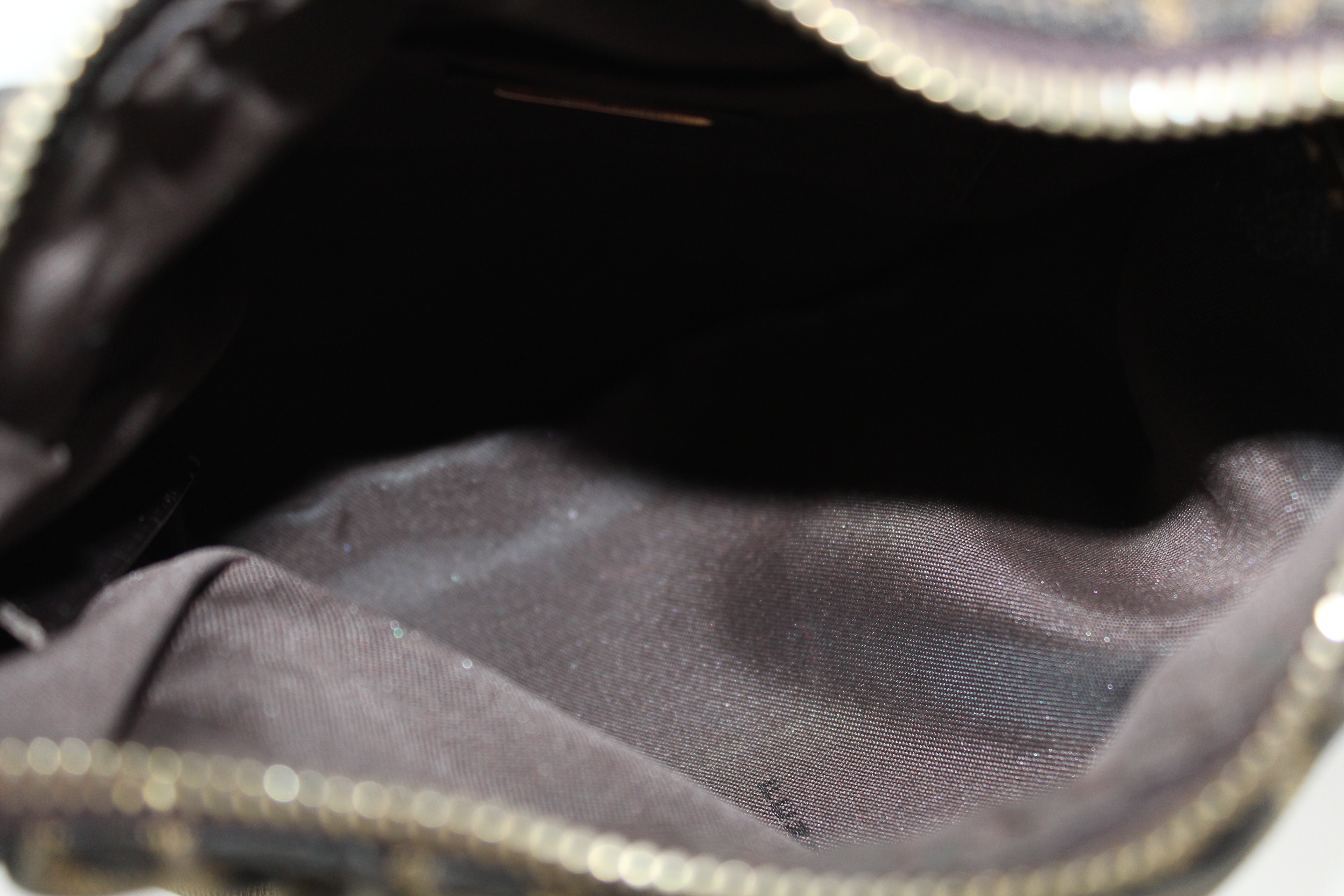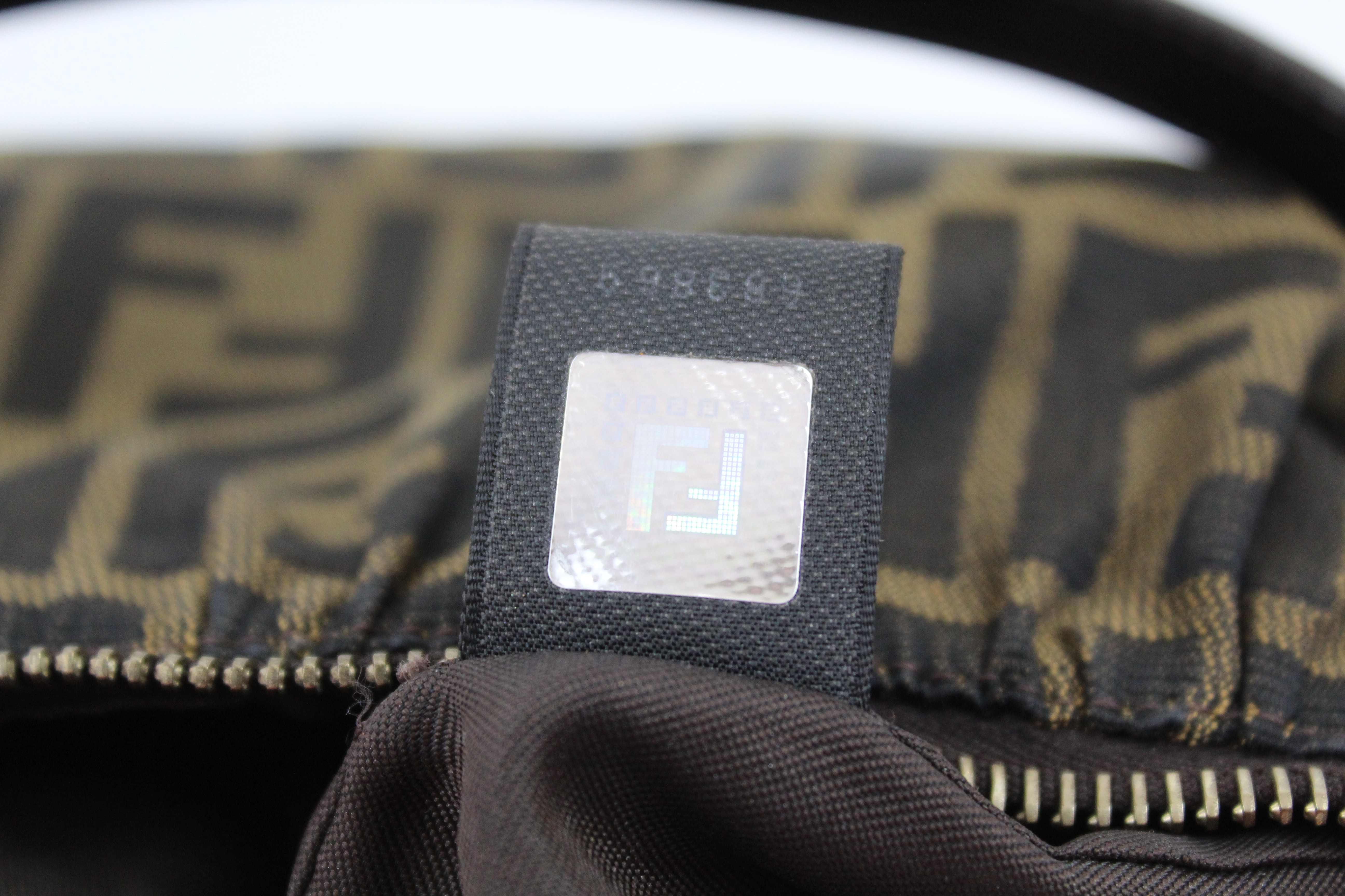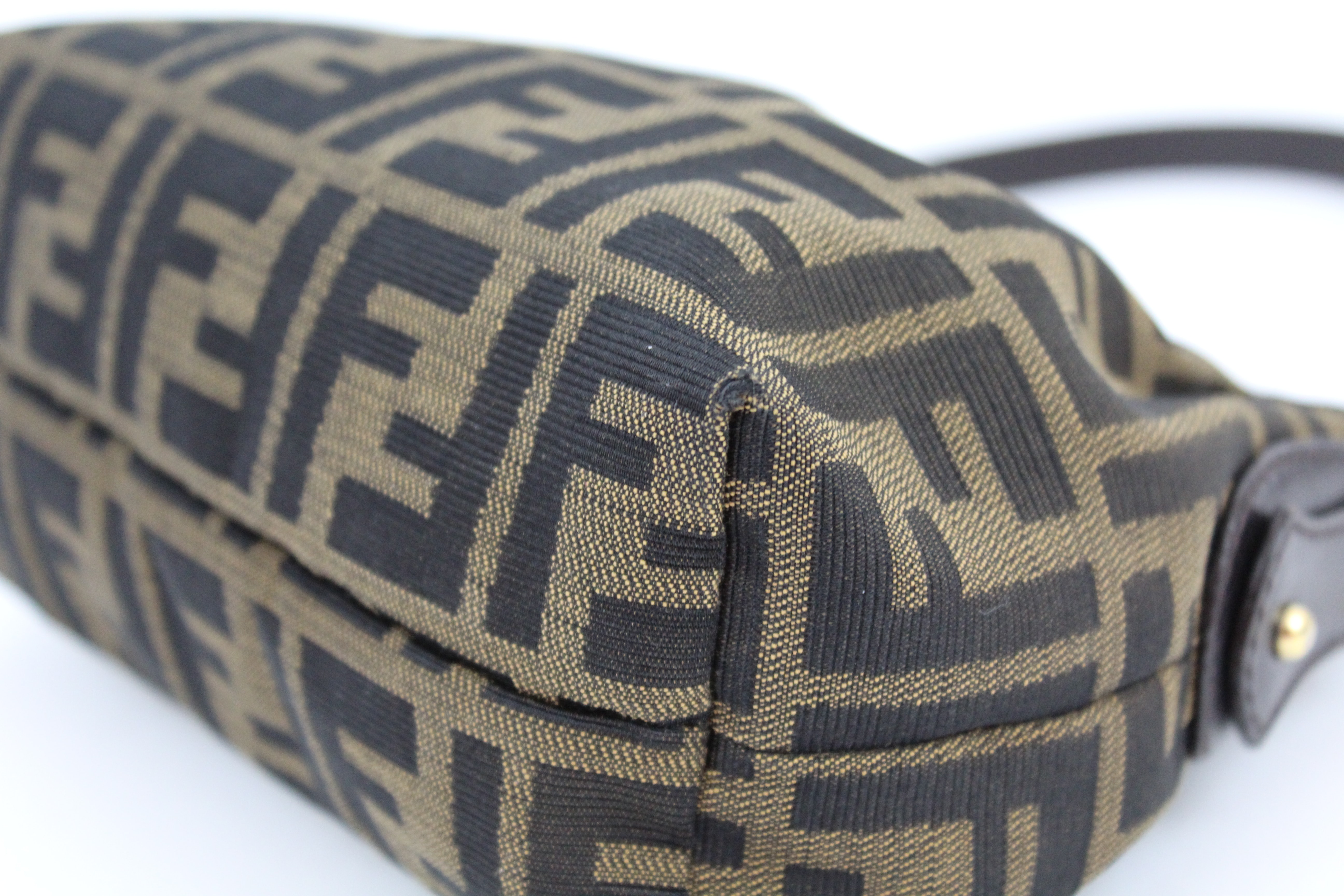Fendi mini Zucca canvas with gold tone hardware and zipper closure. Don’t be fooled by it’s size though, easily fits larger phones and essentials, it also has one interior open pocket. Add a longer gold tone chain strap and turn it into a cross body or belt bag!