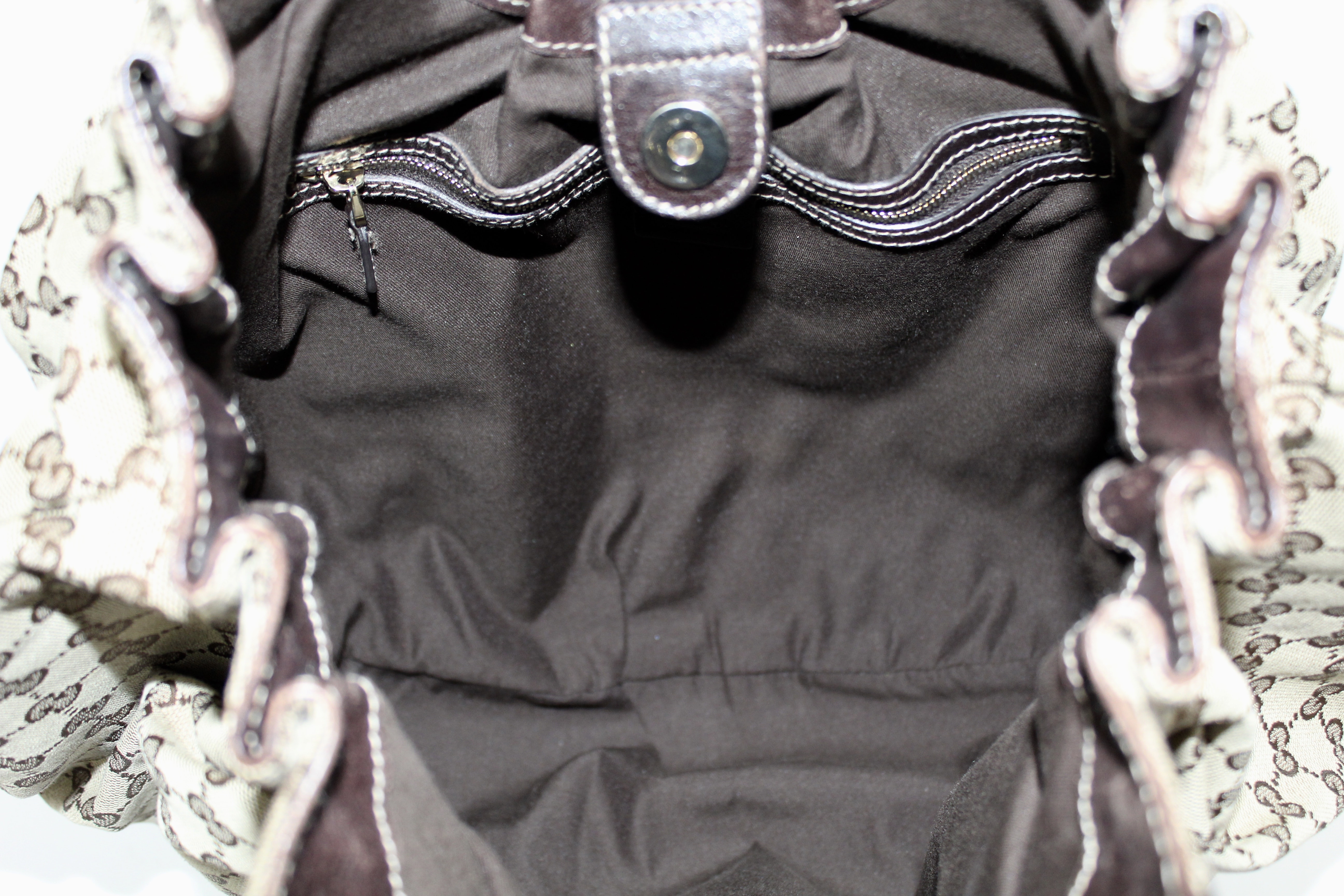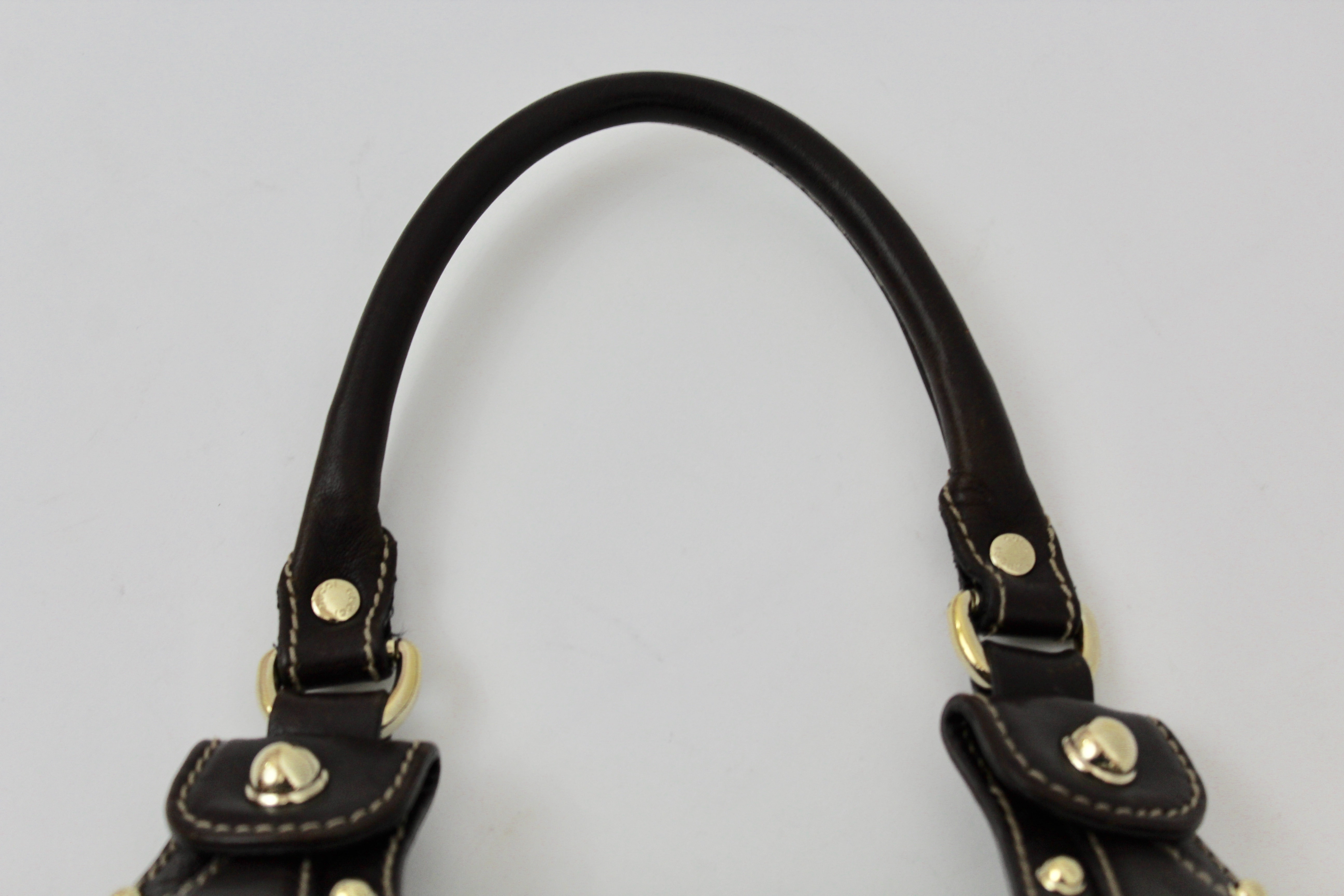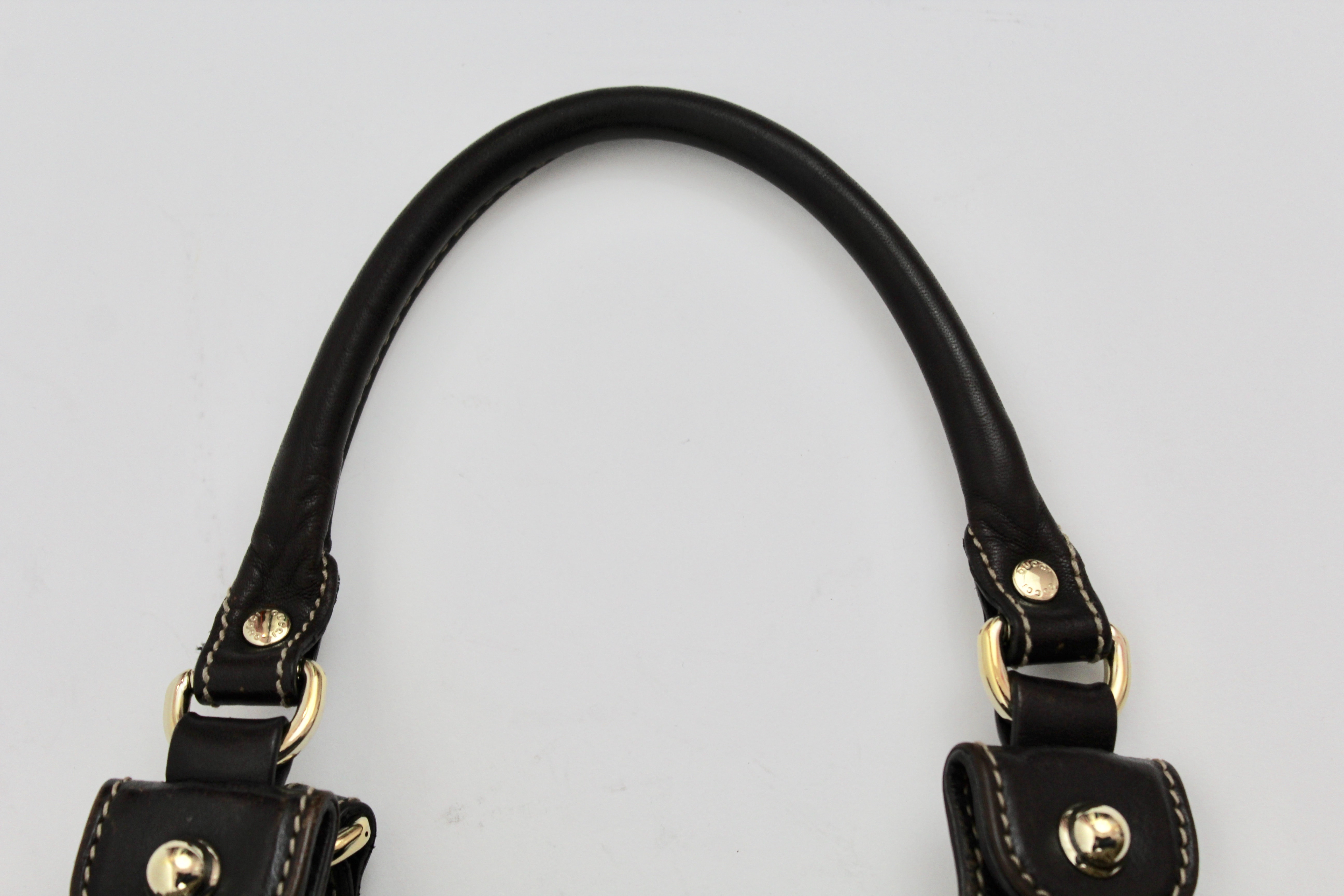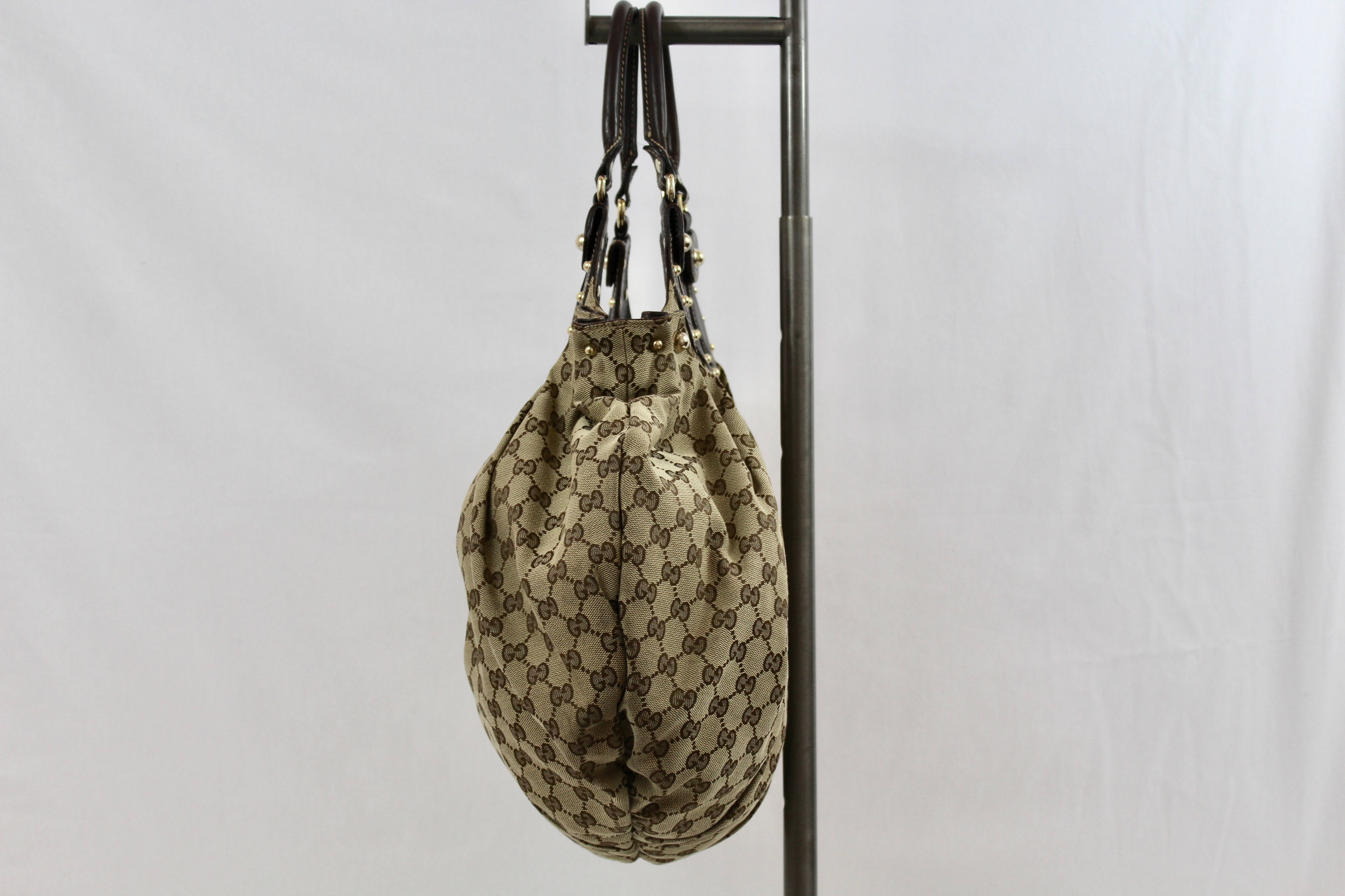 This beautiful Gucci tote in their signature GG canvas and chocolate brown leather handles, embellished with gold studs. The bag is such a statement piece and very roomy, it has a snap closure, matching brown interior and a one interior zippered pocket. Comfortably sits on the shoulder or carry as a handle bag.