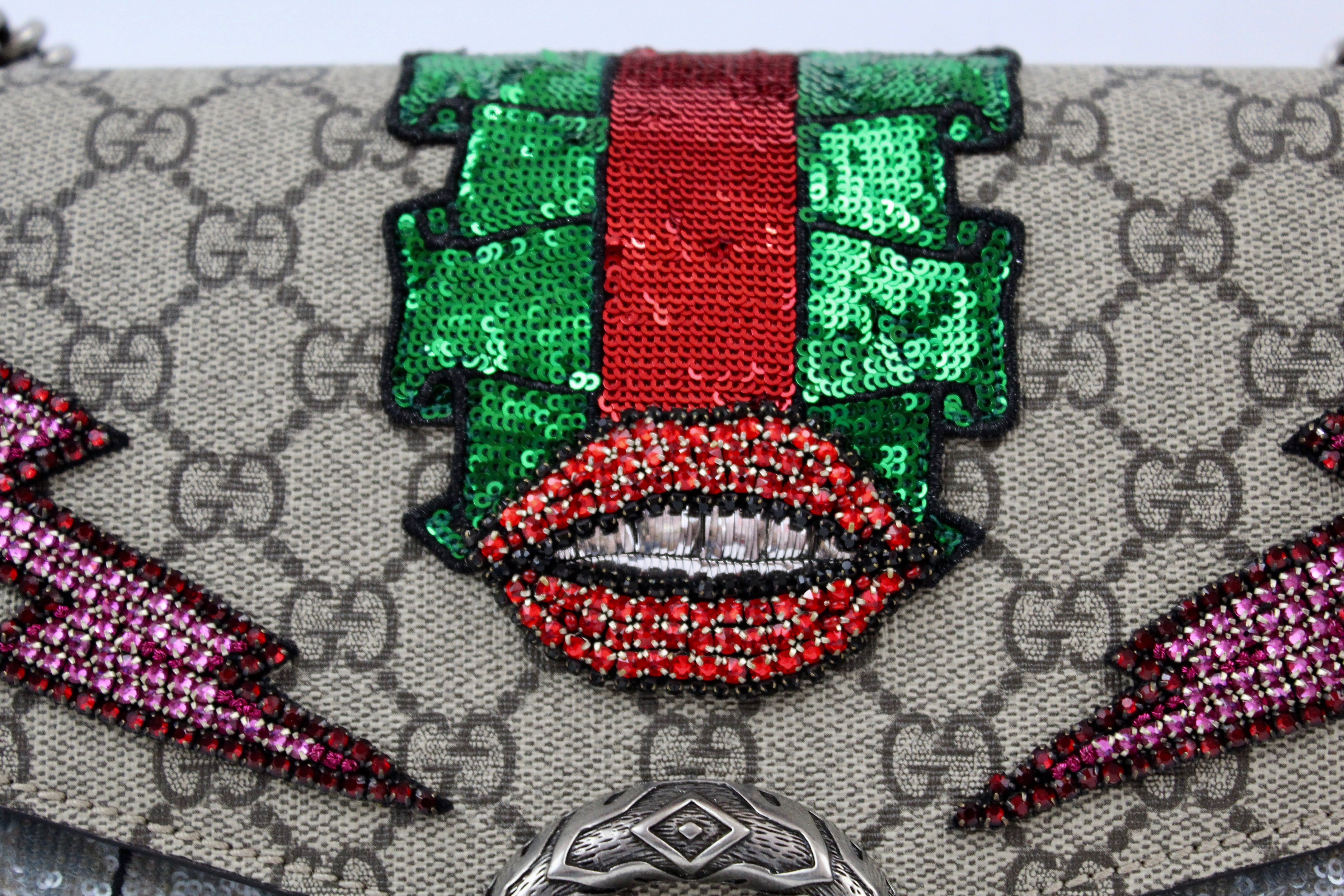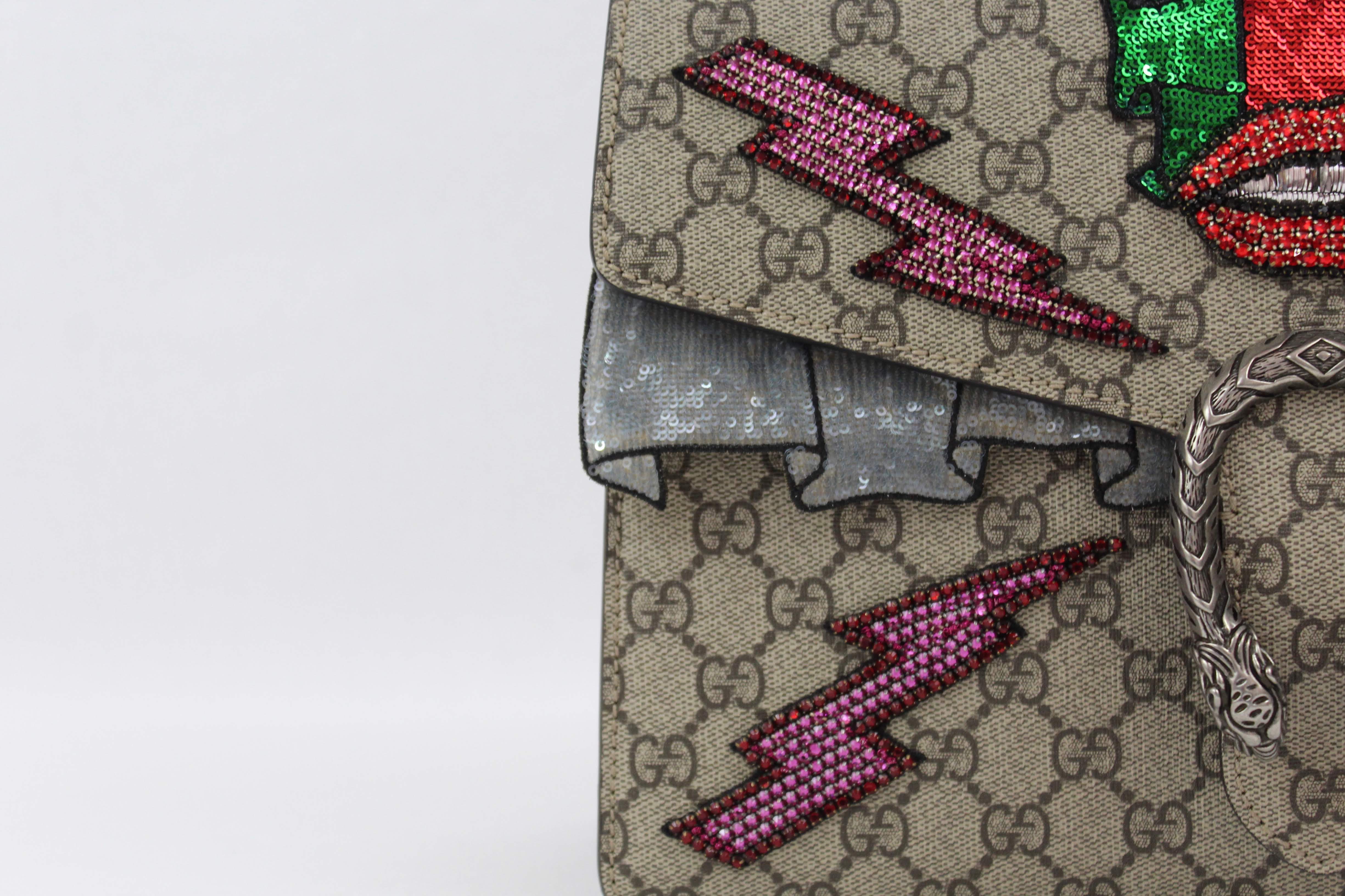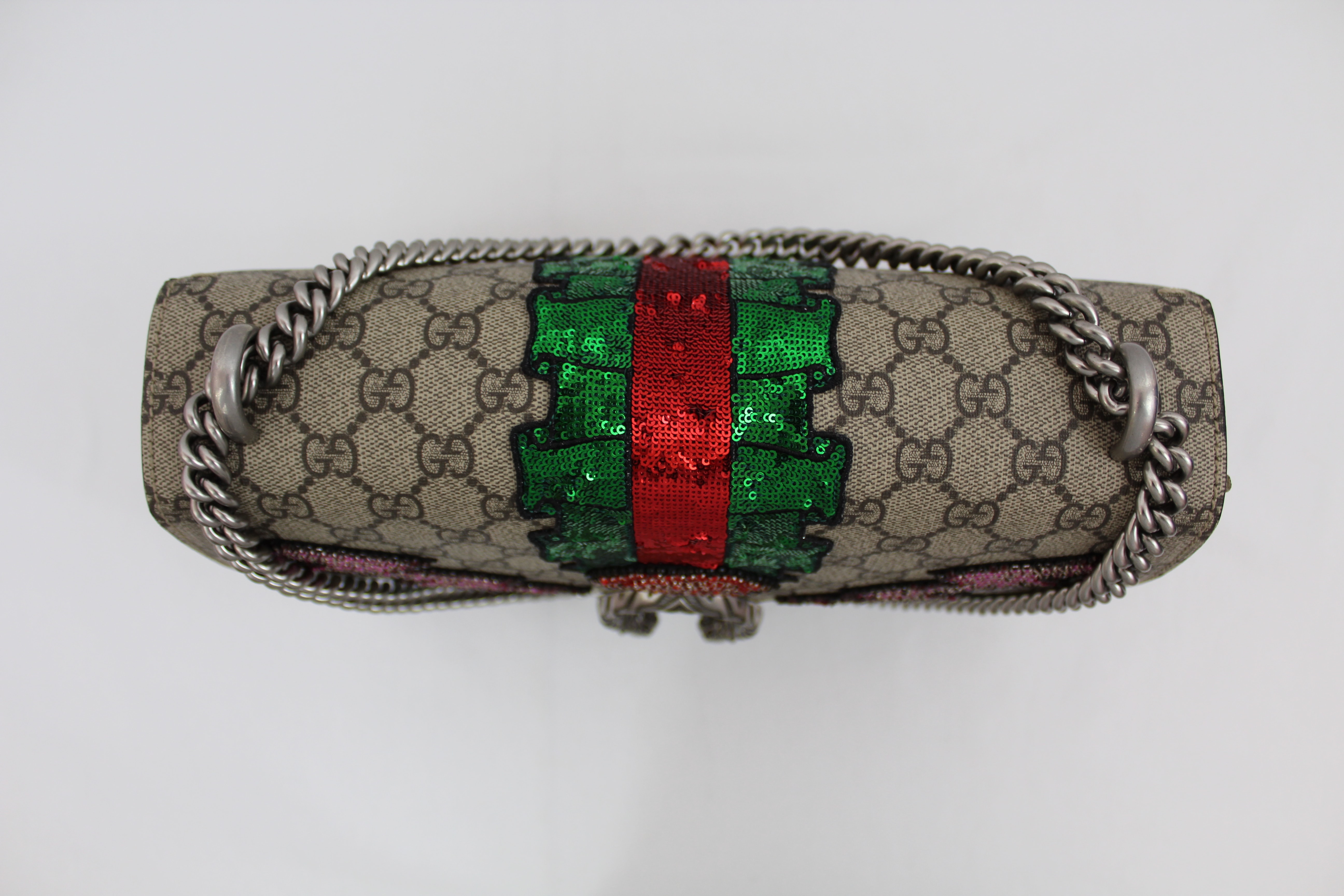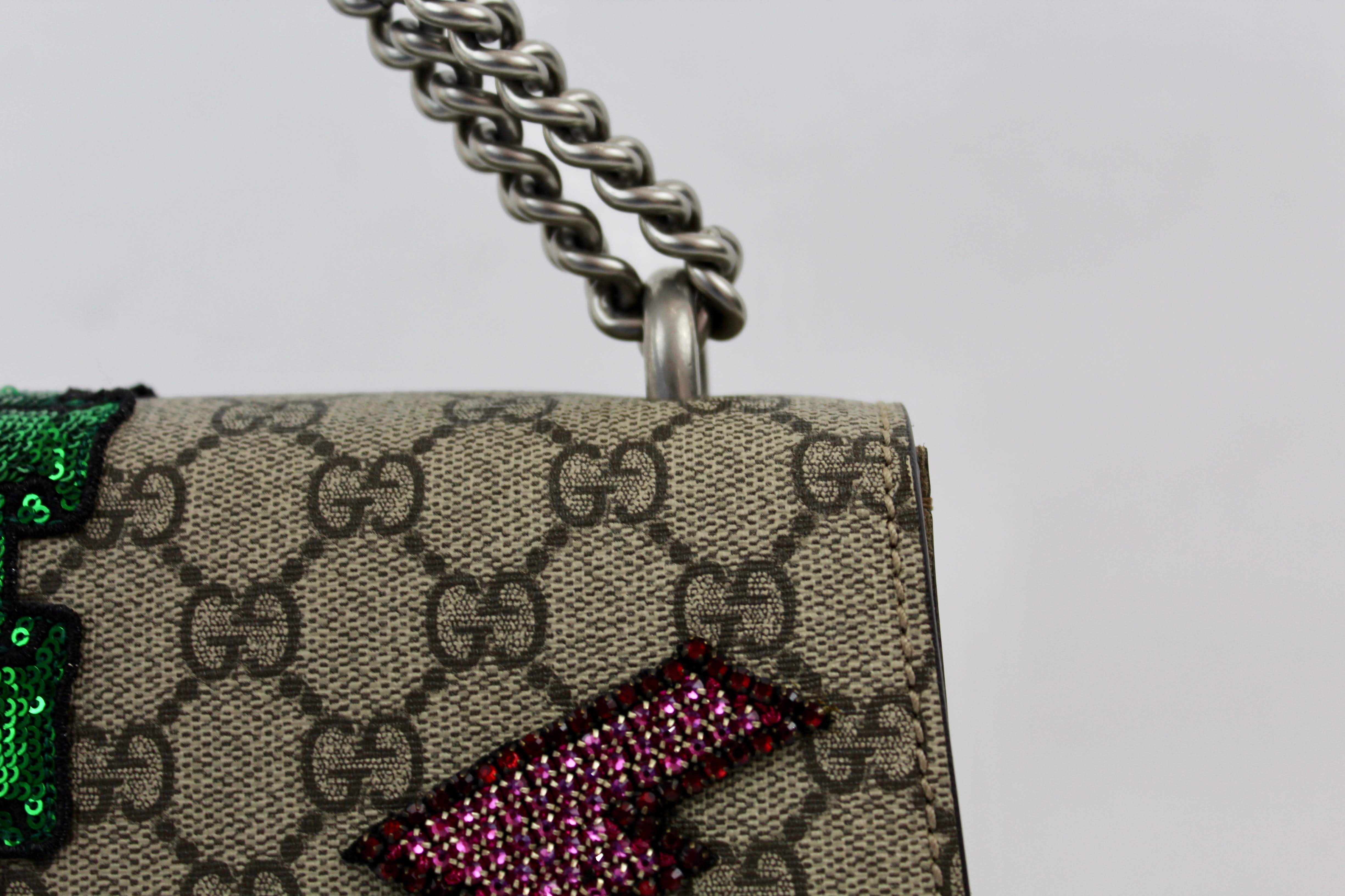 - The Dionysus shoulder bag is already a classic and sure to make a statement. It’s a structured style featuring GG Supreme canvas with hand embroidered sequin appliques. It has a sliding chain offering carrying versatility so you can wear on your shoulder or as a handle bag. This particular style is RETIRED, highly sought after and RARE!