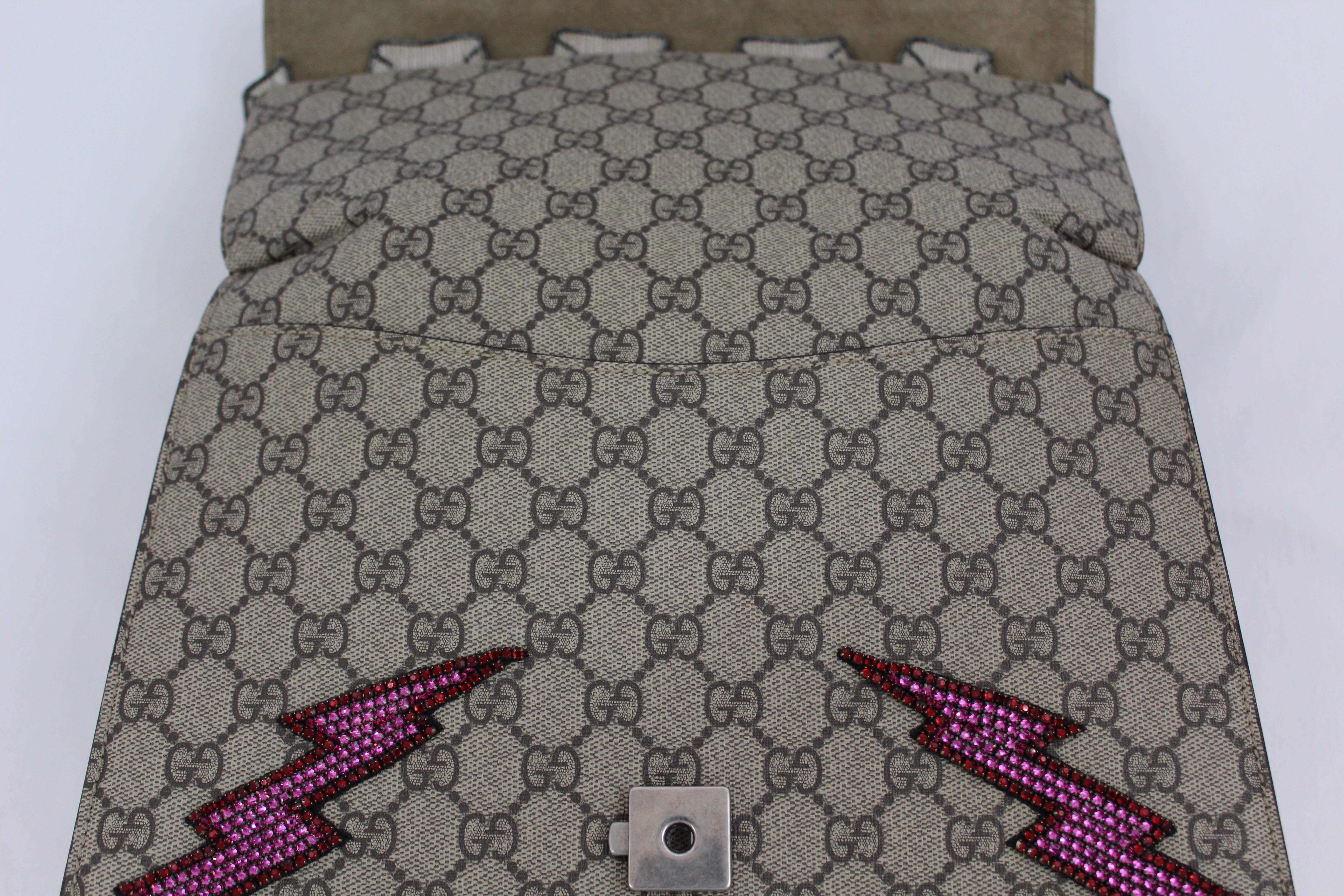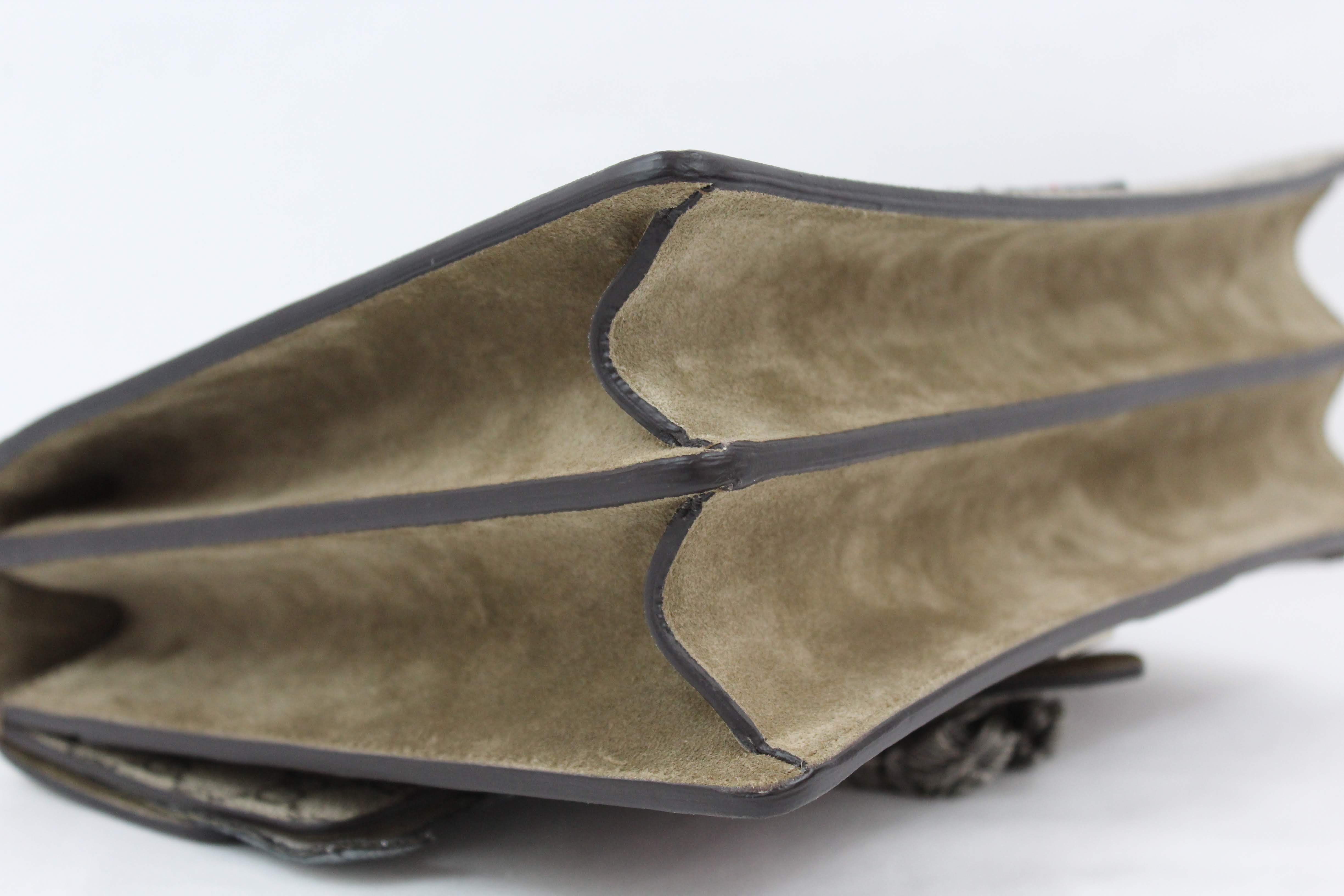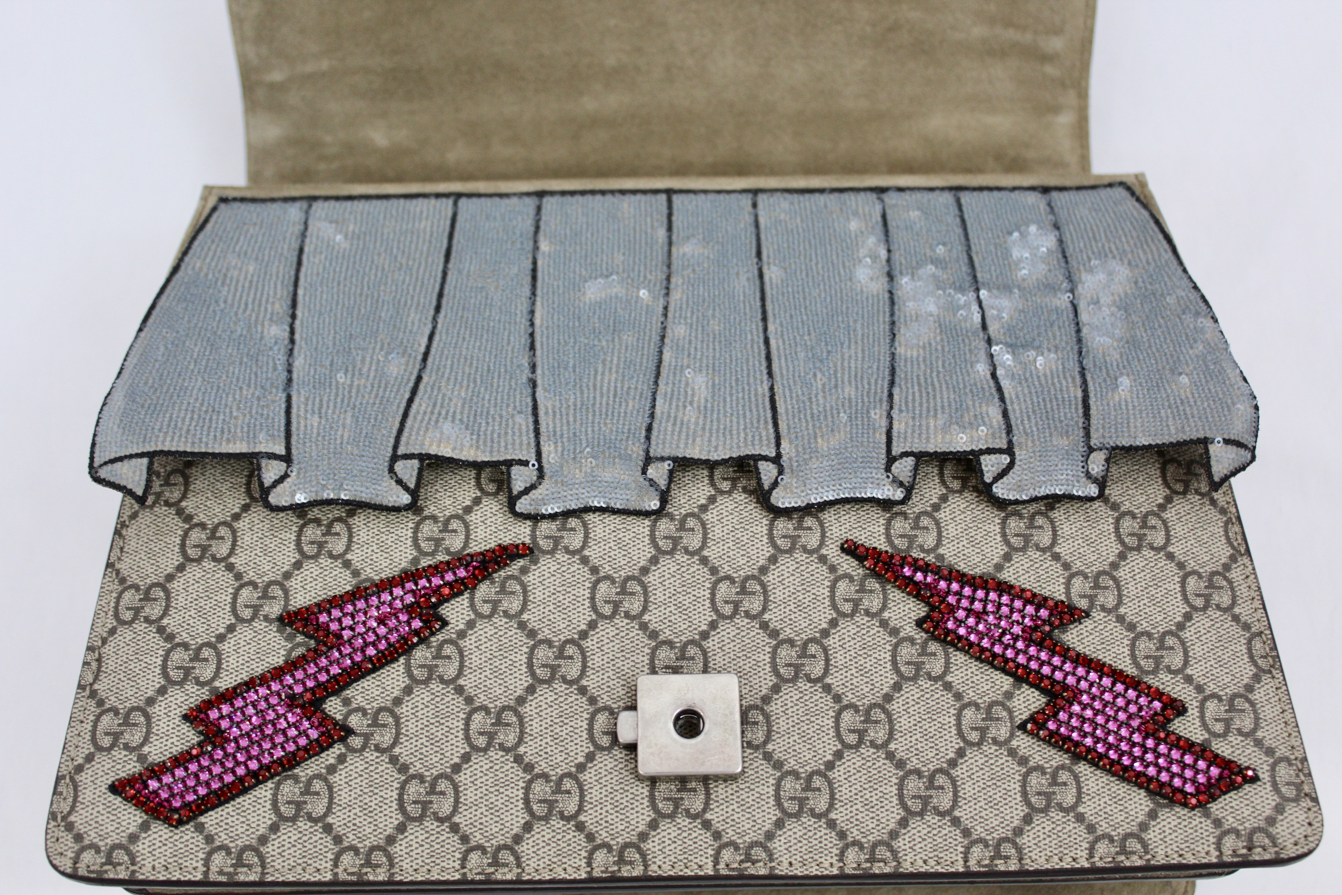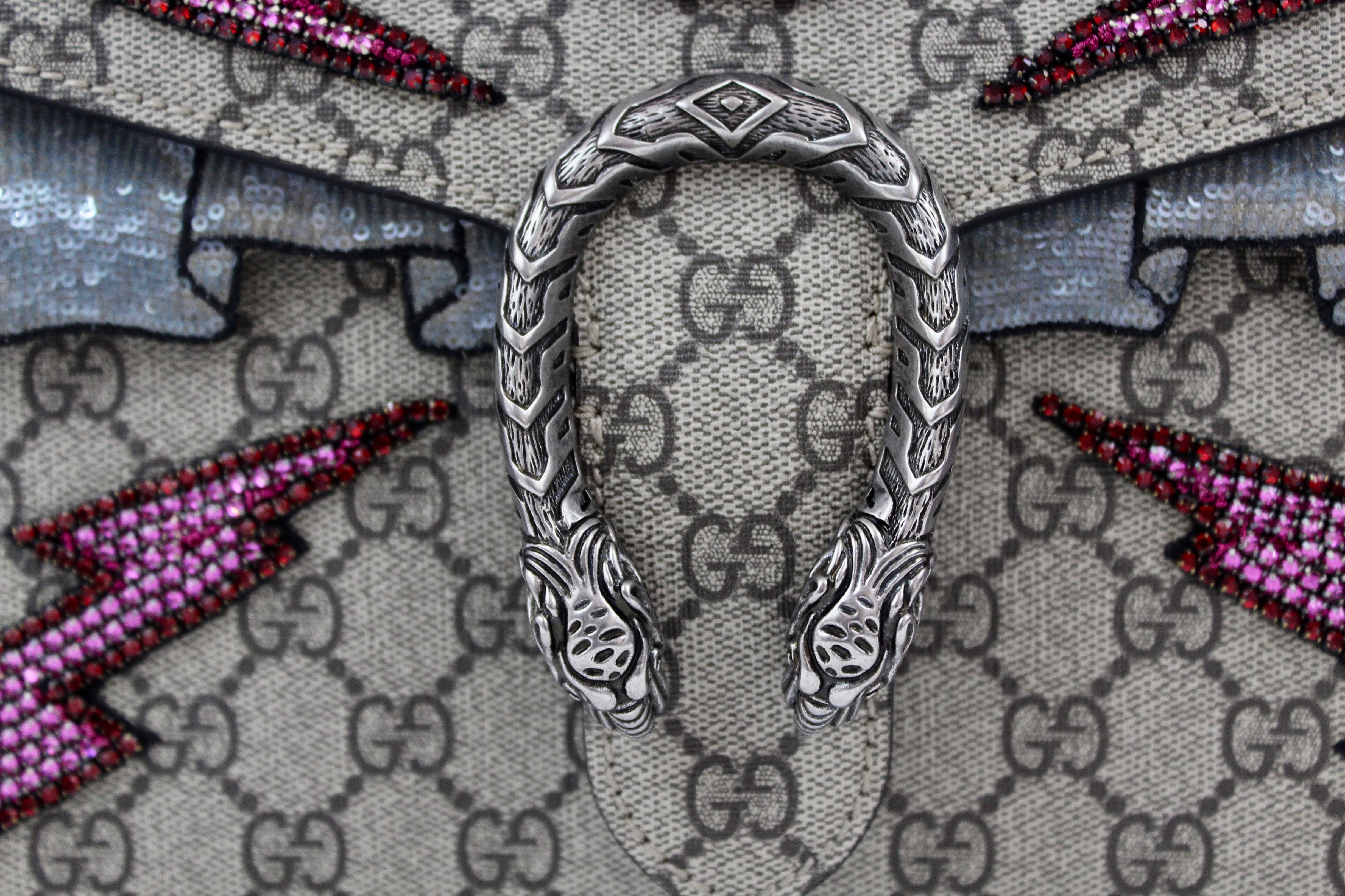 - The Dionysus shoulder bag is already a classic and sure to make a statement. It’s a structured style featuring GG Supreme canvas with hand embroidered sequin appliques. It has a sliding chain offering carrying versatility so you can wear on your shoulder or as a handle bag. This particular style is RETIRED, highly sought after and RARE!