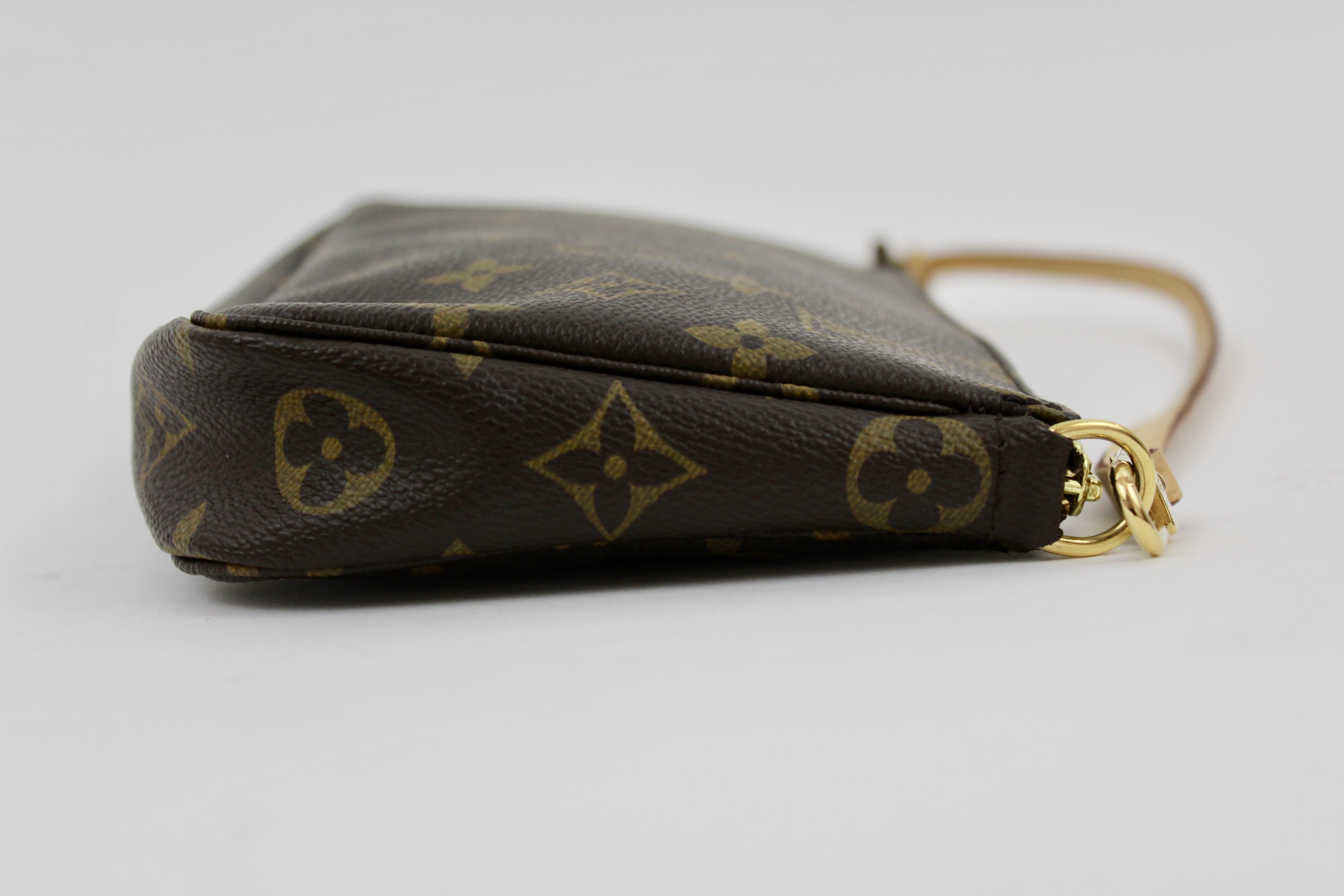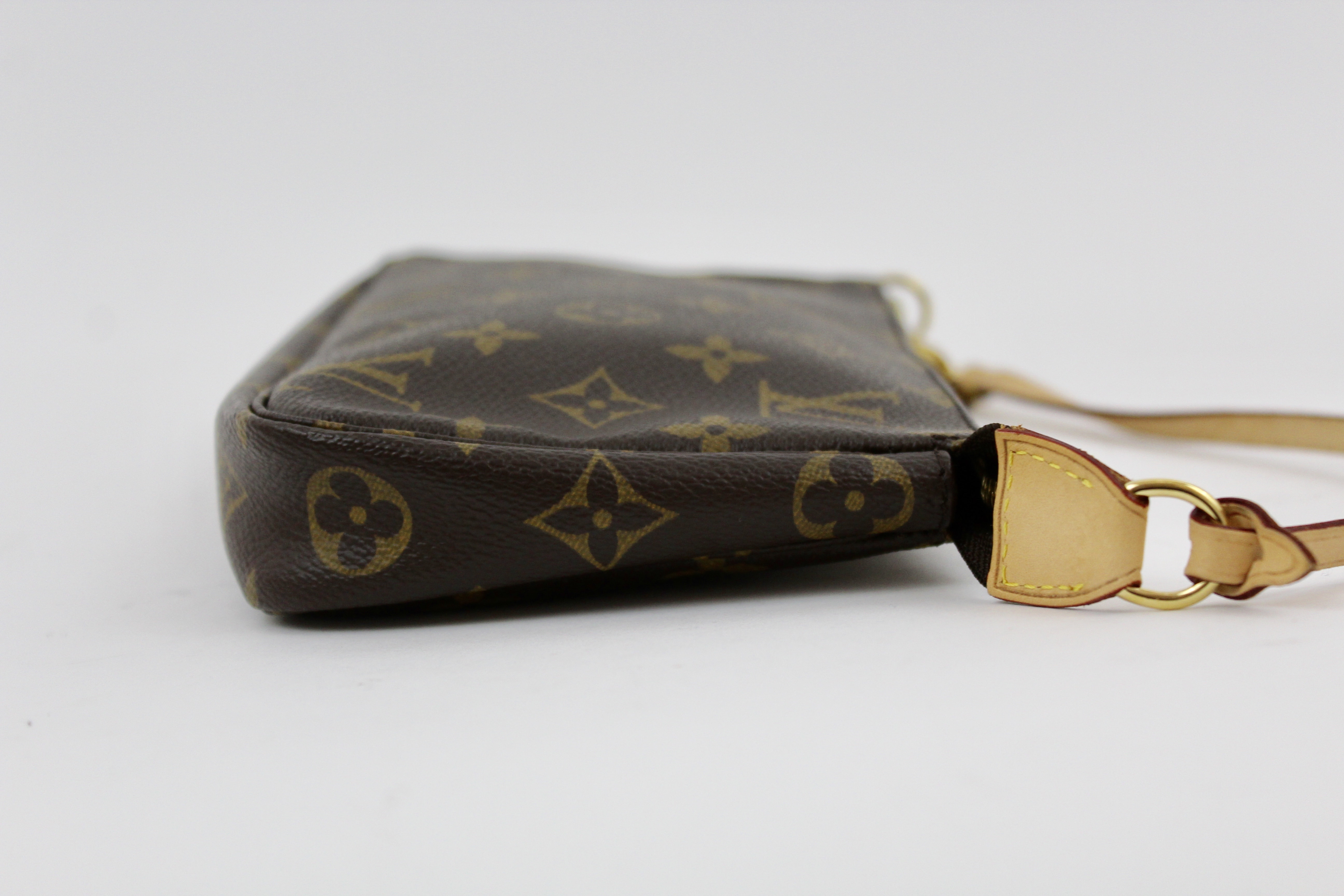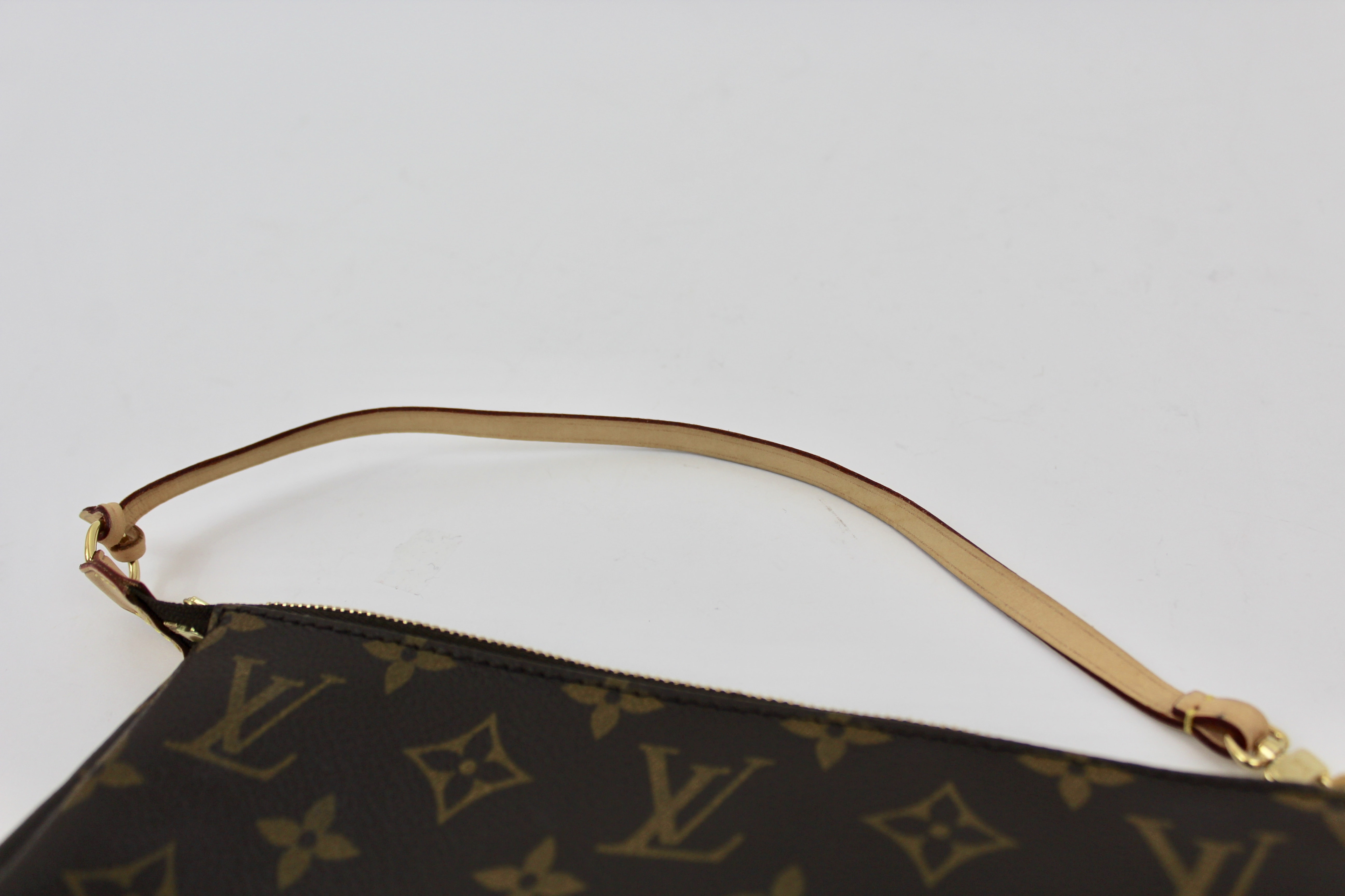 A Louis Vuitton favorite. The pochette in the traditional monogram coated canvas, vachetta leather strap, and brass hardware! Wear as a wristlet, aclutch, a small shoulder bag, or place in a larger bag.