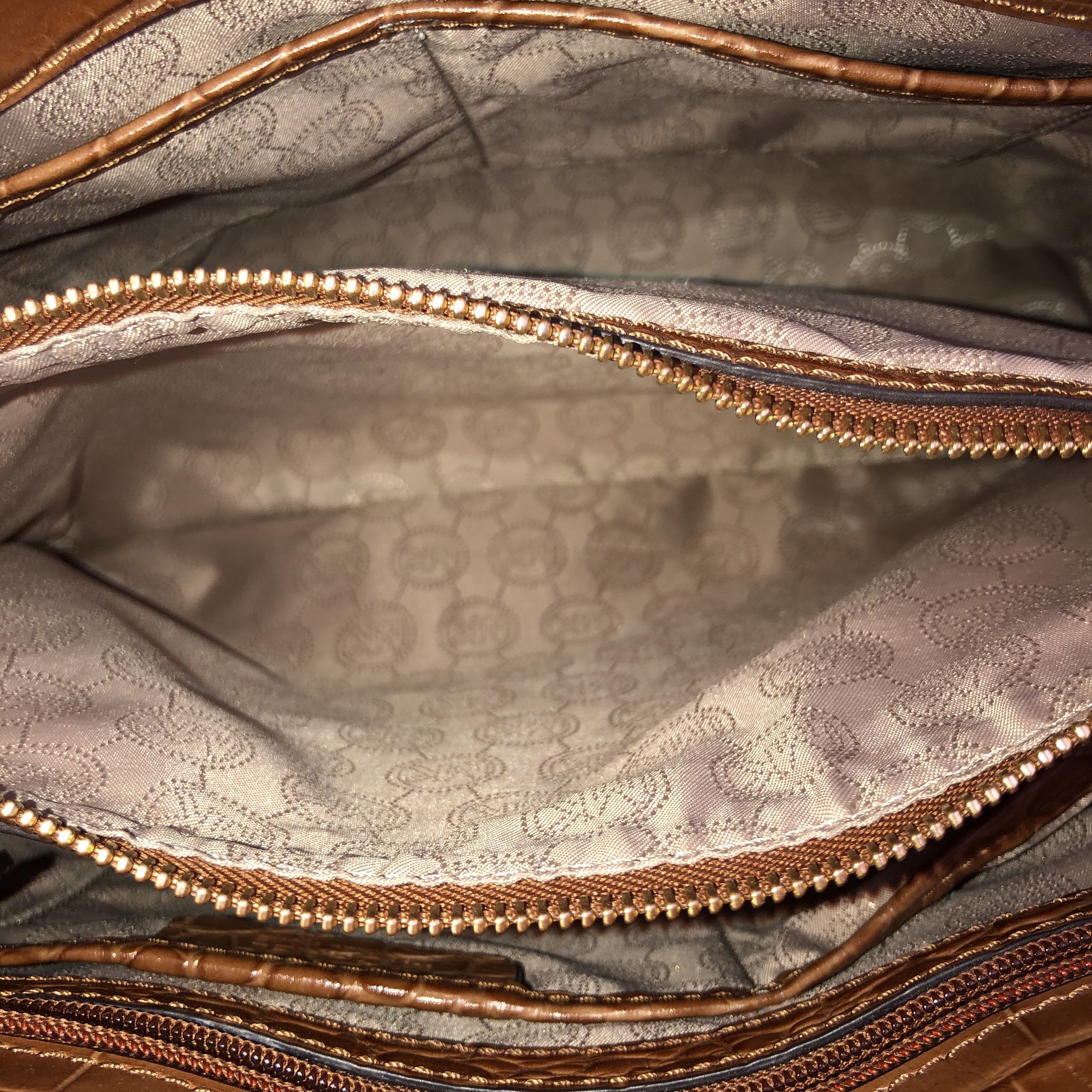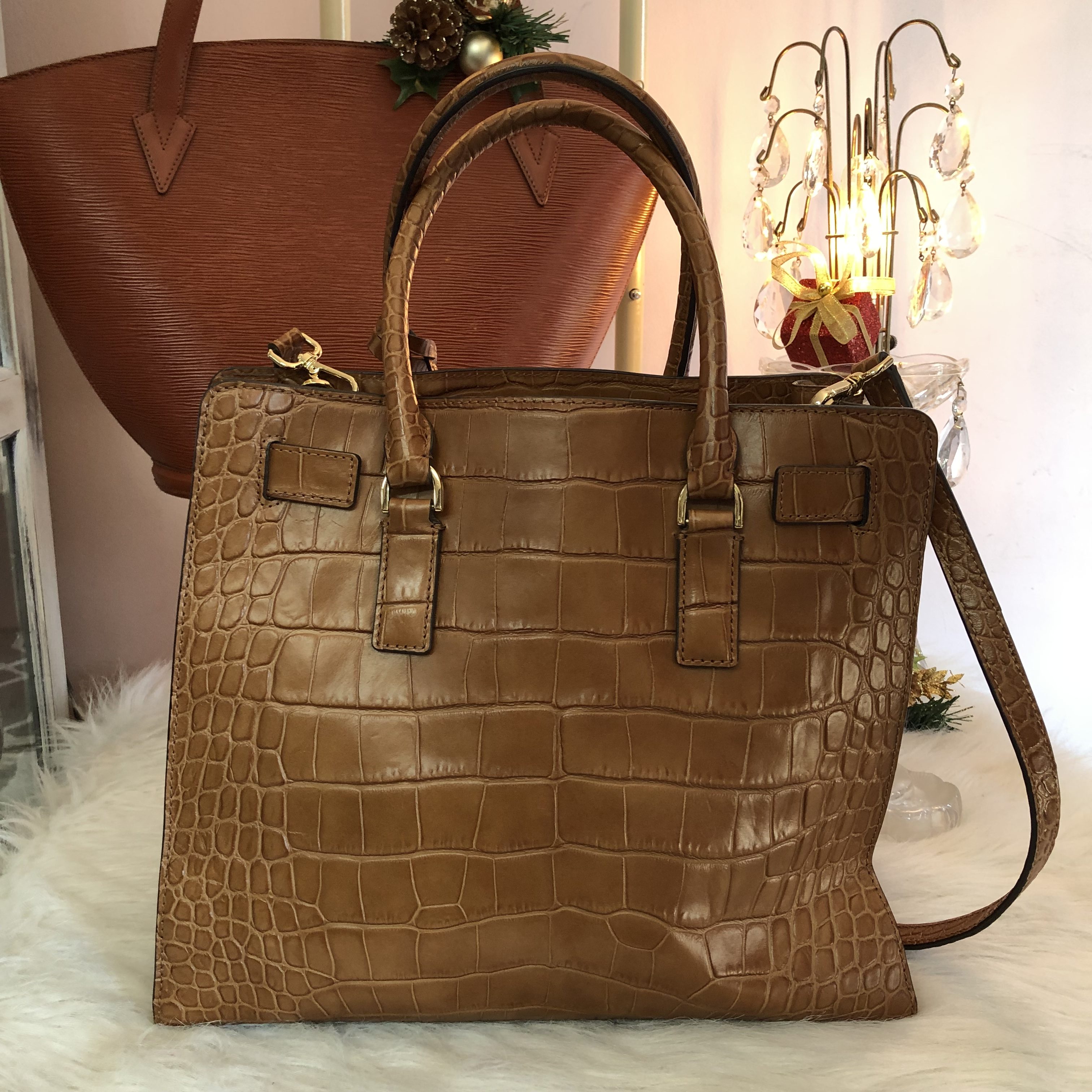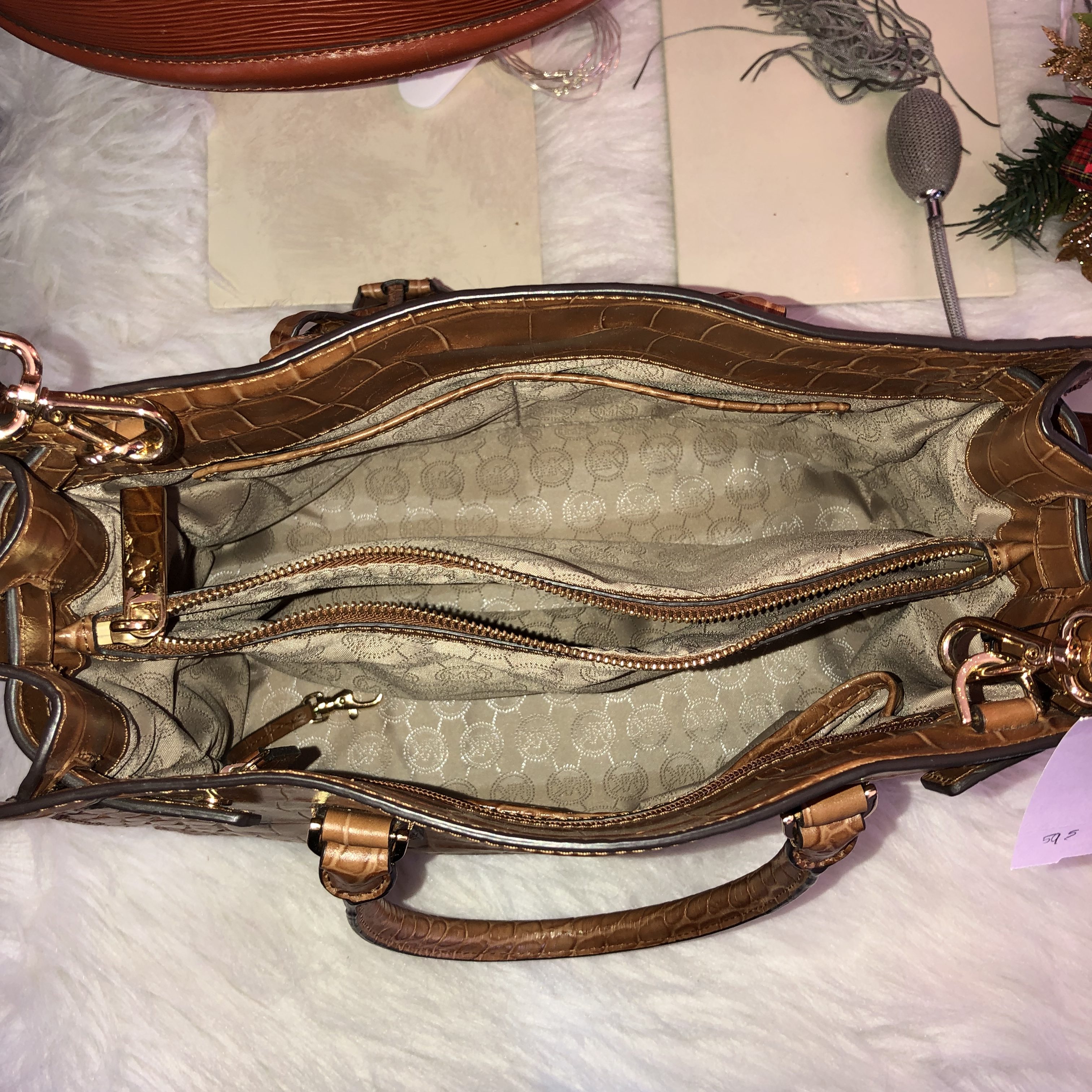 Beautiful Michael Kors Hamilton bag with crocodile 🐊 embossed print in a beautiful walsnuy color. Roomy with plenty of pockets and 1 zippered middle compartment.