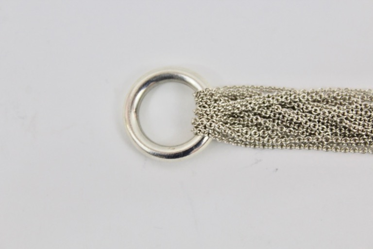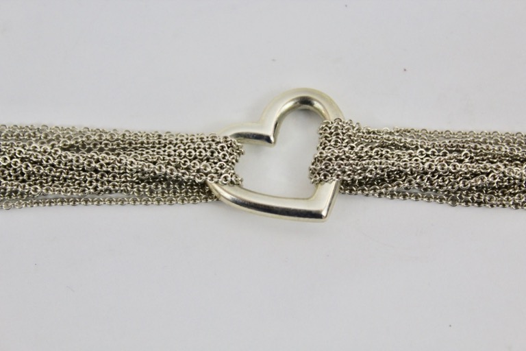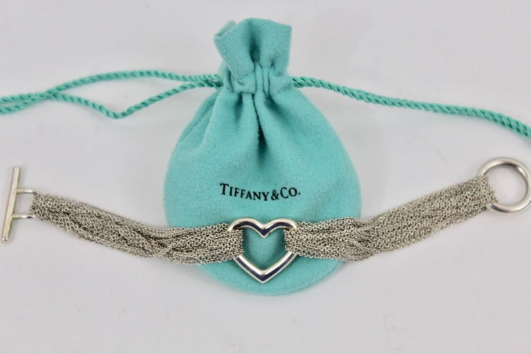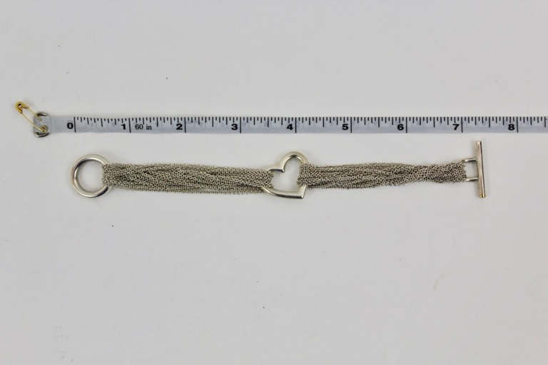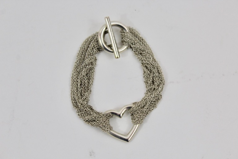 Multi strand sterling silver Tiffany & Co heart mesh bracelet with a toggle closure.