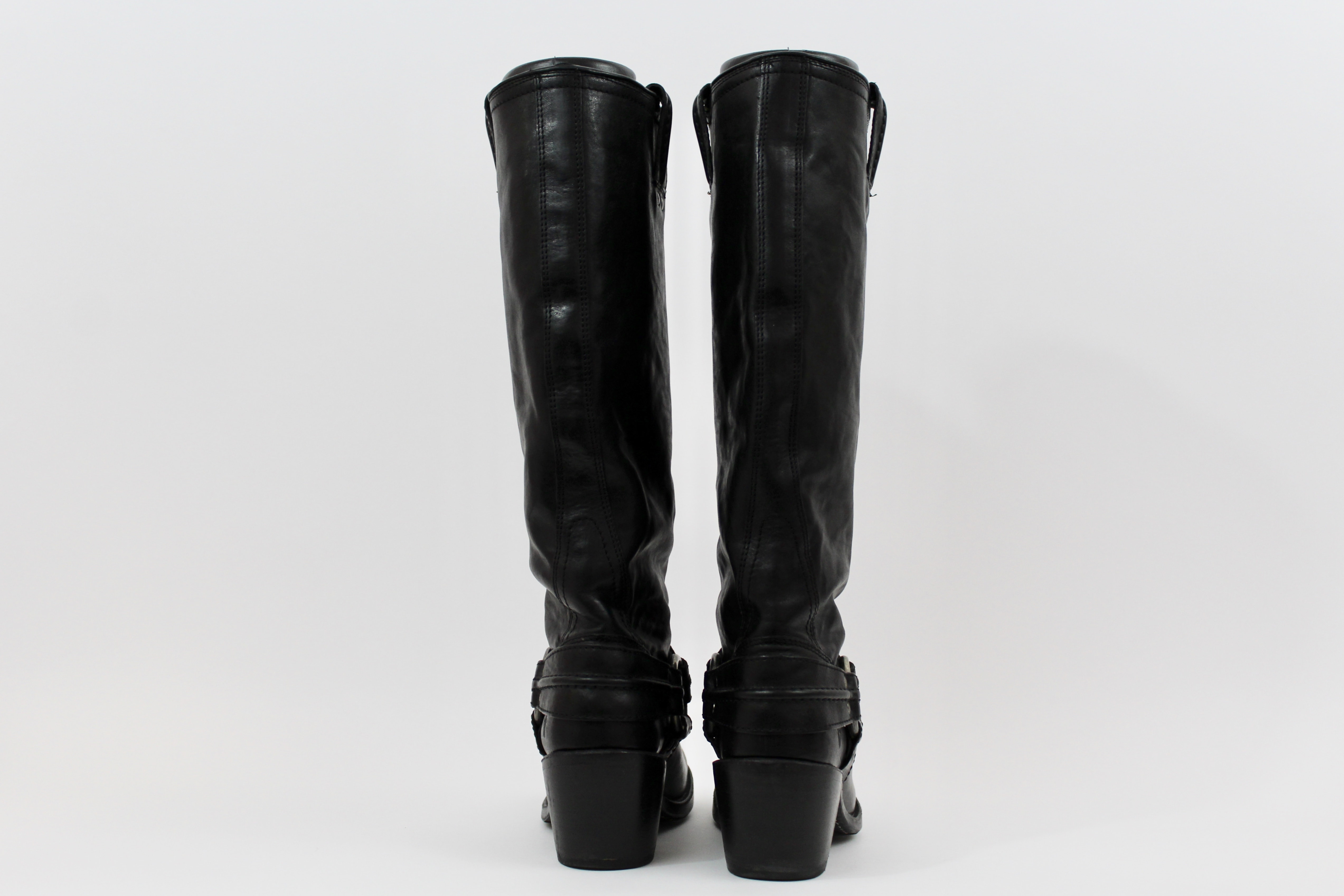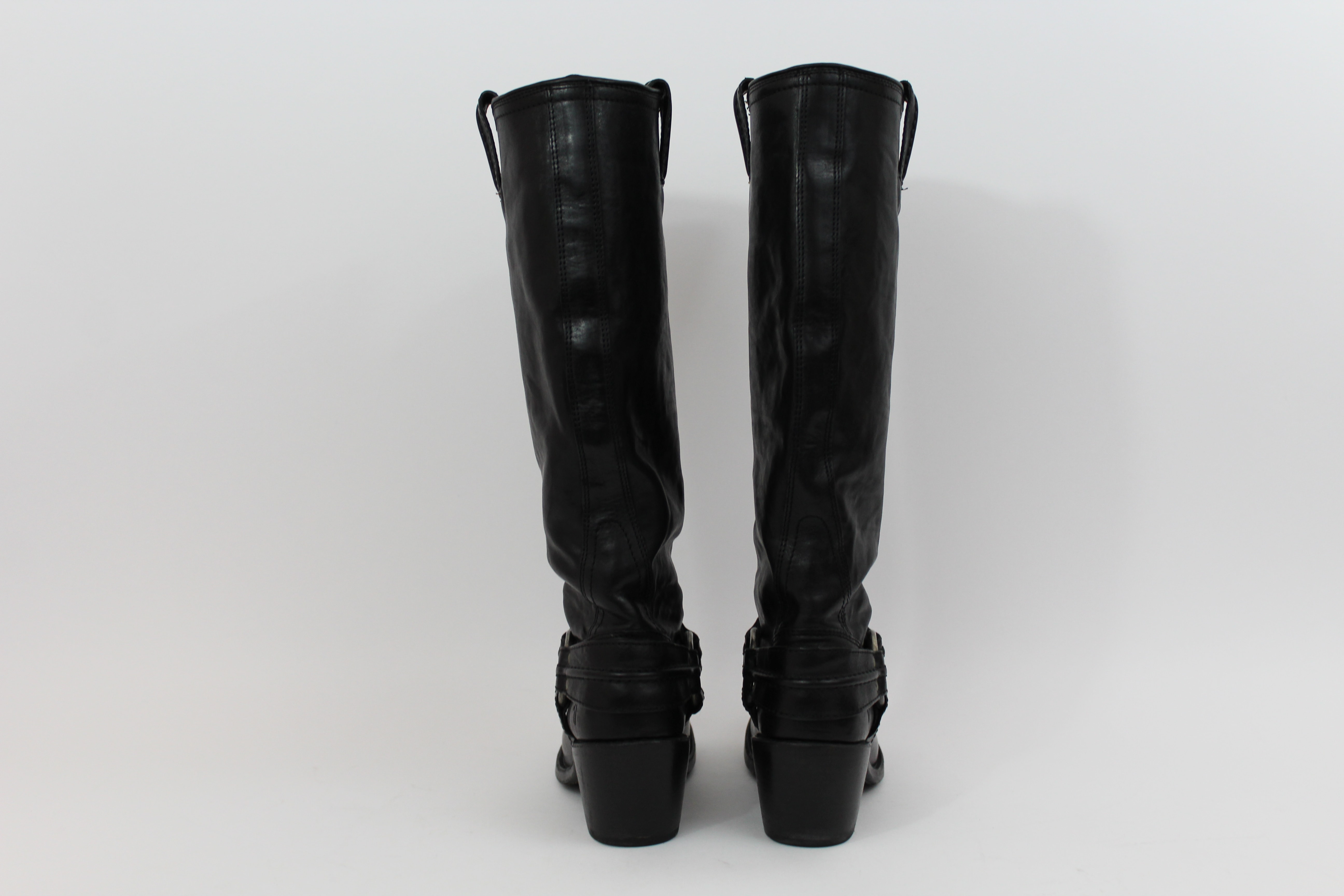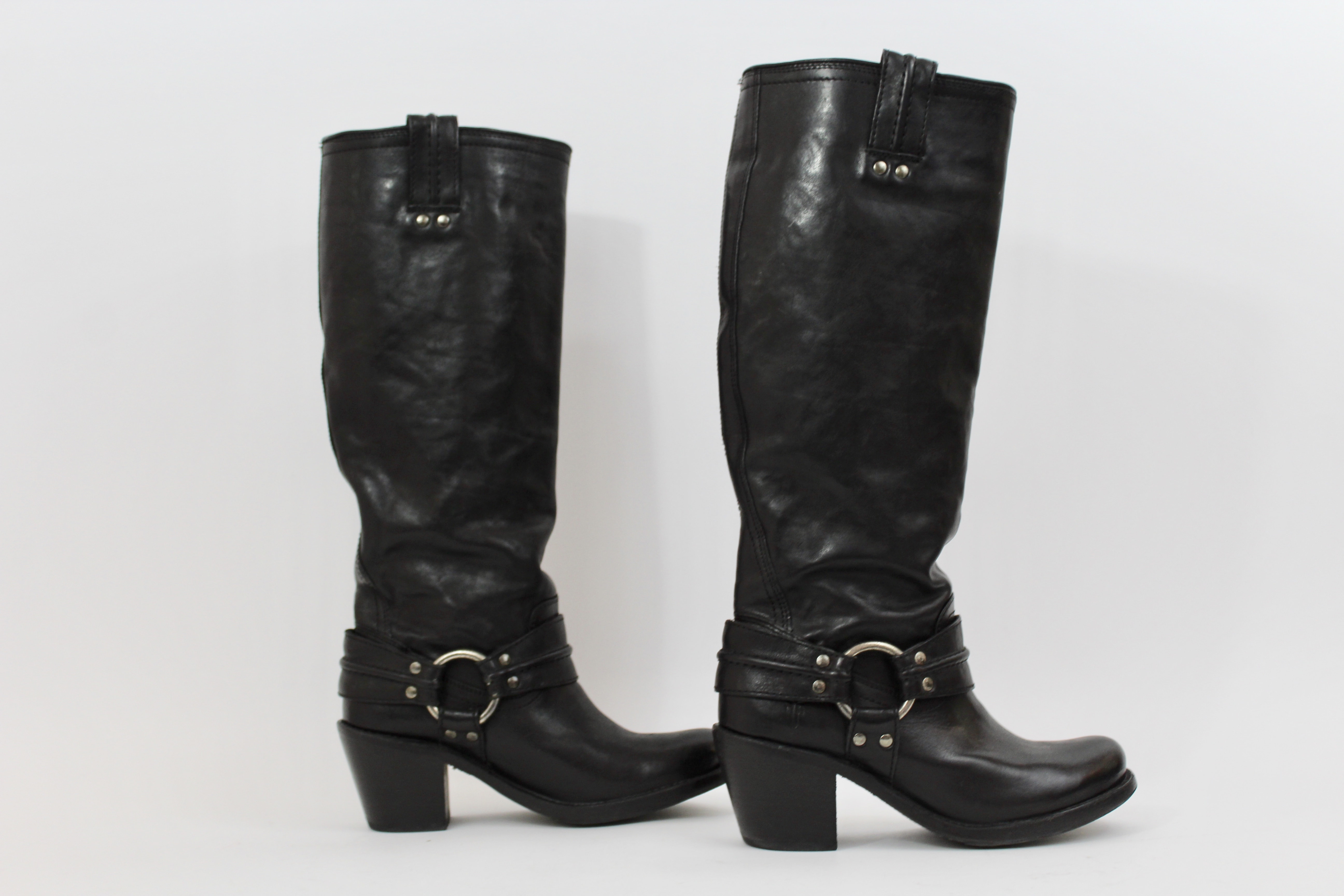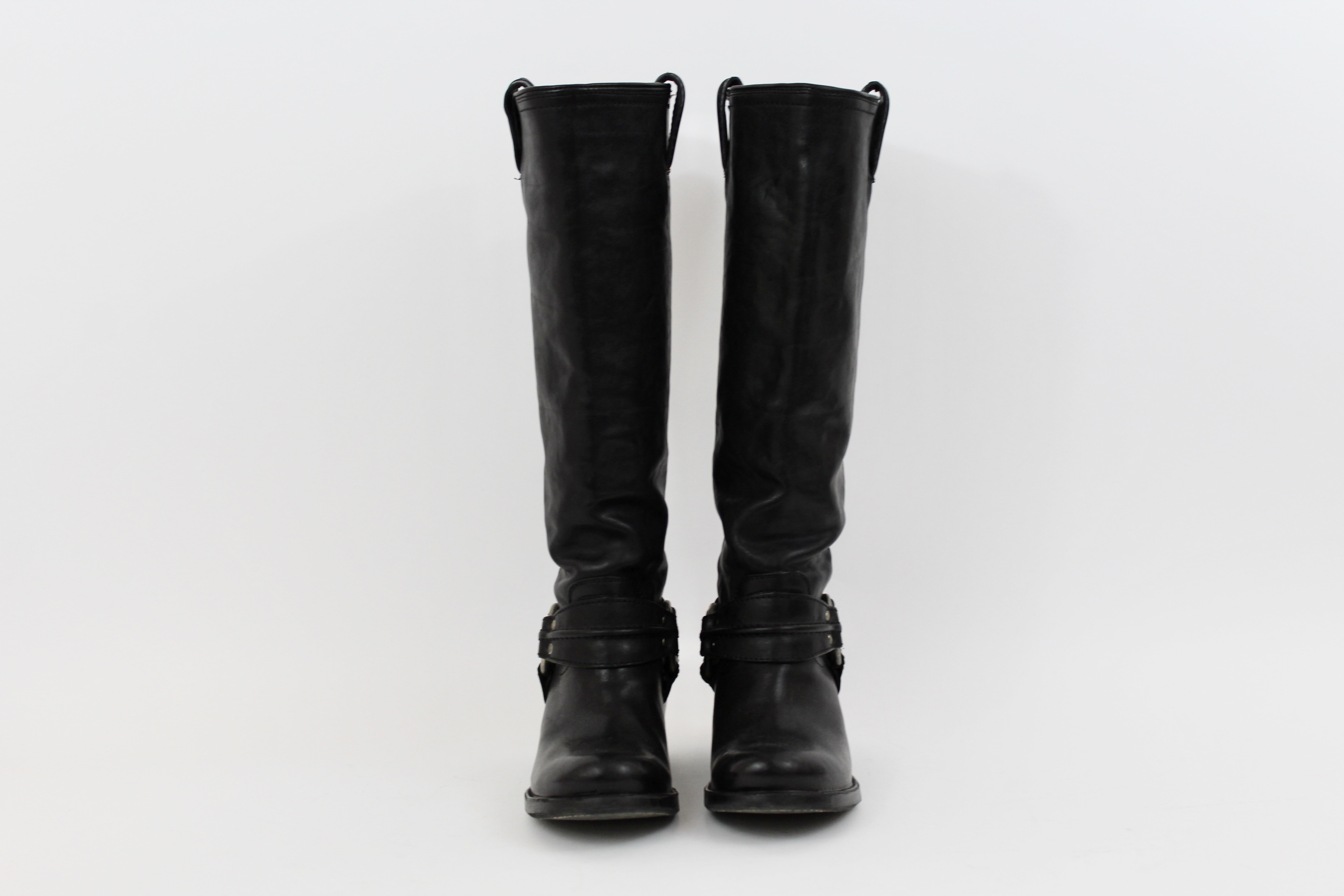 This equestrian-style boot with a stacked heel is handcrafted from rich leather and accented with weathered harness hardware at the side.
