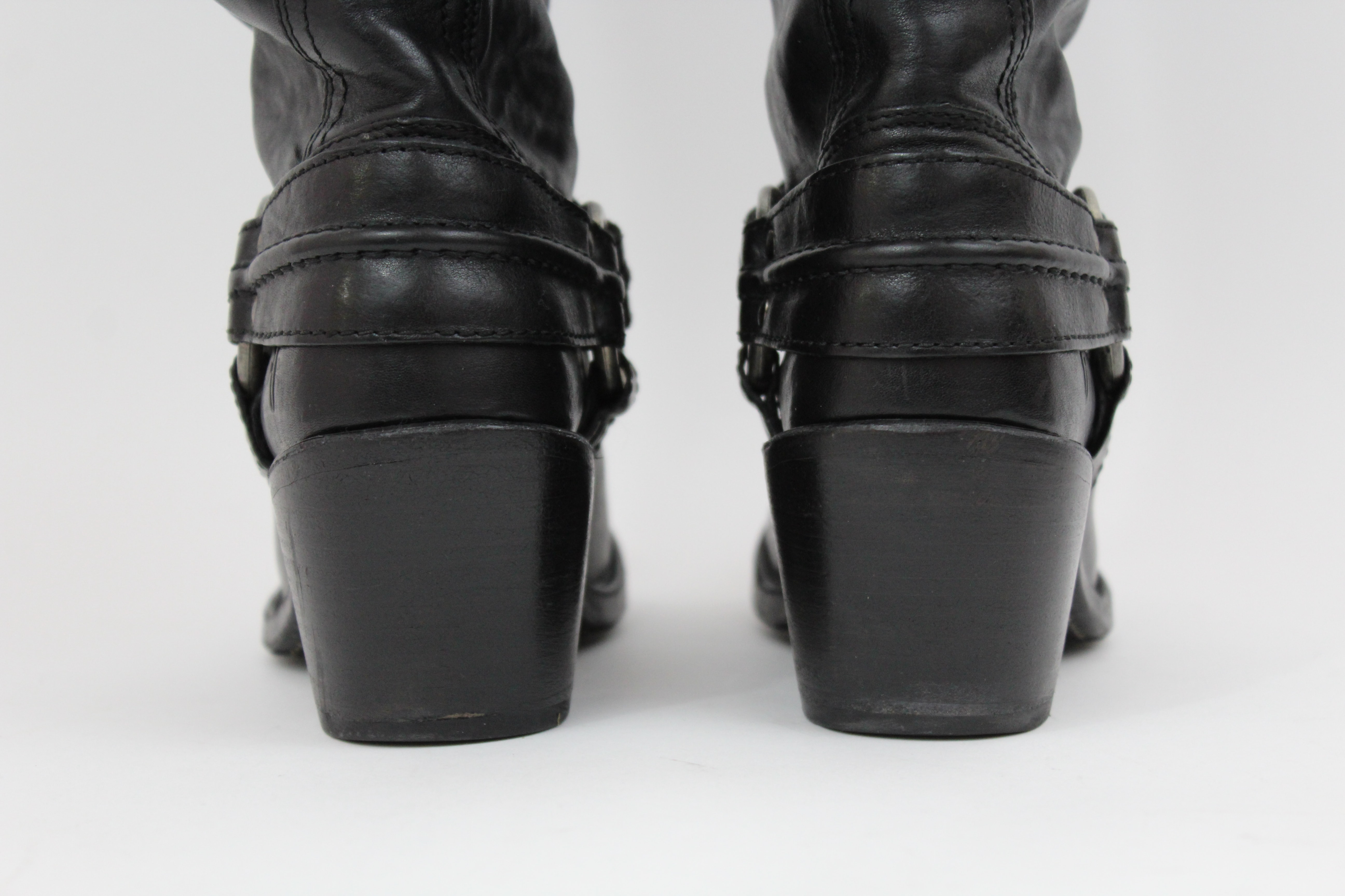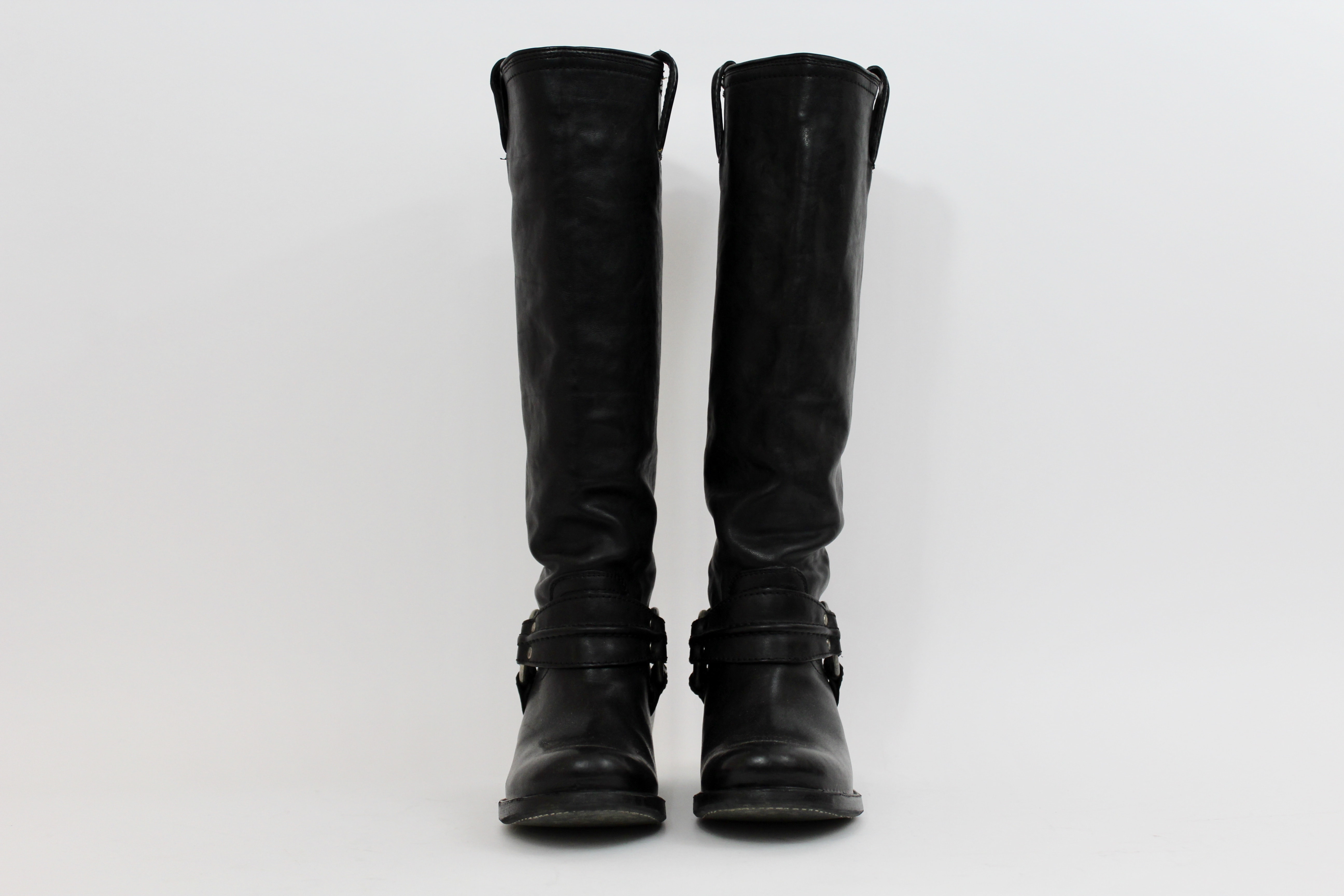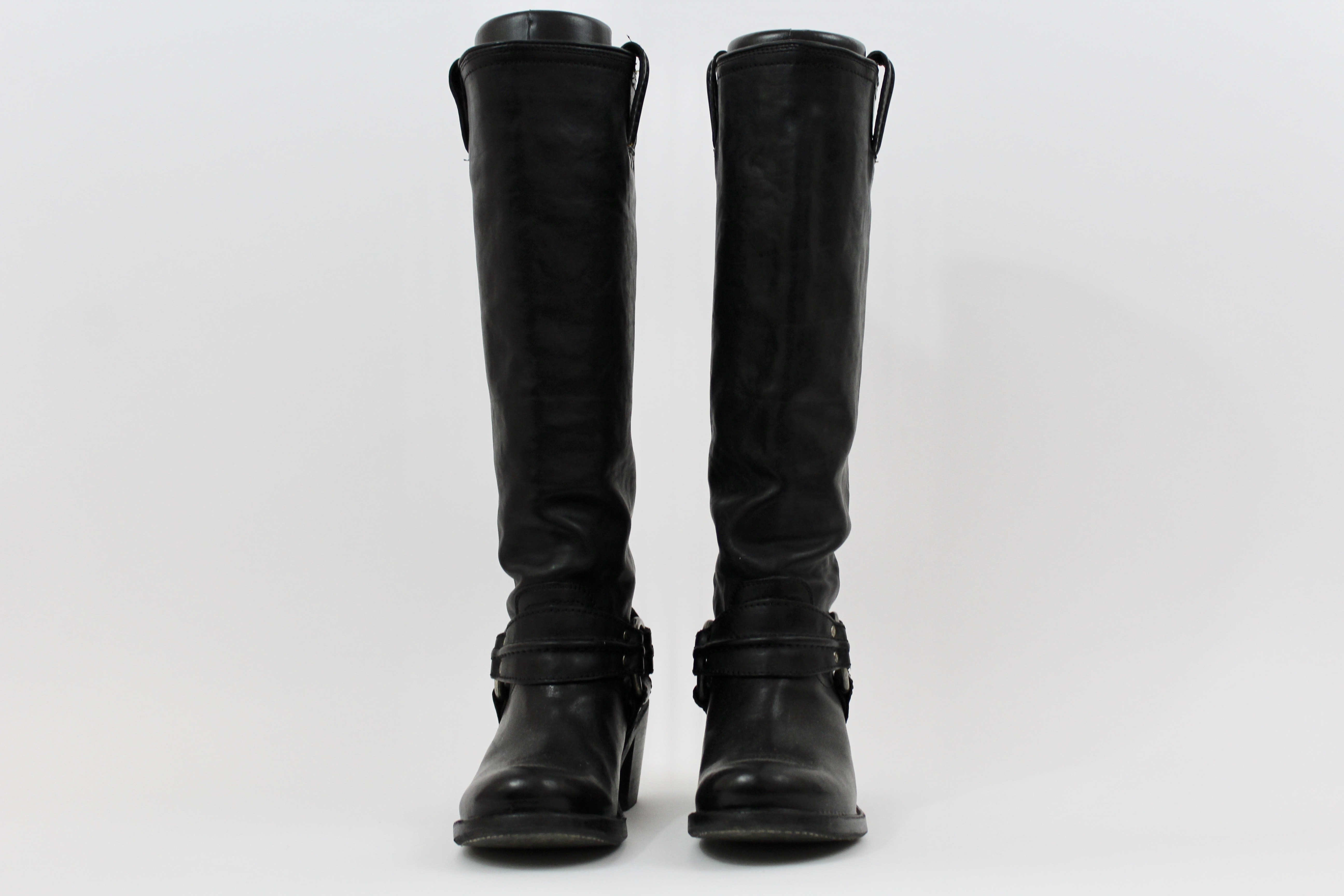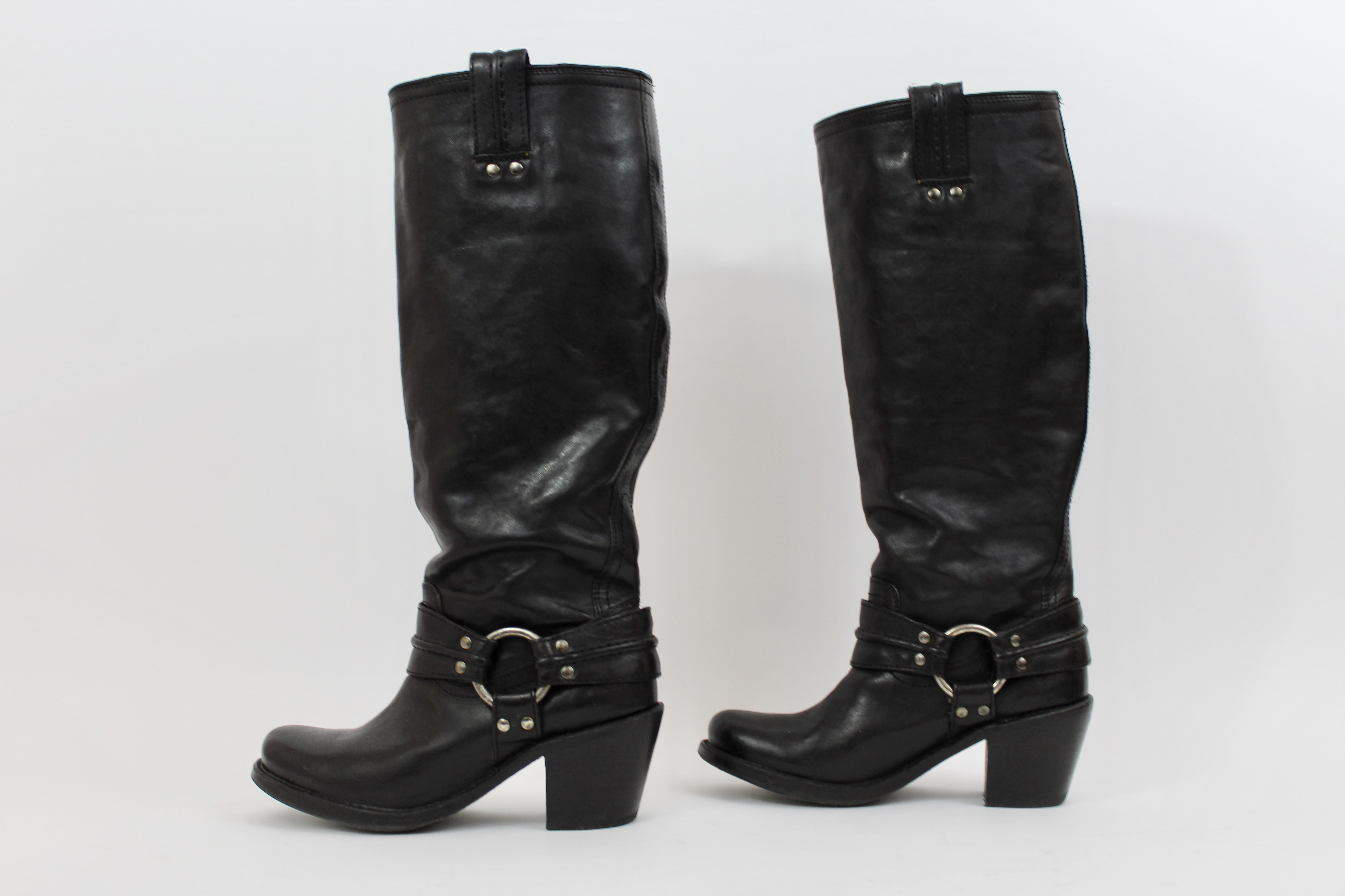 This equestrian-style boot with a stacked heel is handcrafted from rich leather and accented with weathered harness hardware at the side.