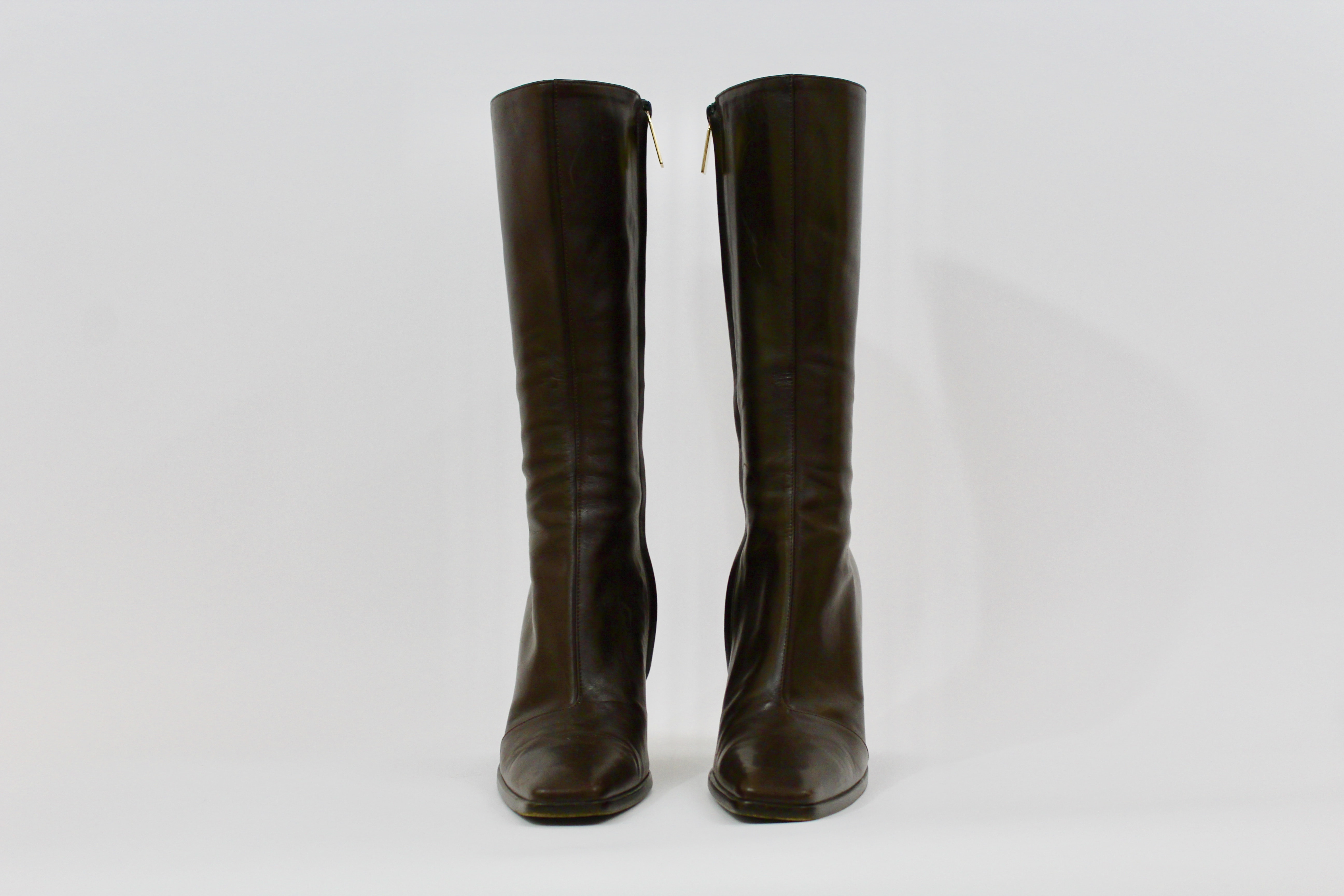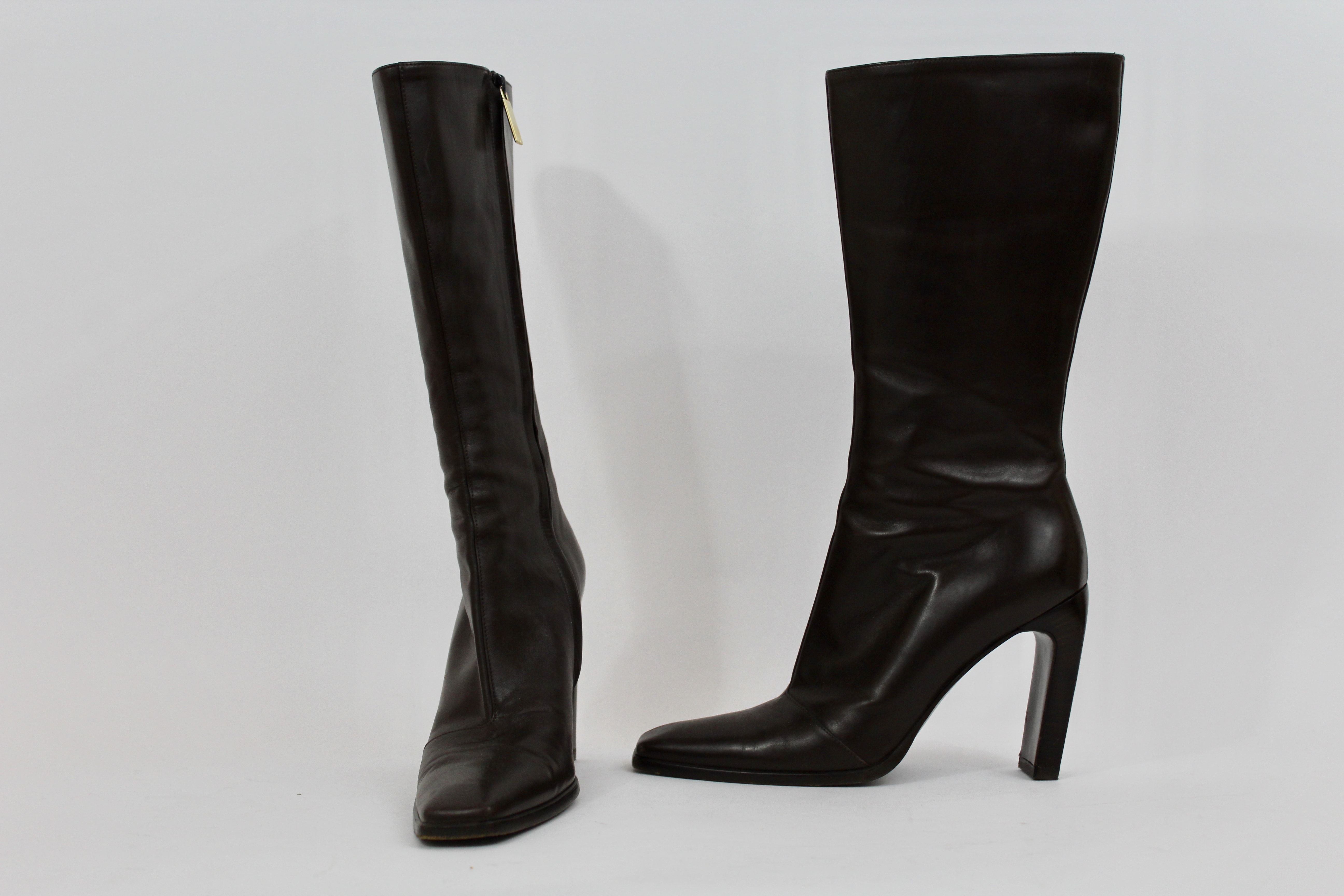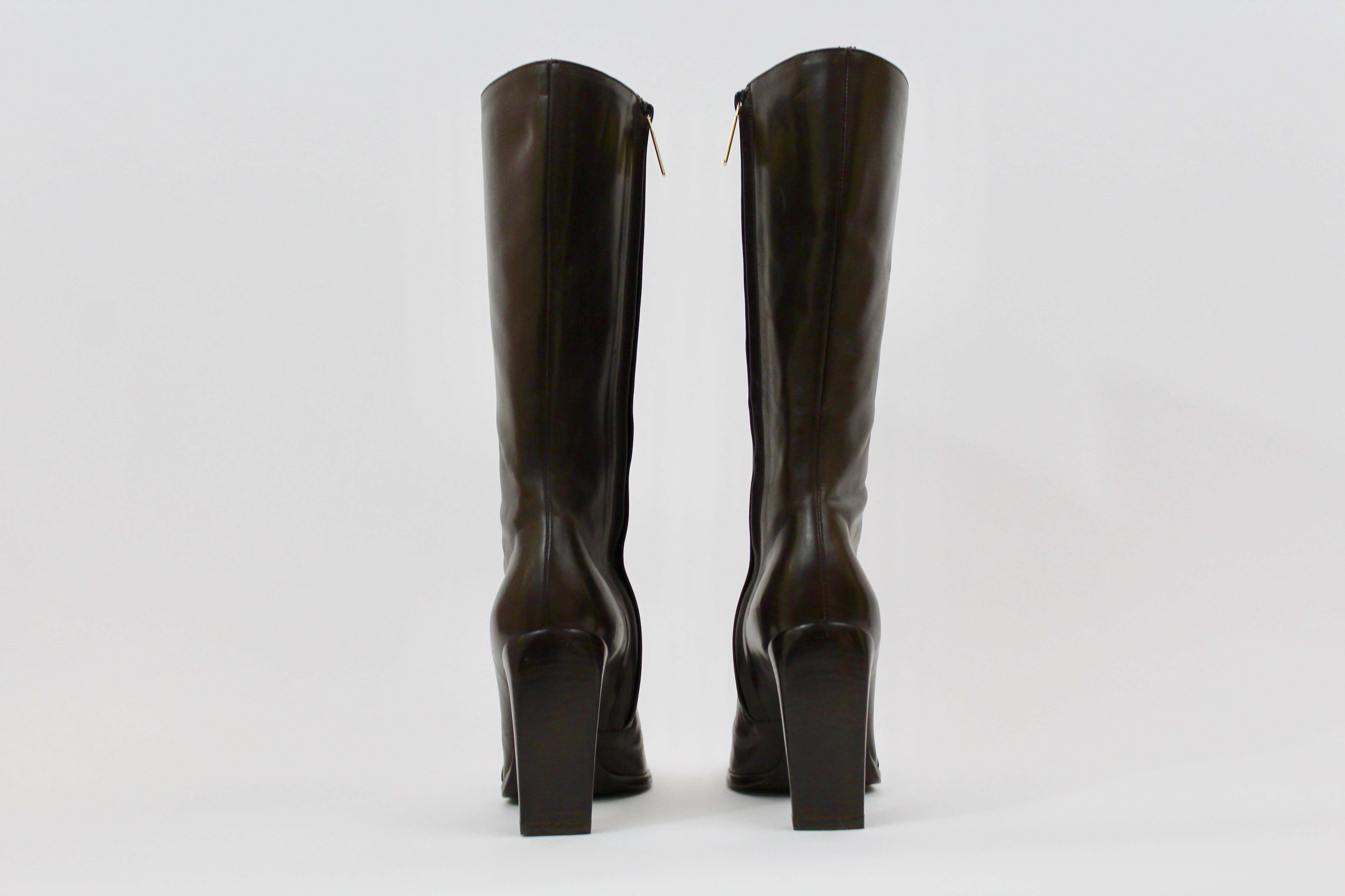 Sophisticated square toe tall Gucci boots in luscious chocolate brown leather with a thinner blocked heel.