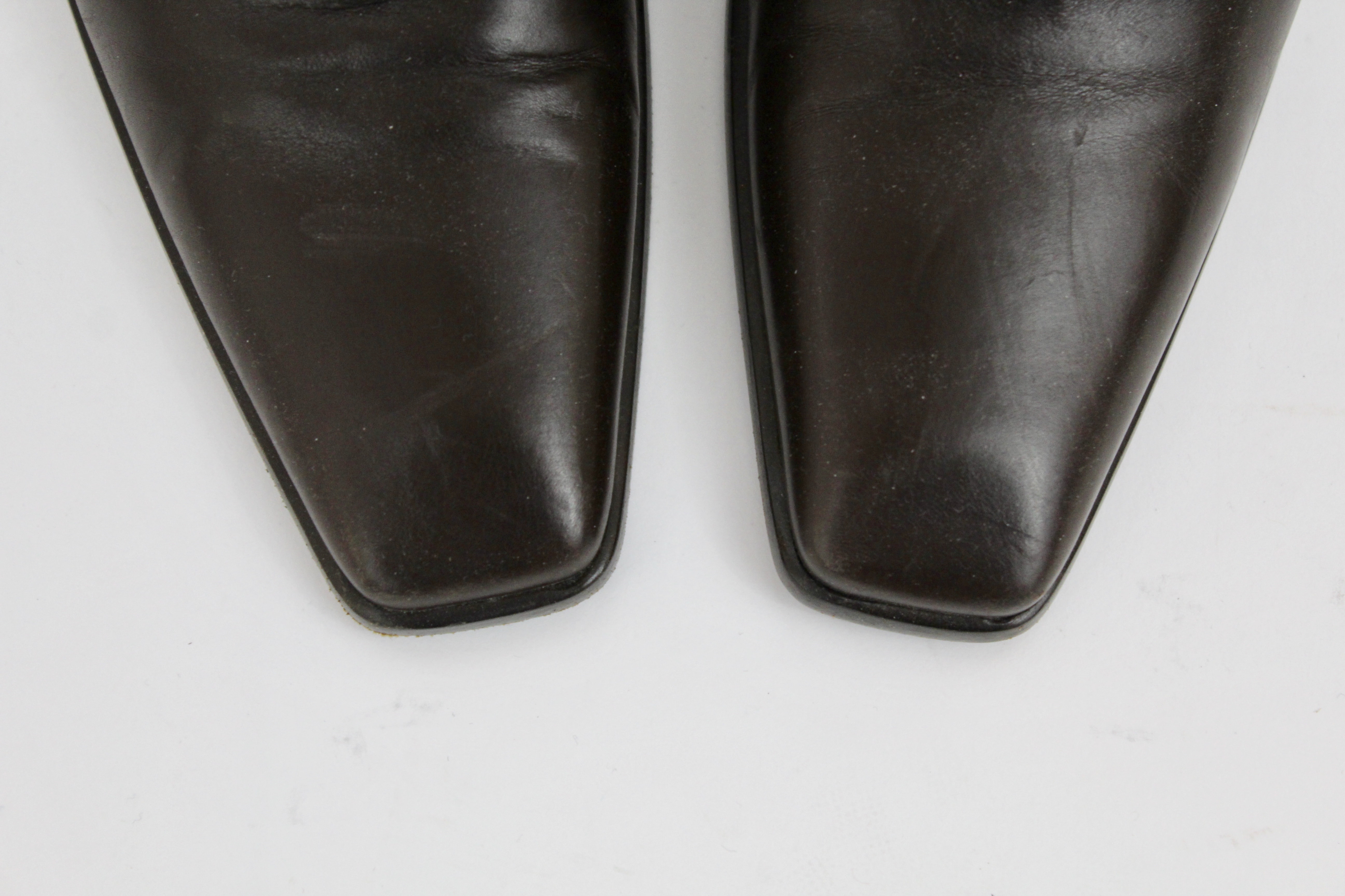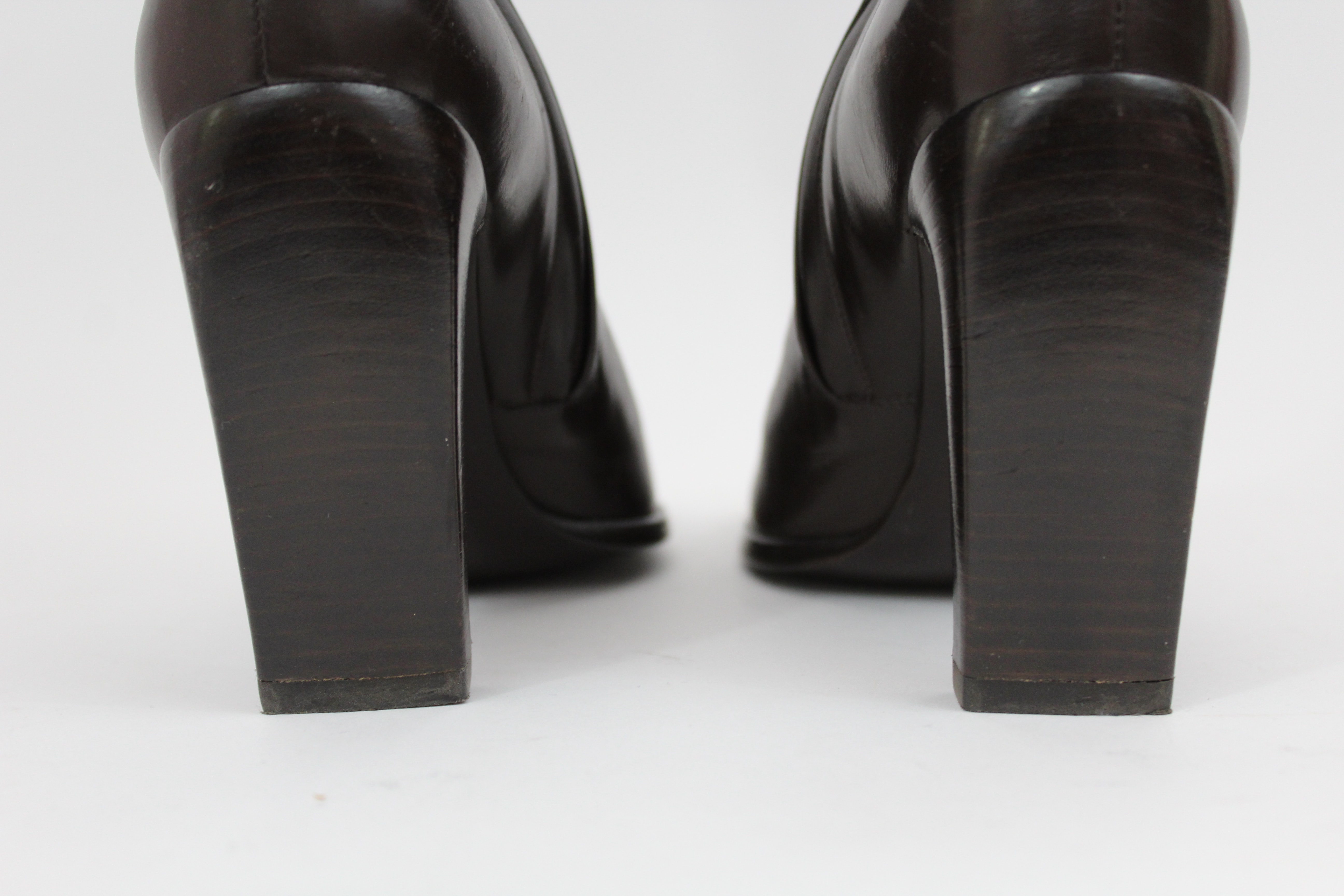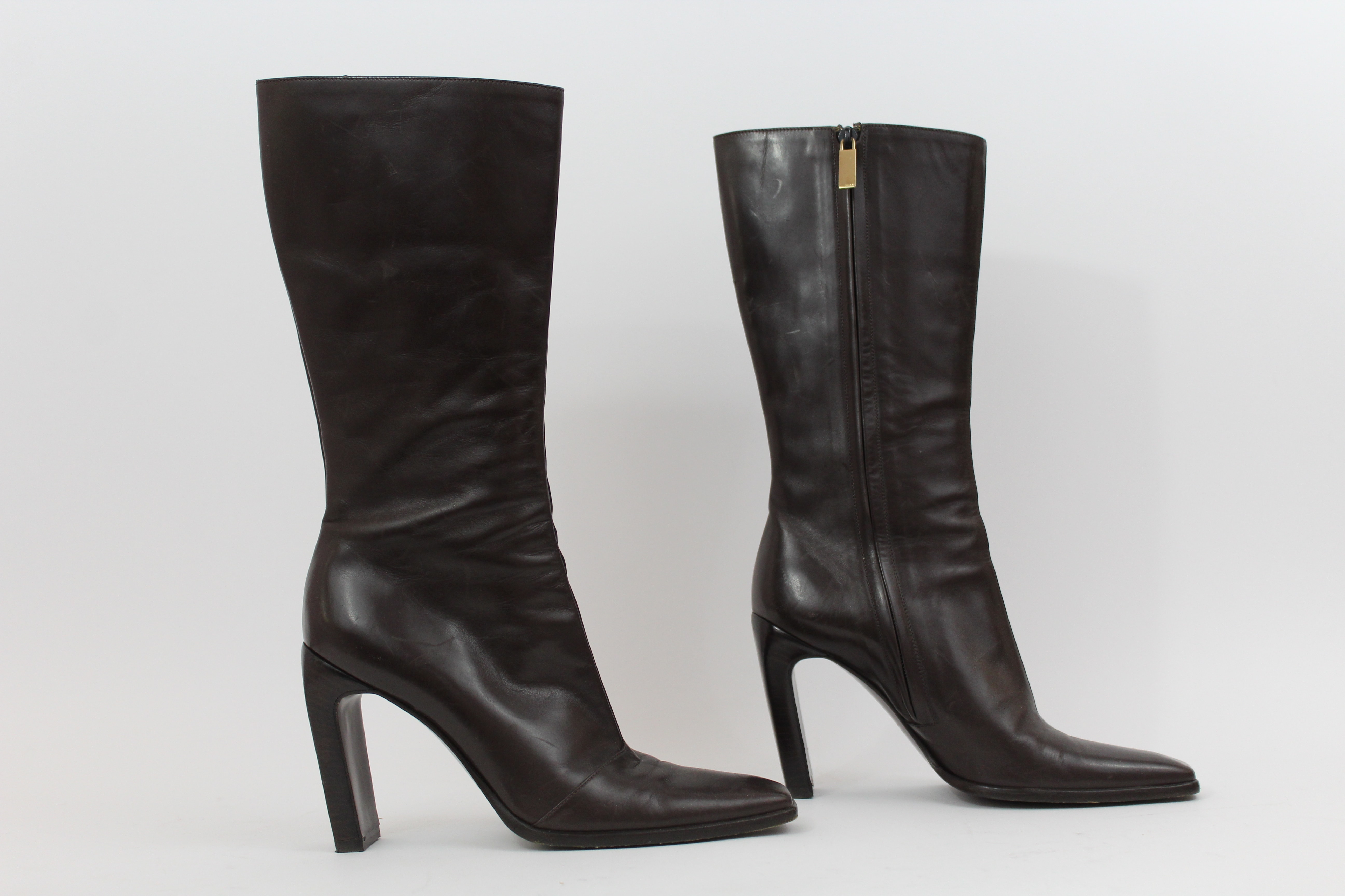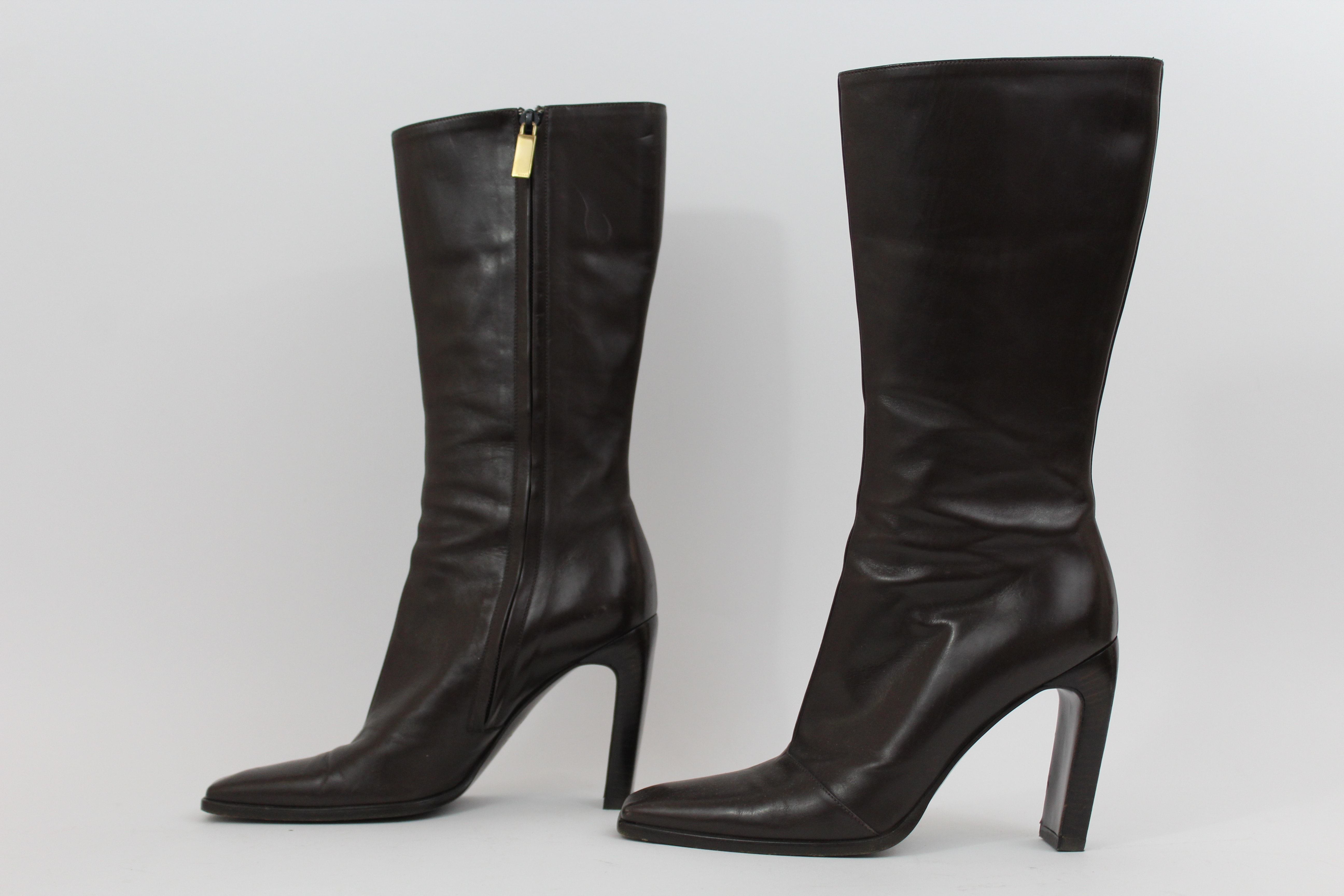 Sophisticated square toe tall Gucci boots in luscious chocolate brown leather with a thinner blocked heel.