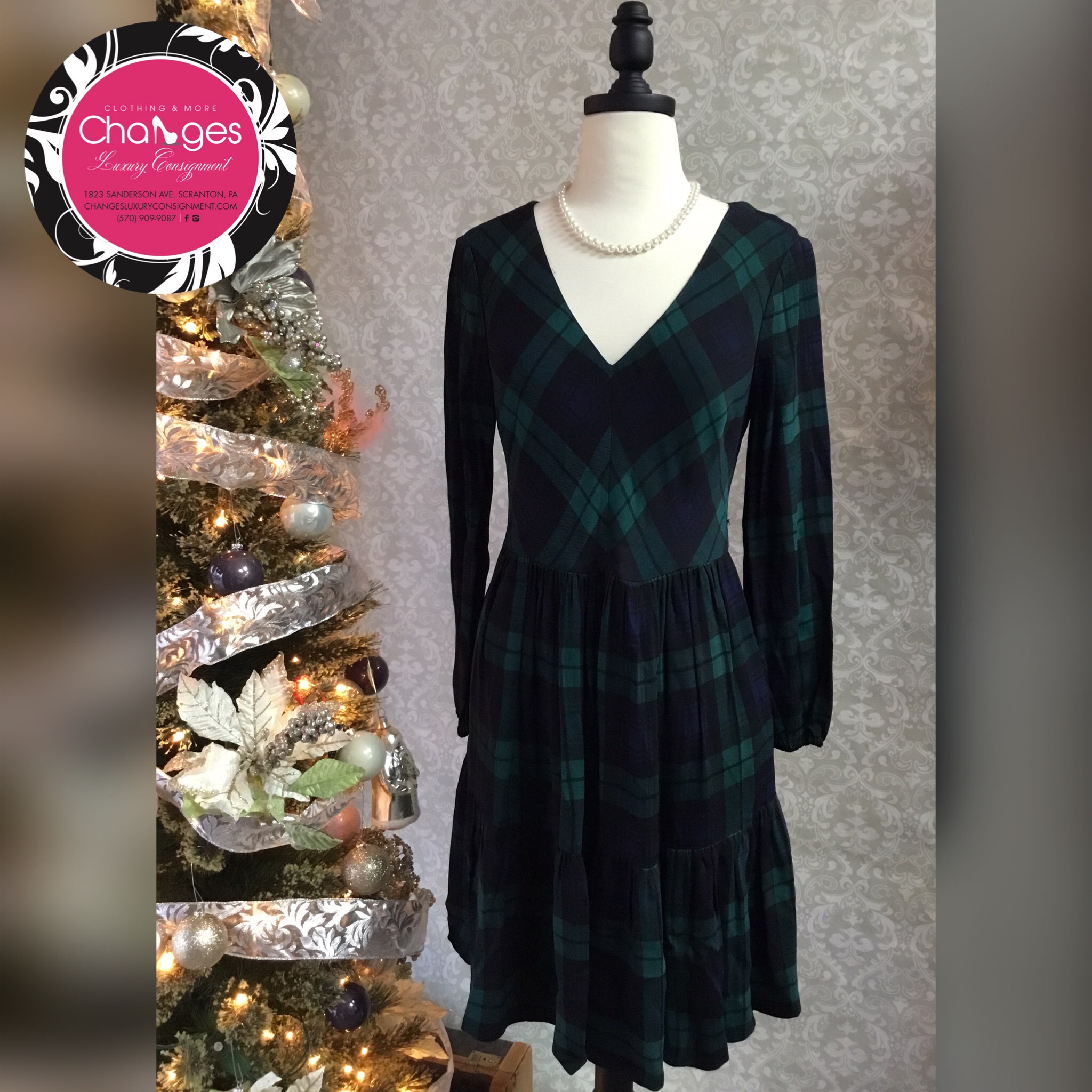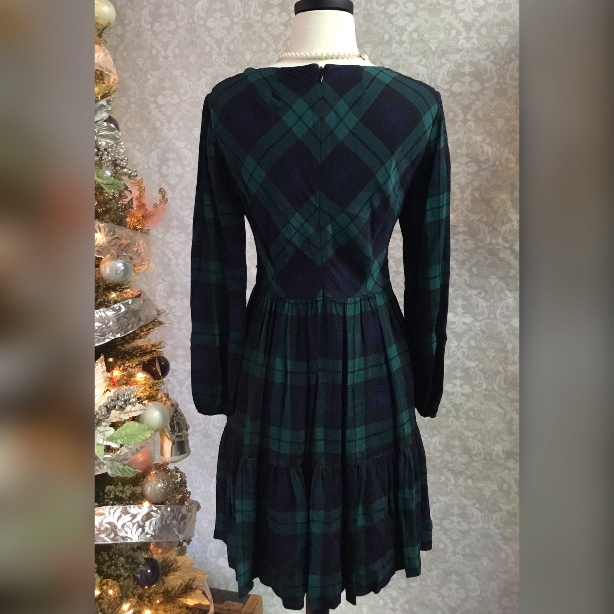 Classic navy and green plaid dress by JCrew! Conservative yet fun with long sleeves and v-neck. Pair with tights and patent MJ’s…😍!