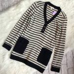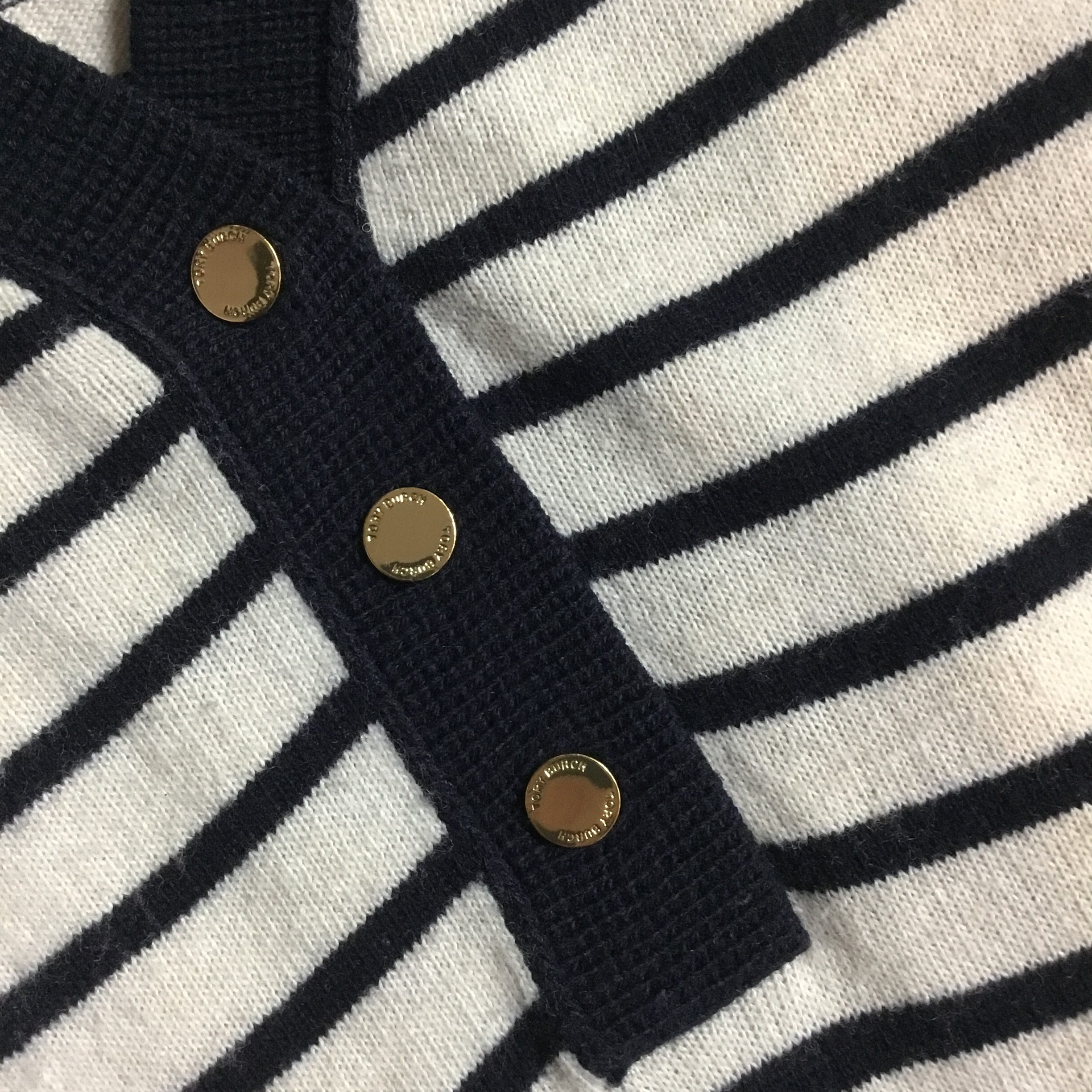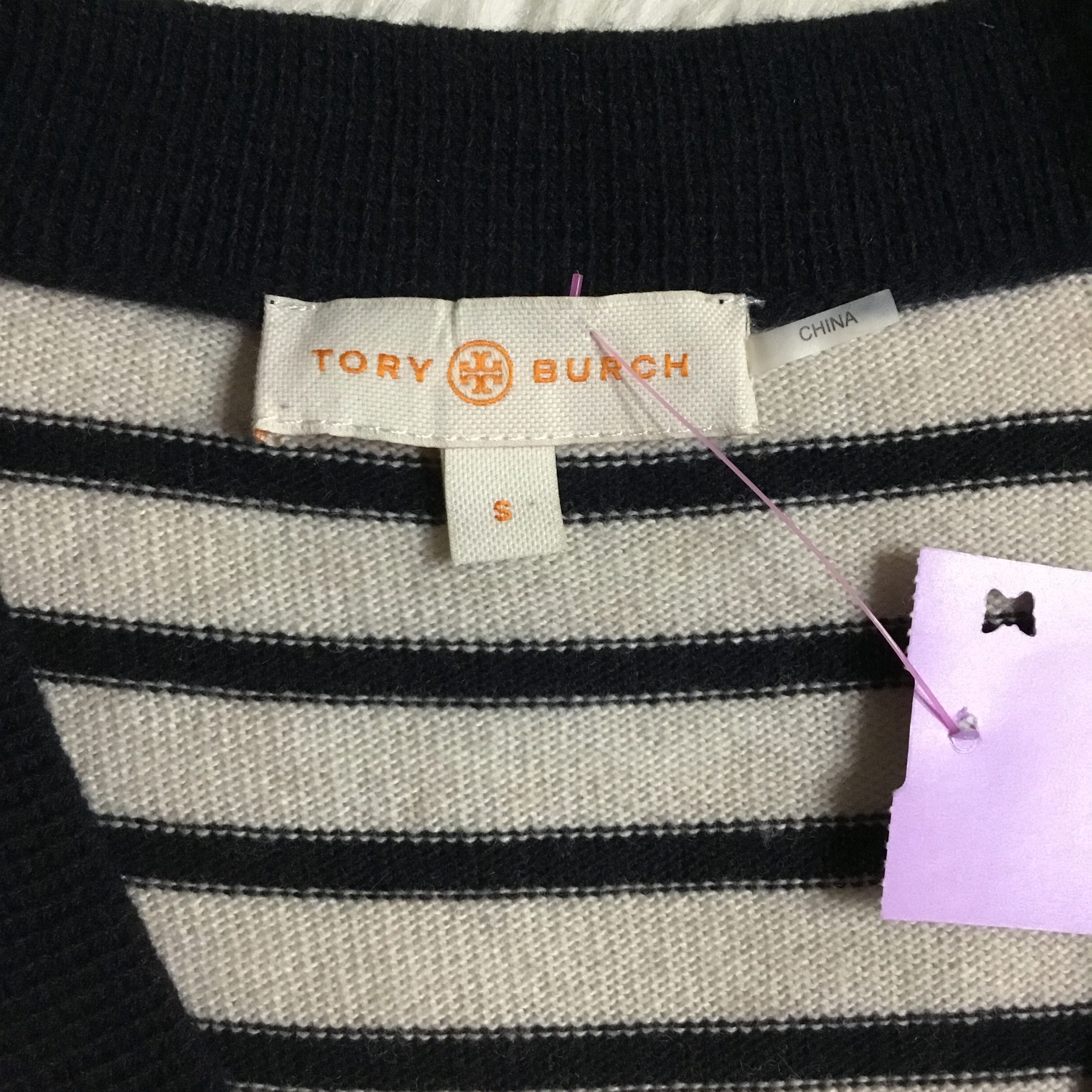 Tory Burch pullover sweater with cream and navy stripes, three gold buttons at the base of the v-neck collar and two handy pockets adorn the front. Perfect sweater with legging and boots.